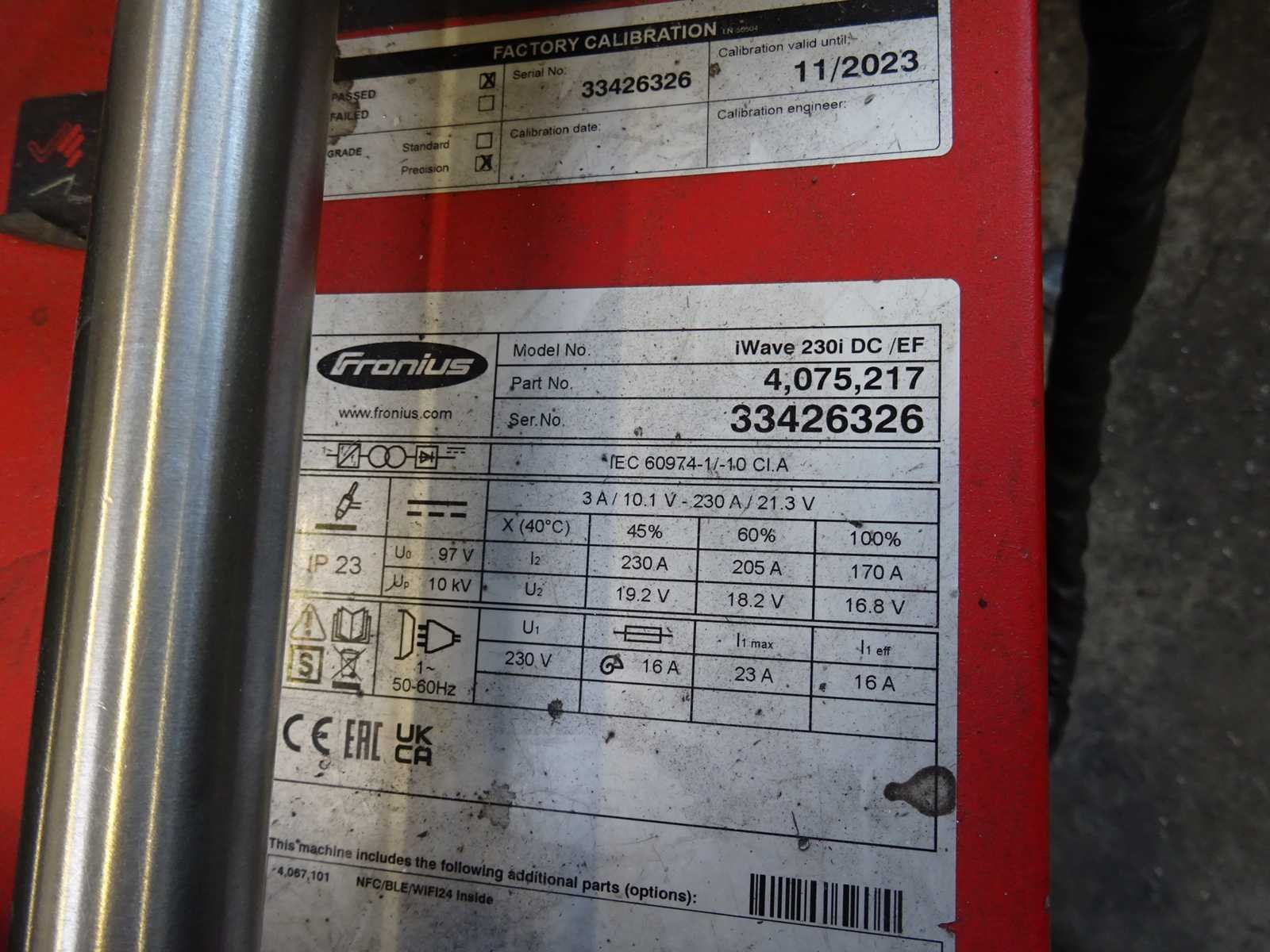 Exclusief gasfles Merk: Fronius Type: iWave 230i DC/EF Serienummer: 33426326 Aansluiting: 230V