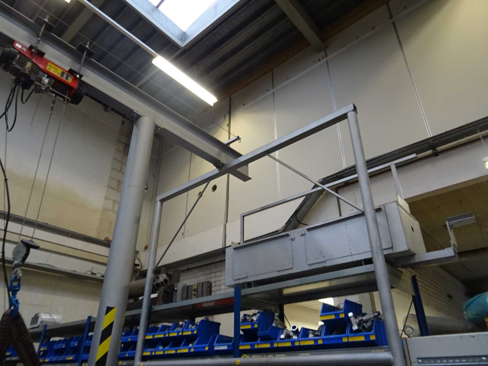 Testopstelling inclusief 2 x elektrische takel (gekeurd tot 01-2026), zit gebout aan grond, bouten dienen te worden afgeslepen. Inclusief bovenligger a ca 500 cm