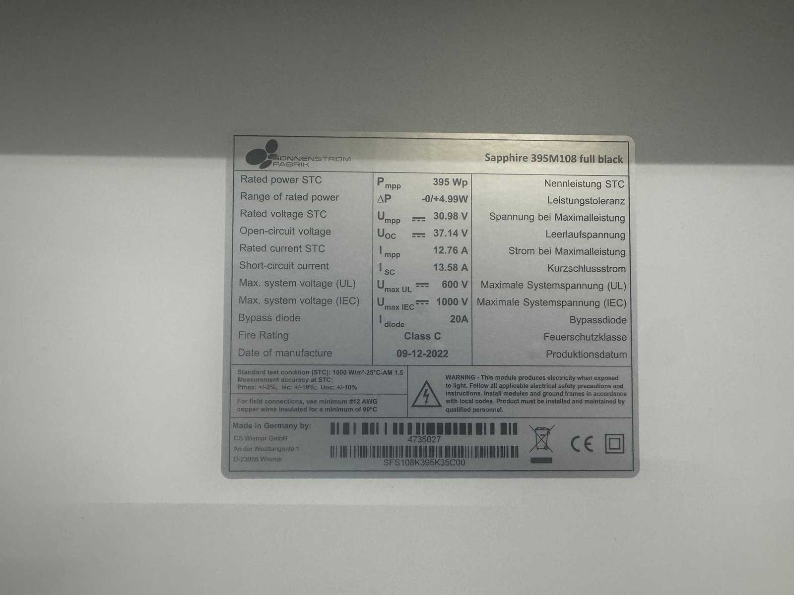 Set van 10 zonnepanelen (395 wp) met Solax Boost 3k omvormer (1-fase) 3 kW omvormer: Solax omvormer, Solax Boost 3k totaal vermogen: 3.950 Wp vermogen: 395 Wp per zonnepaneel herkomst: made in Germany conditie: nieuw Merk: Sonnenstromfabrik Type: Sapphire 395M108 Max. dc power: 395W Eigen gewicht: 23kg Totale afmeting L: 1555mm Totale afmeting Breedte: 1145mm Totale afmeting Hoogte: 35mm
