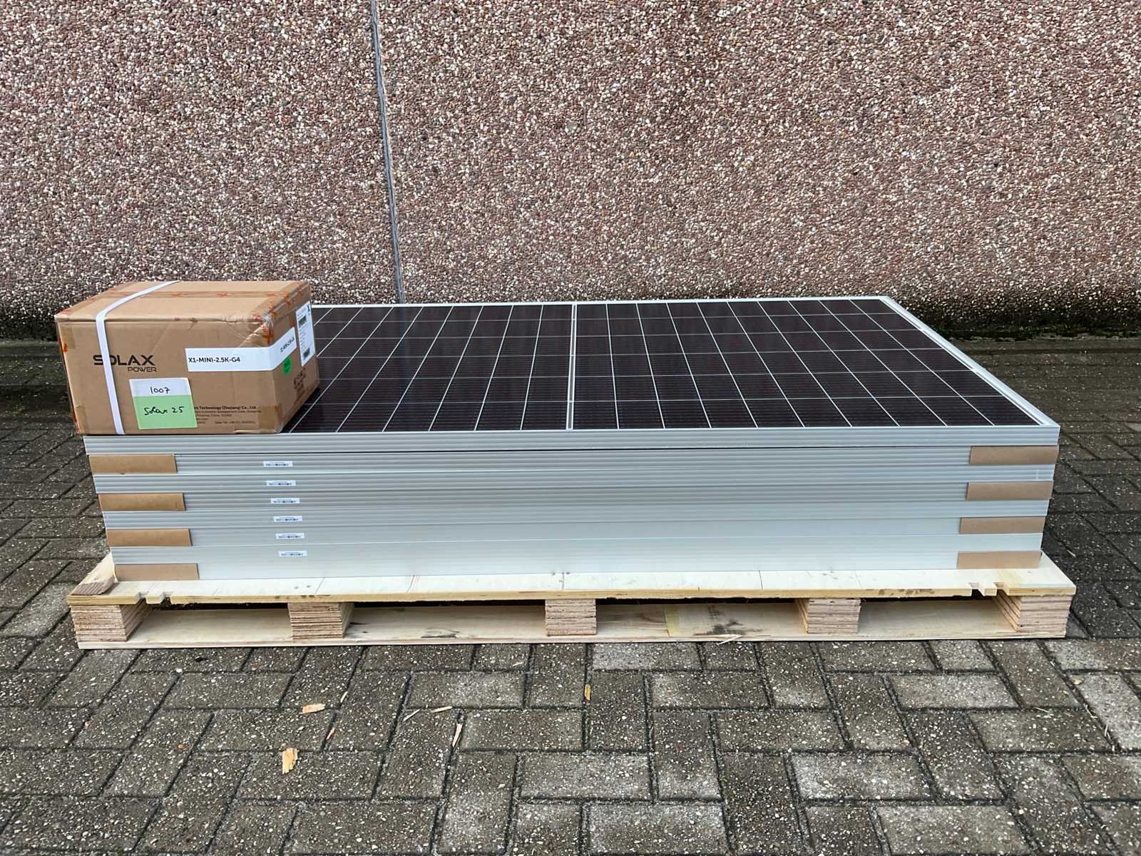 Set van 8 zonnepanelen (340 wp) Solax 2.5 omvormer Totaal vermogen: 2720 wp conditie: nieuw Merk: JA Solar Max. dc power: 340W Totale afmeting L: 1690mm Totale afmeting Breedte: 1000mm Totale afmeting Hoogte: 35mm