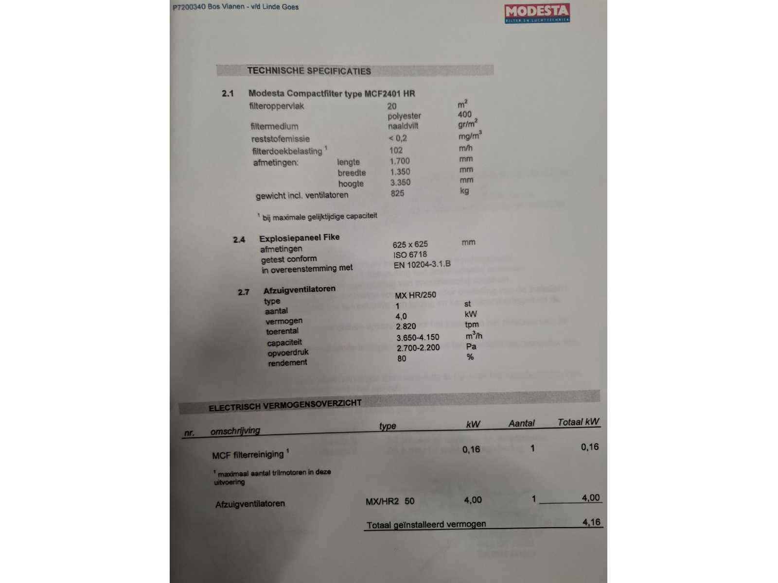 Diameter: 250mm, filteroppervlak: 20m2, capaciteit: 4.000m3/uur, 4,16 kW, voorzien van 2 tonnen verrijdbaar. Merk: Modesta Type: MCF2401 Bouwjaar: 2007 Serienummer: P7200340 Gewicht: 1500kg Aansluiting: 400V Afmeting l: 1700mm Afmeting b: 1350mm Afmeting h: 3350mm