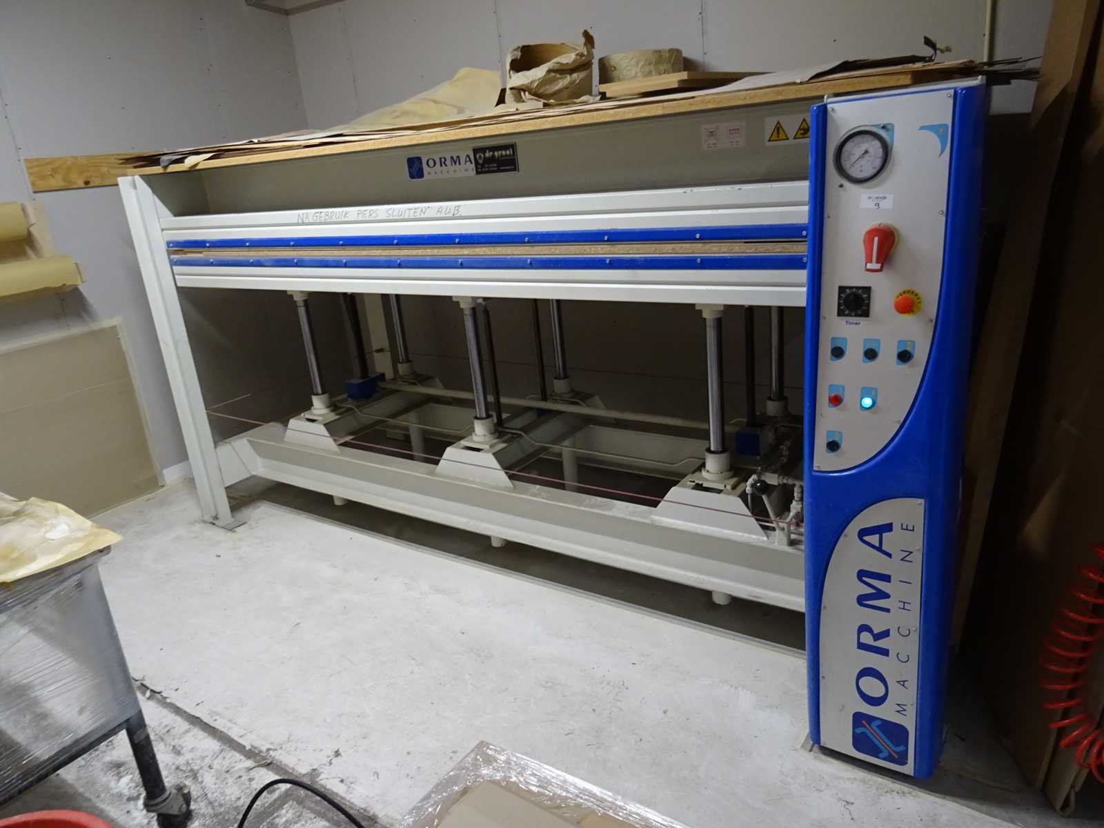 Slag: 500mm Merk: Orma Type: S/6 Bouwjaar: 2011 Serienummer: E3580110 Max. formaat l: 3100mm Max. formaat b: 1300mm Perskracht: 30kN Aantal cilinders: 6 Aansluiting: 400V Machinegewicht: 1480kg Afmeting l: 3600mm Afmeting b: 1600mm Afmeting h: 1800mm