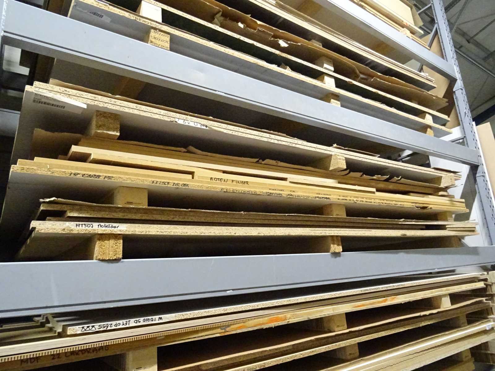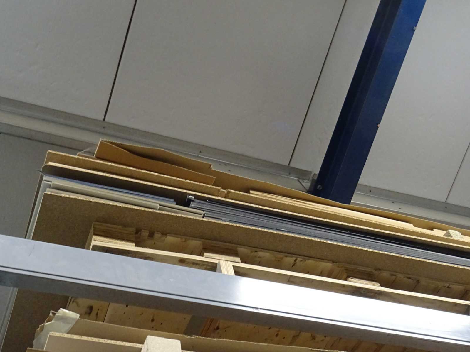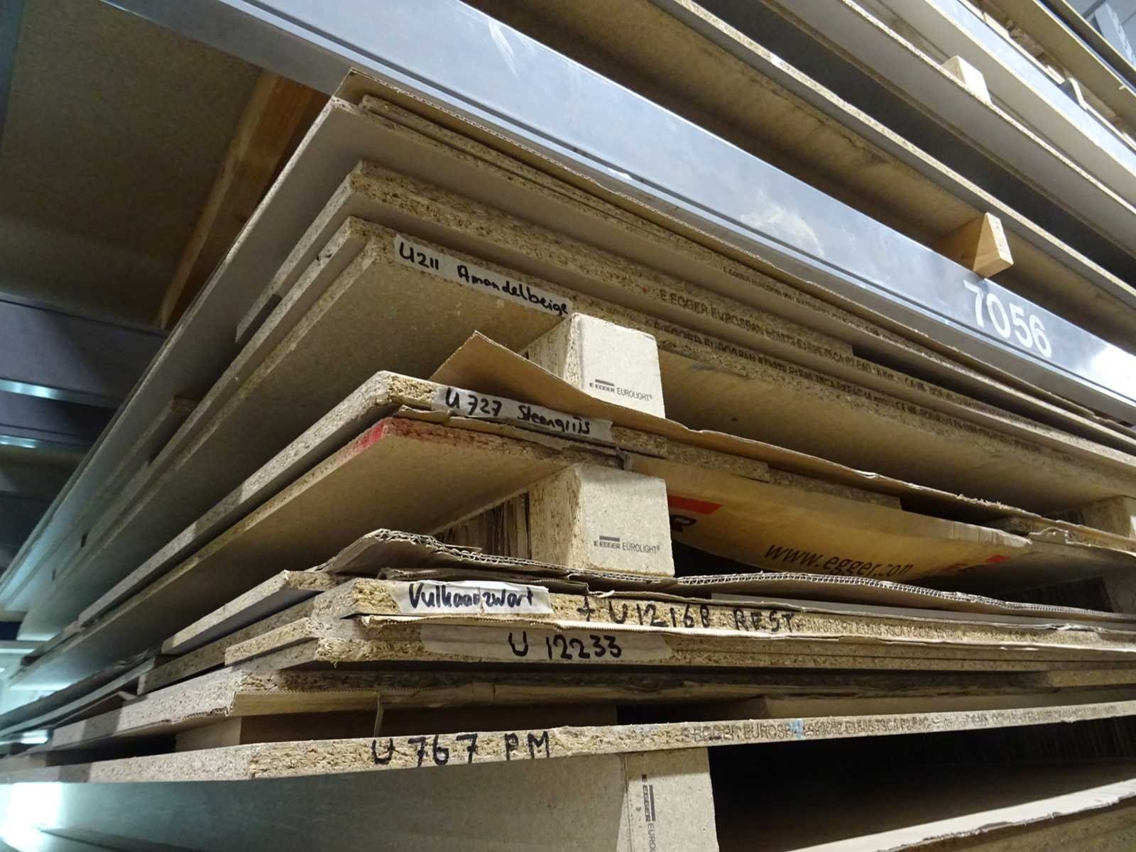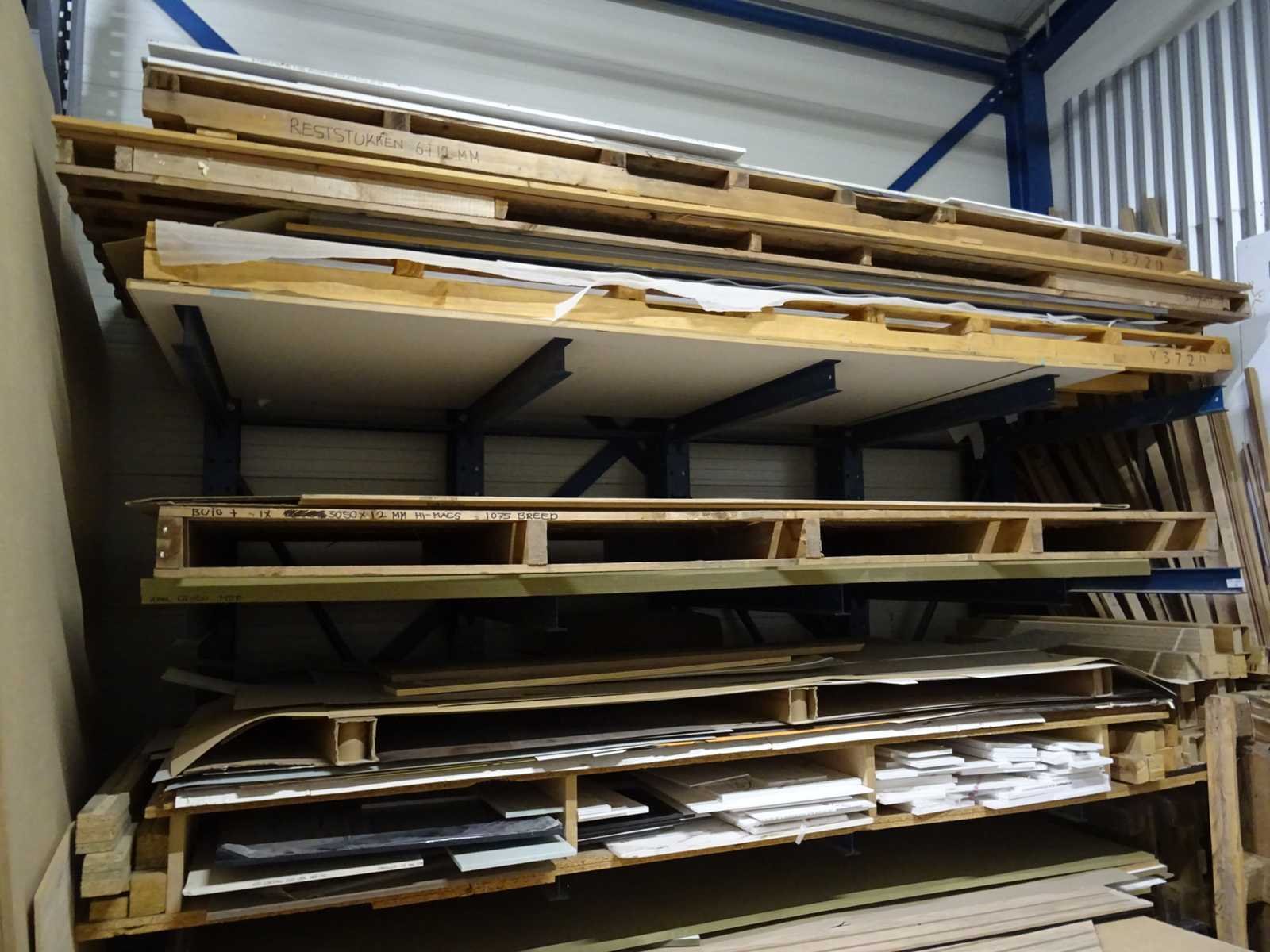 Betreft de inhoud van platenstelling en draagarmstelling, bestaande uit diverse soorten en maten o.a. spaanplaat, MDF, multiplex, buigtriplex, decorplaten, HPL, wandbekleding en meer. Met palletlengtes tot circa 400 cm. Let op, ophalen begin ophaaldag, u dient de stelling geheel leeg achter te laten.