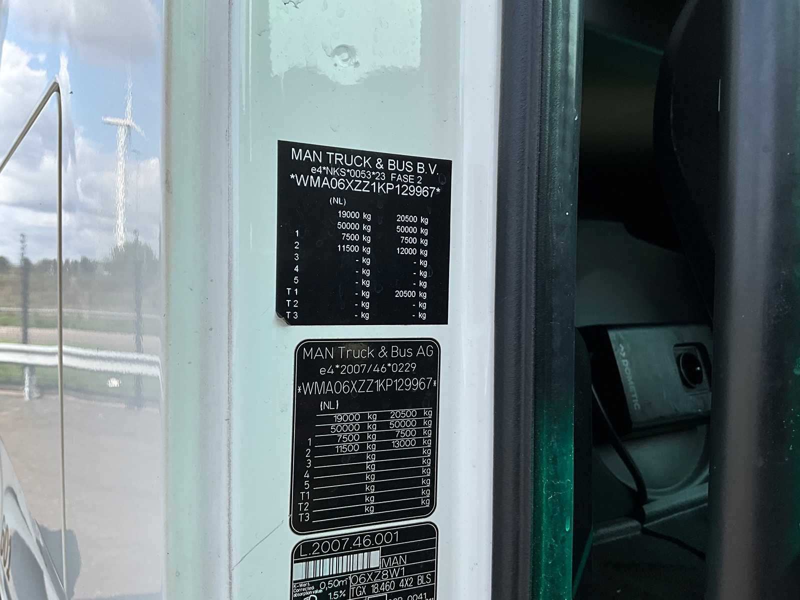 Elektrische ramen en spiegels, spiegel verwarming, stuurwiel bediening, airco, sper, digitale tachograaf, koelkast, slaapcabine, dubbele brandstoftank, start onderbreker Merk: MAN Type: TGX 18.460 Bouwjaar: 2019 Chassisnummer VIN: WMA06XZZ1KP129967 Cilinderinhoud: 12419cc Kilometerstand bij opname: 805445km Datum eerste toelating: 14-05-2019 Type transmissie: Automatisch Aantal assen: 2 Asconfiguratie: 4x2 Fuel Type: Diesel Aantal sleutels: 3 Emissieklasse: EURO6 Slaapcabine: true Nationaliteit documenten: Litouwen Kentekenpapieren compleet?: true Aantal zitplaatsen: 2