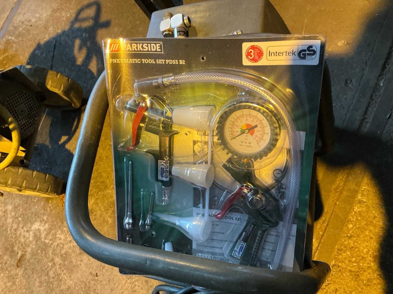Voorzien van ongebruikte Parkside luchtset. Merk: Atlas Copco Type: LE3N Airlet Mobiel: true Capaciteit.: 10bar Aansluiting: 230V Totale afmeting L: 650mm Totale afmeting Breedte: 320mm Totale afmeting Hoogte: 750mm
