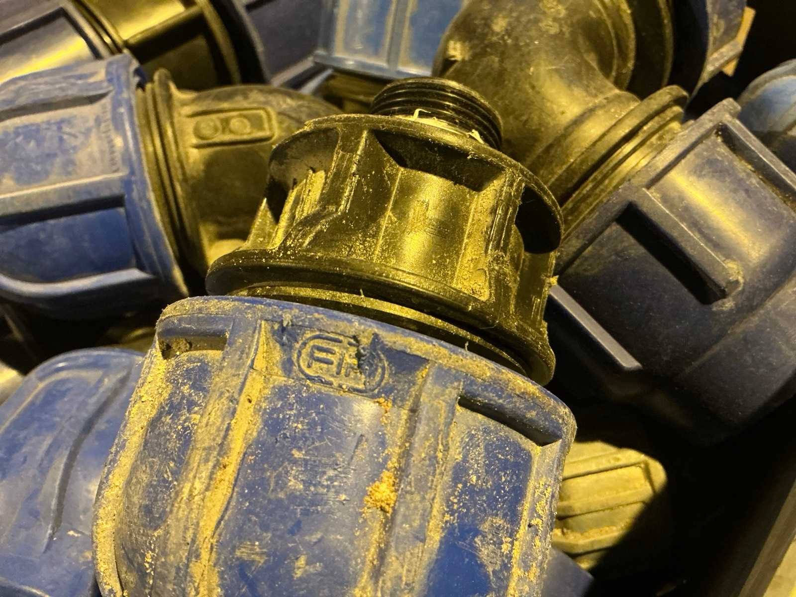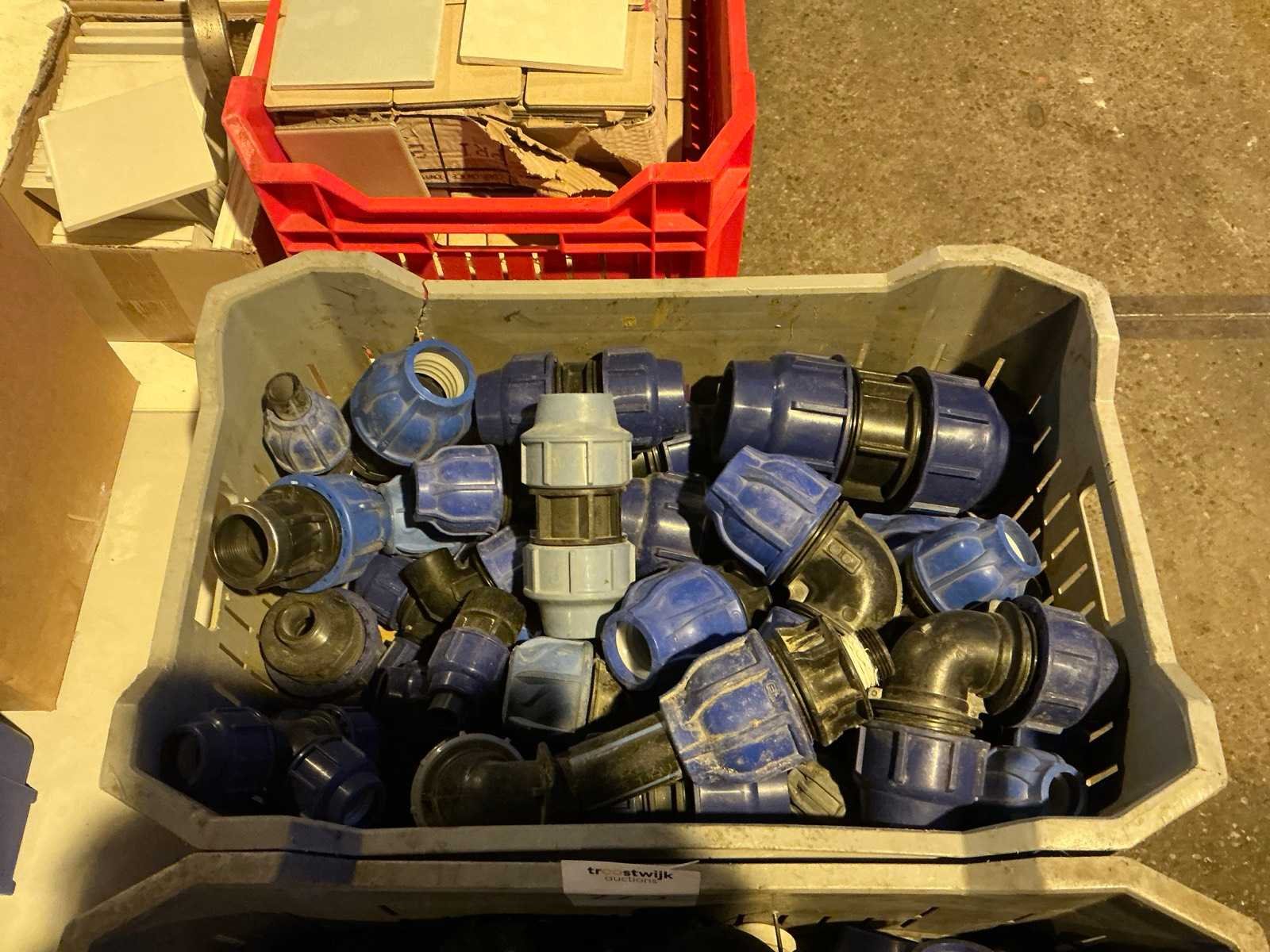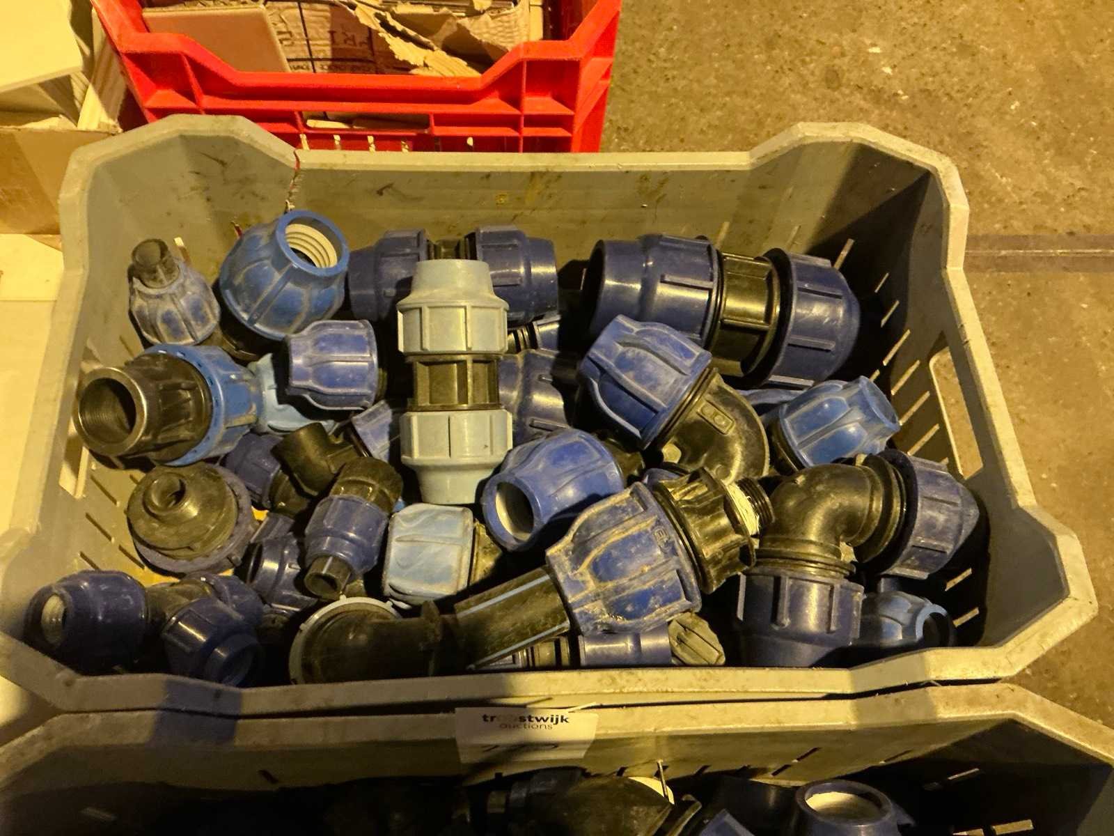 Verschillende soorten en maten koppelingen en bochten in en met 2 kratten. Merk: FIP