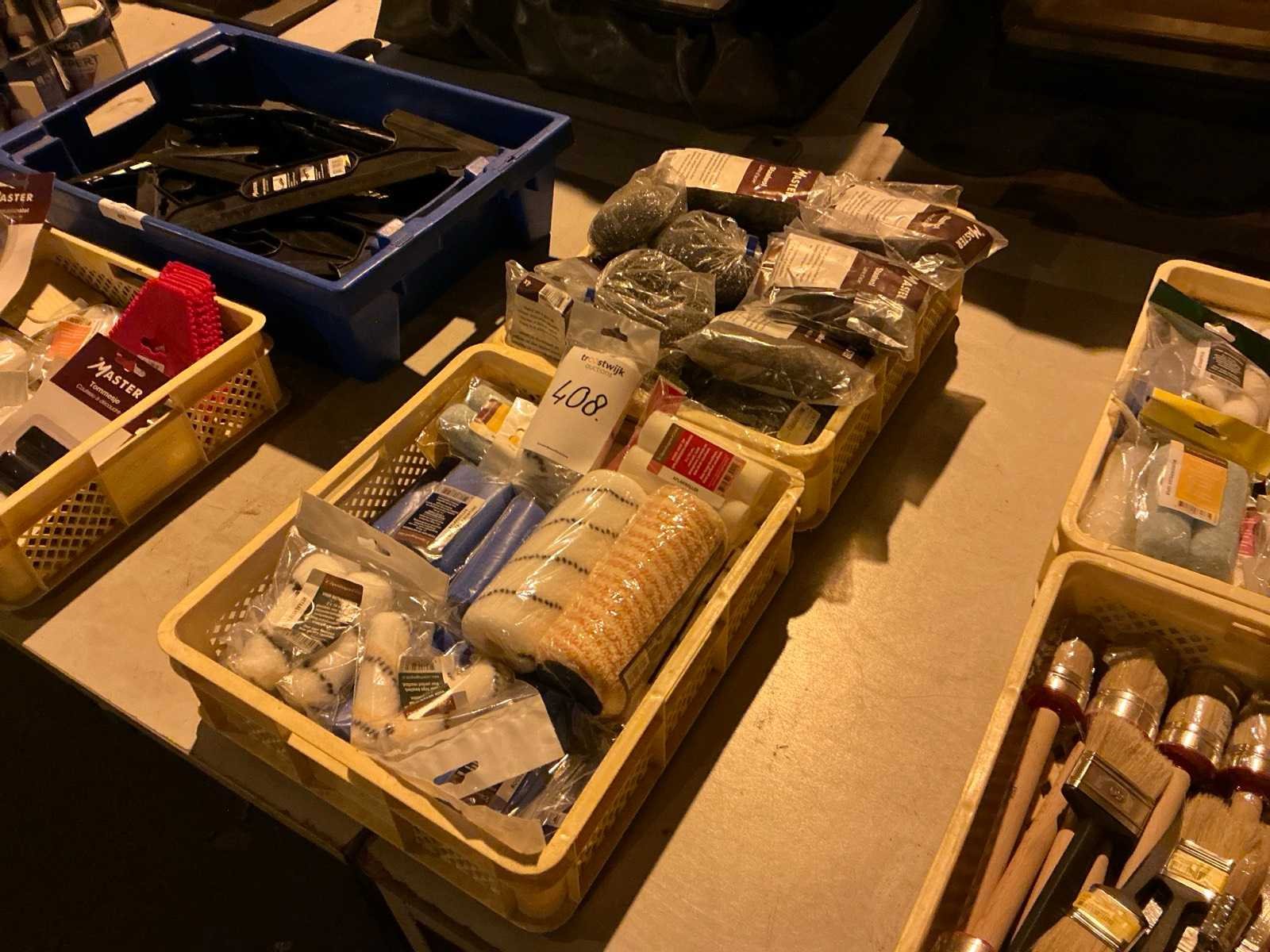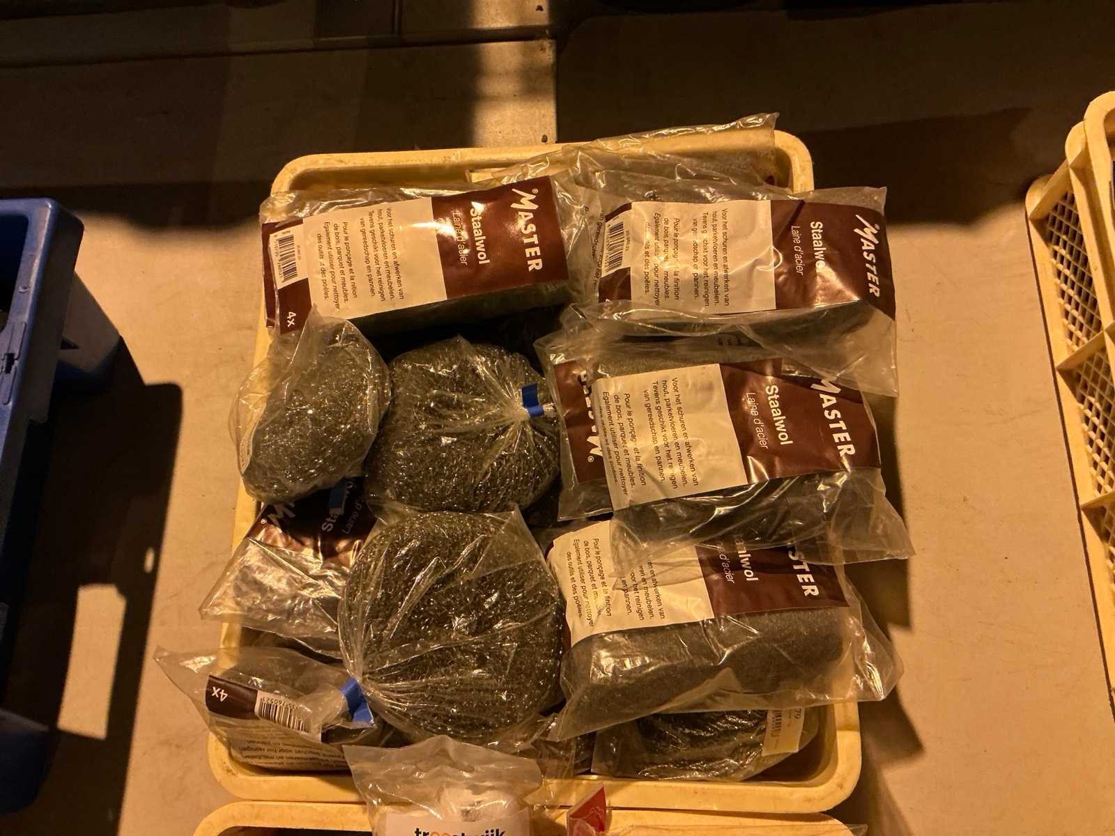 Staalwol en rollen in plastic krat (2x)