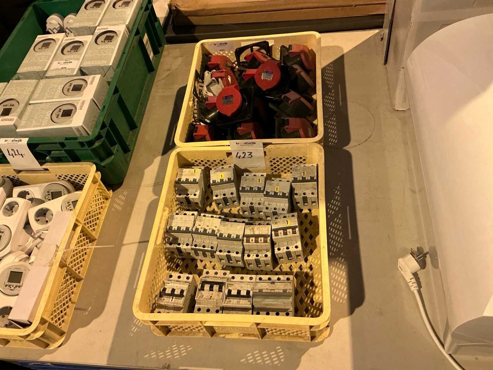 Schakelmateriaal en stekkers in plastic krat (2x)