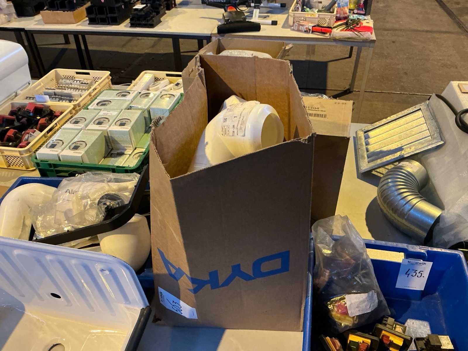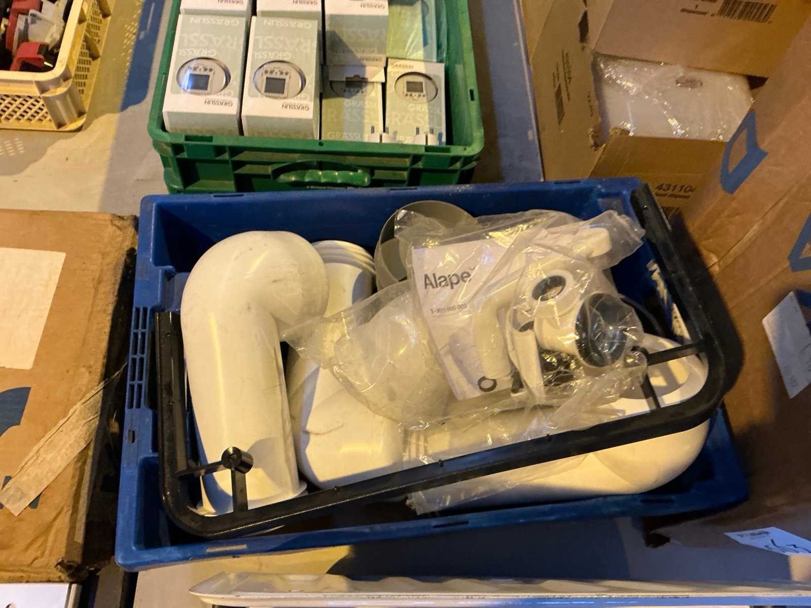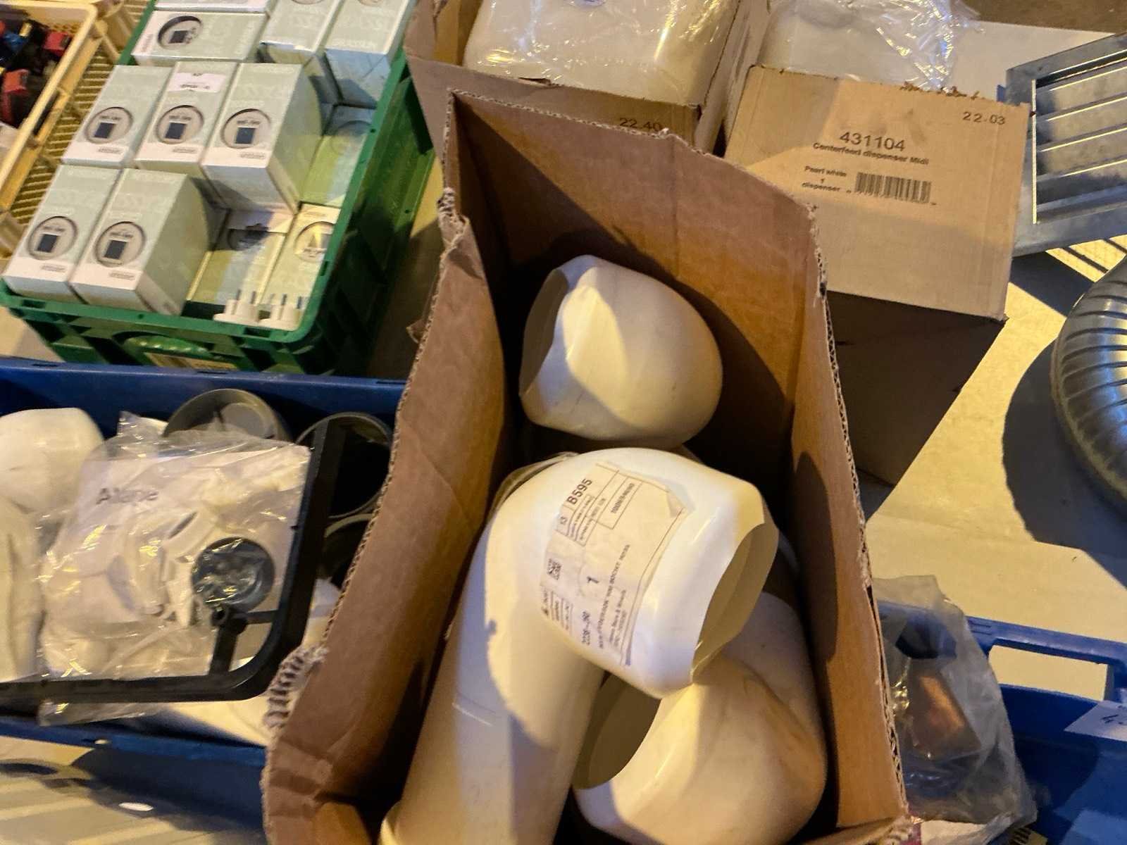 Voorzien van een krat en een doos met verschillende soorten en maten afvoerbuizen. Lengte: 51cm Breedte: 33cm Hoogte: 38cm Materiaal: Metaal