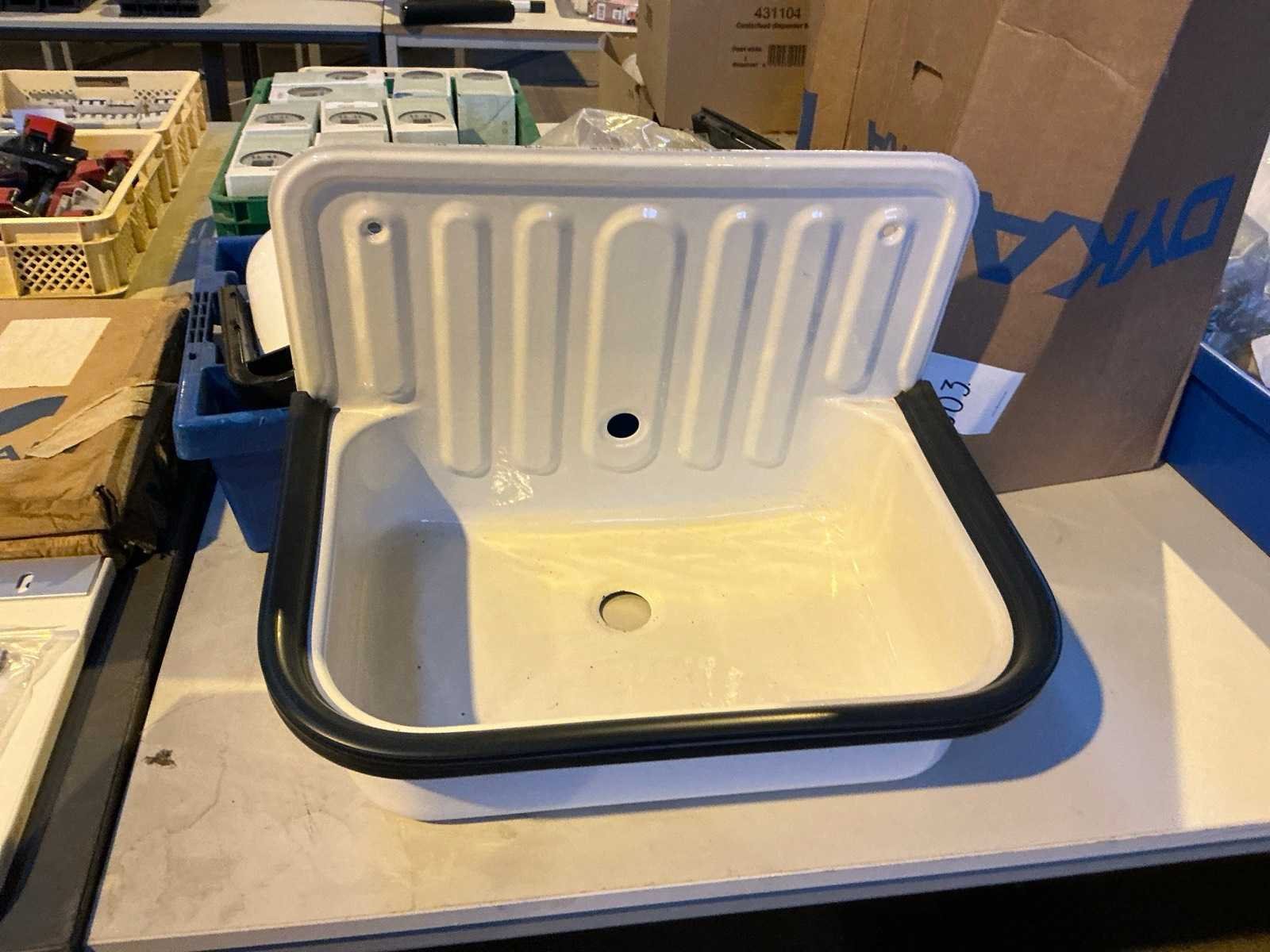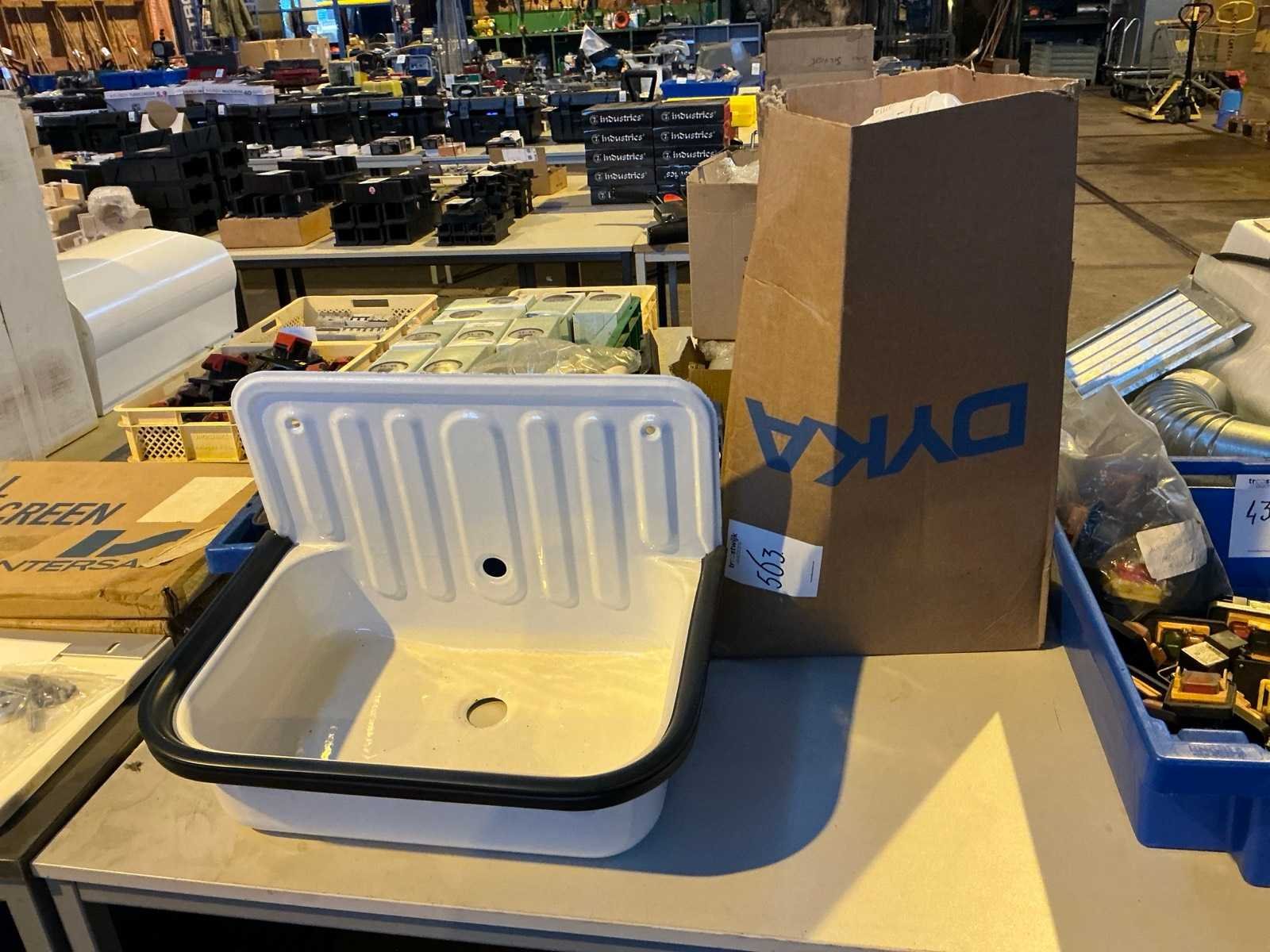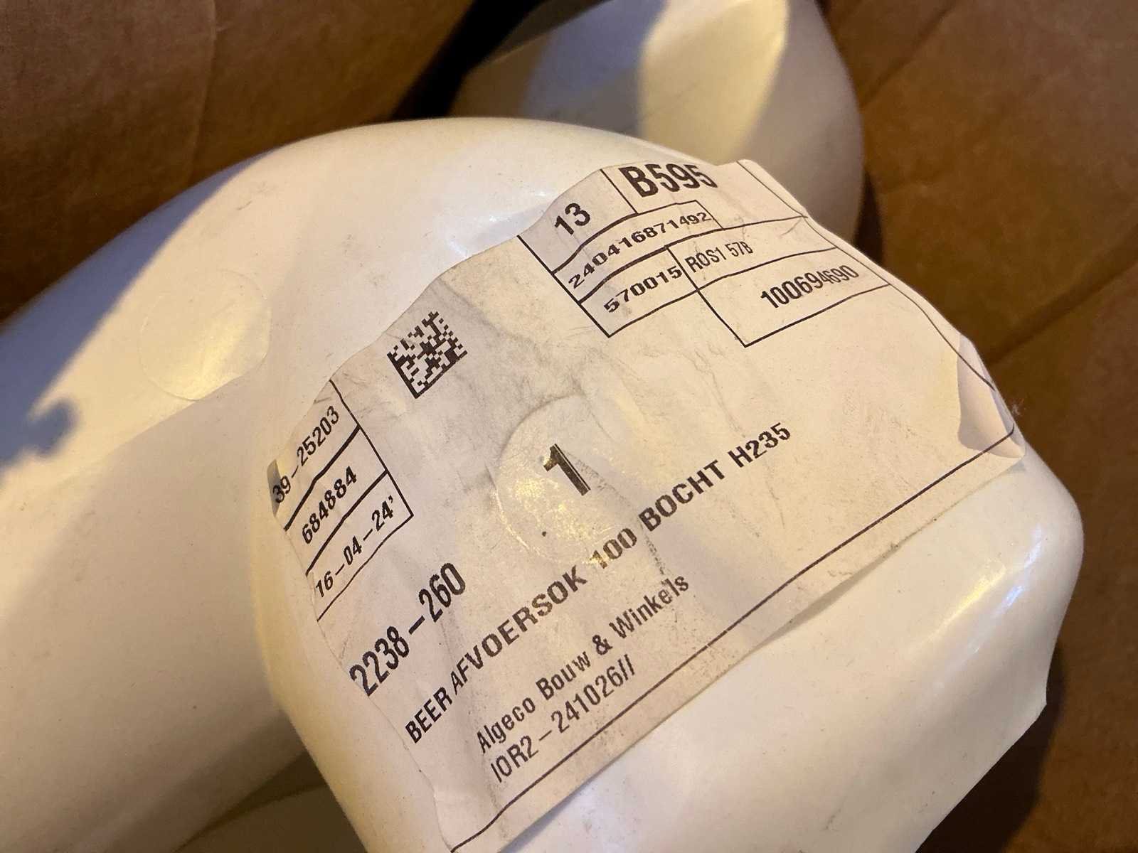 Voorzien van een krat en een doos met verschillende soorten en maten afvoerbuizen. Lengte: 51cm Breedte: 33cm Hoogte: 38cm Materiaal: Metaal