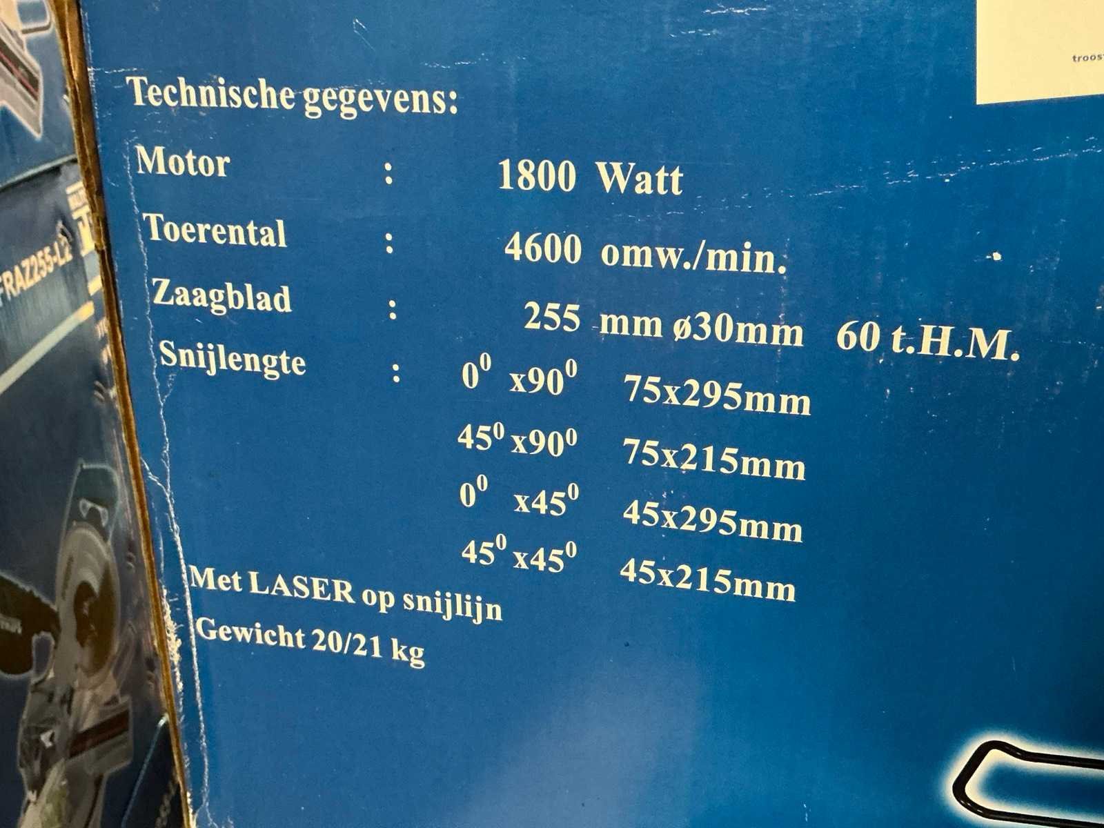 Ongebruikt in doos. Merk: Fremark Type: FRAZ255-L2 Zaagblad Ø: 255mm Motorvermogen (kW): 1.8kW Aansluiting: 230V