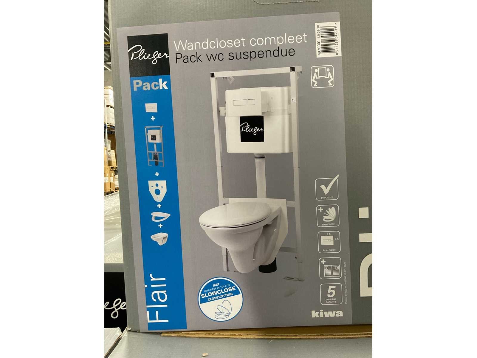 Inbouwset bestaande uit: Inbouwreservoir, wandcloset, closetzitting en bedieningsplaat dualflush. Merk: Plieger Model: Flair Kleur: Wit Materiaal: Keramiek