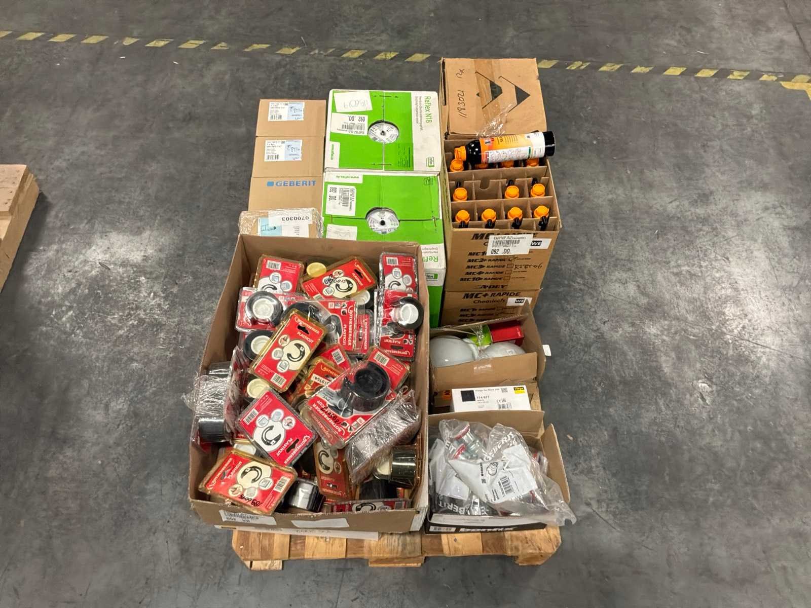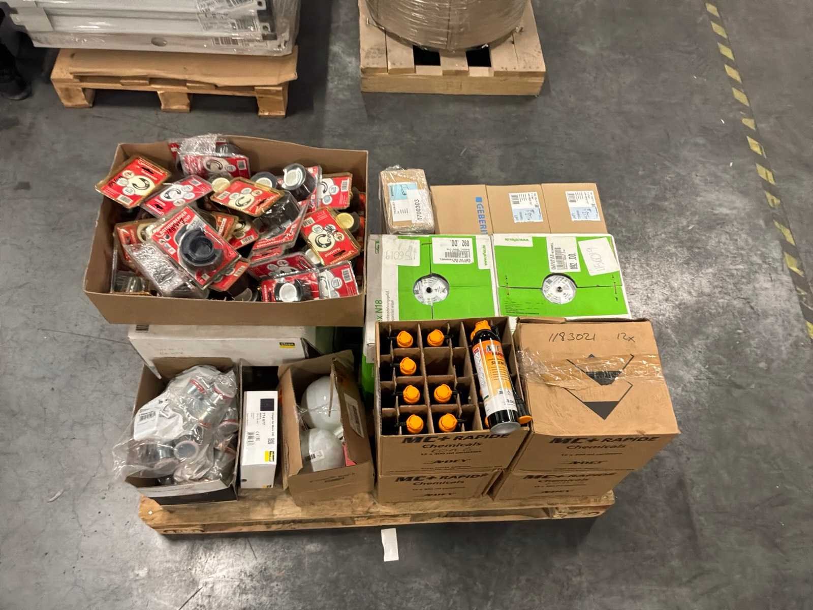 Bestaande uit : 4 dozen MC 2+ rapide silencer, 2x expansievat 18L 1,5 bar, 3x Geberit Uniflex kunststof inbouwsifon set (1 1/4"),1x Geberit bedieningsplaat, partij rothenberger plasticut, Geberit Mapress ø54/ø42, 1x viega visign for more 200.