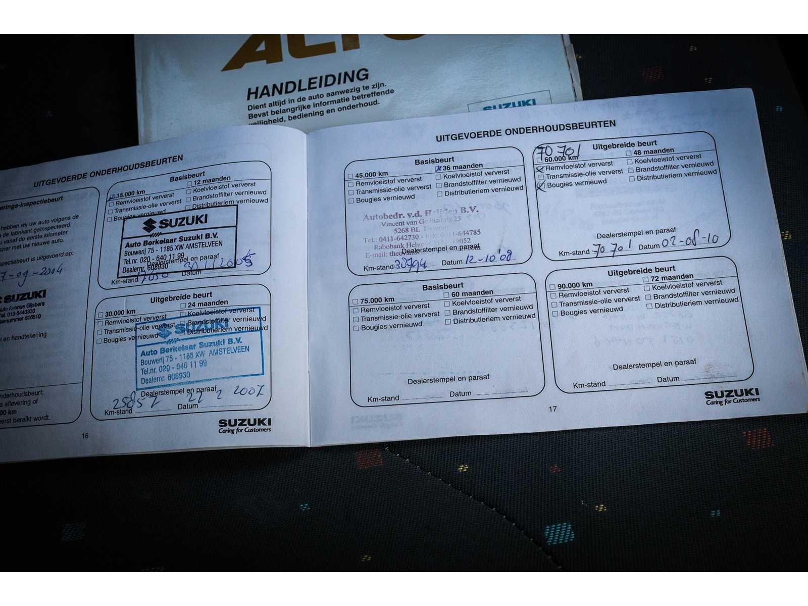 Kenteken: 76-PN-ZJ Merk: Suzuki Model: Alto Type: 1.1 GL Jubilée Afgelezen kilometerstand: 216114km Cilinderinhoud: 1061cc Vermogen (kW): 46kW Brandstof: benzine Chassisnummer: MA3FFB21S00260433 Laadvermogen: 0kg NAP status: Logisch Datum eerste toelating: 2004-09-24 Datum eerste toelating (NL): 2004-09-24 APK vervaldatum: 2025-12-13 Aandrijving: fwd Aantal zitplaatsen: 4 Kleur: rood Transmissie: handgeschakeld Stuurwiel: links Emissieklasse: 3 Aantal deuren: 4 Ledig gewicht: 775kg Bruto BPM (NL): 948€ Aantal cilinders: 4 Carrosserie: hatchback Onderhoudshistorie: Ja gedeeltelijk Carfax Link: https://was.carfax.eu/v0/api/ccdid/5100016408/svc/201/vinreg/76PNZJ/checksum/eyJhbGciOiJIUzI1NiIsInR5cCI6IkpXVCJ9.eyJleHAiOjE3NjY1NzAwMjl9.4QW67uN_MkjRzsgCbDLbh_1_ryoUKfNa_uUv5VtB3M8 startinformatie : Start en rijdt