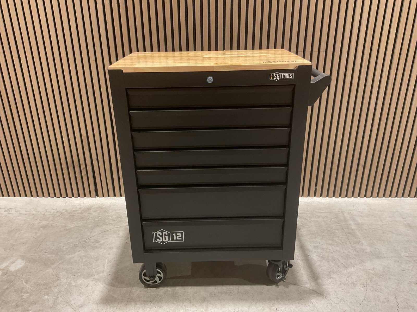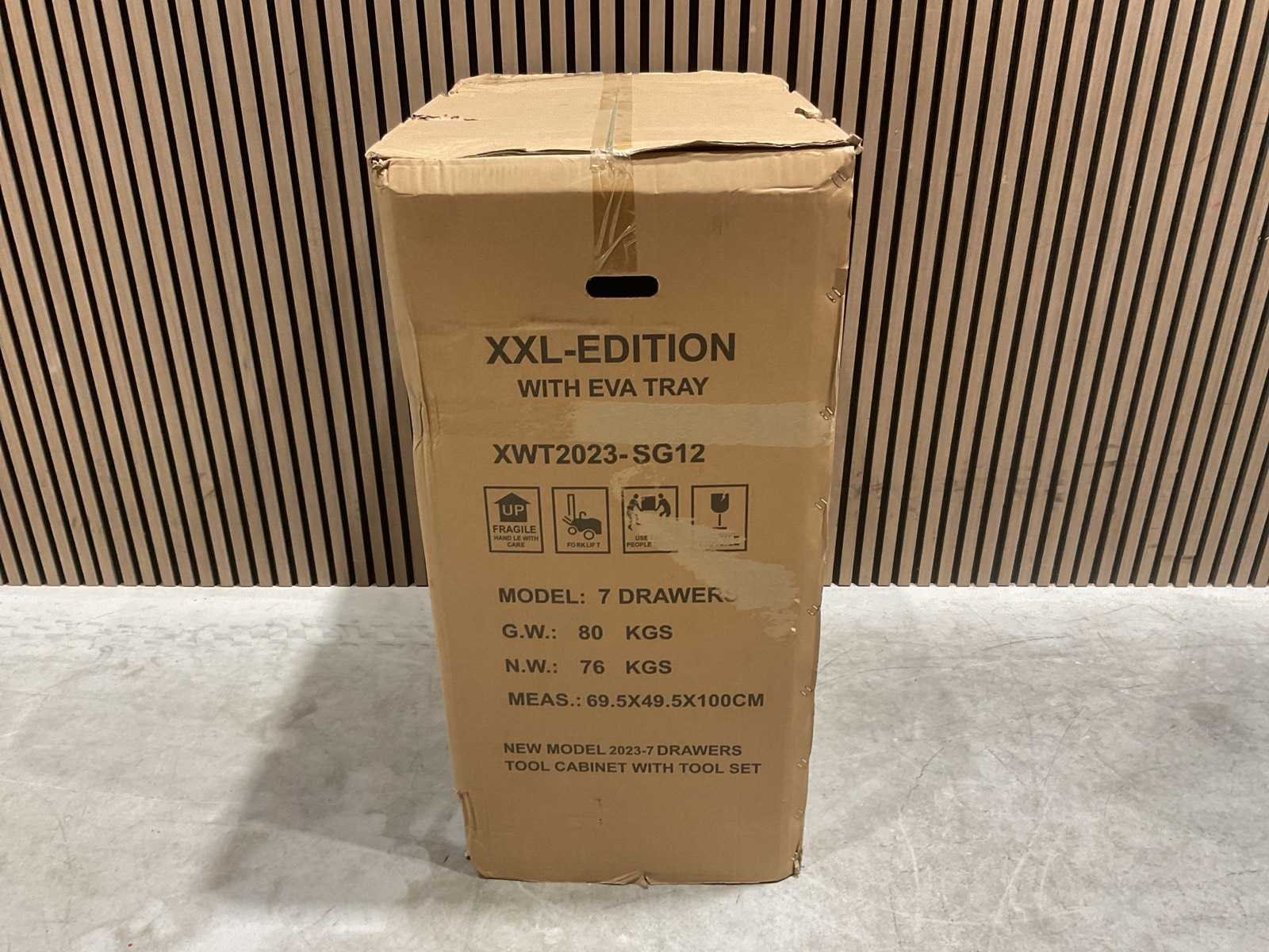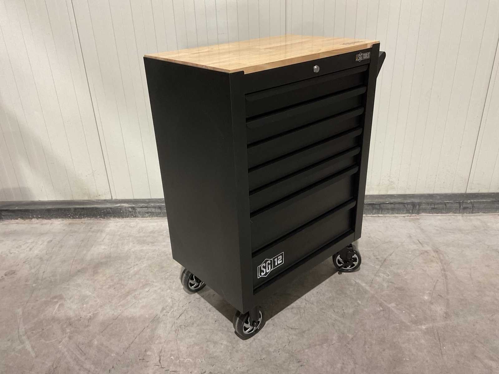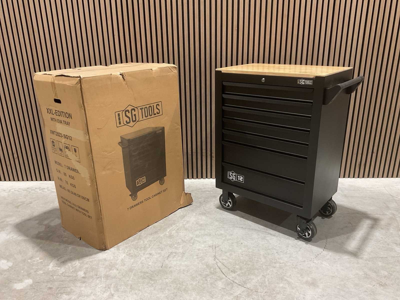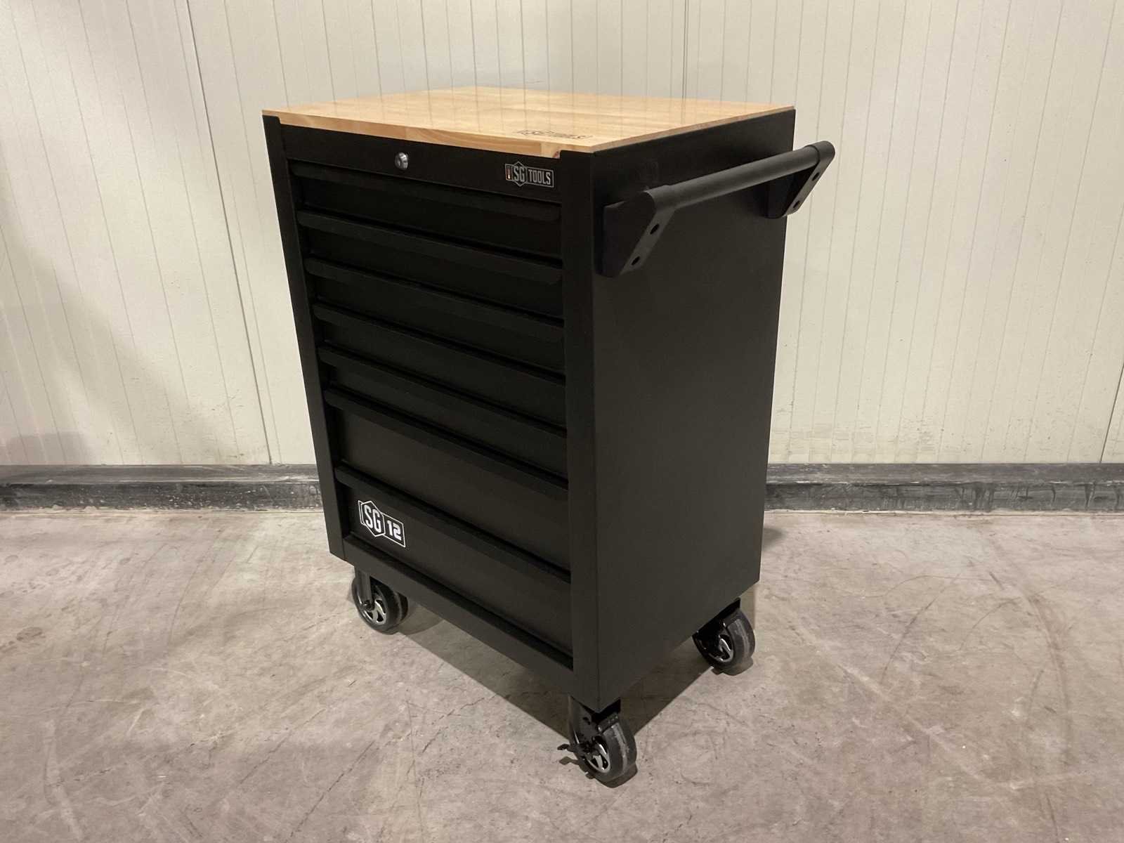 Voorzien van Lades: 7 lades, waarvan 6 gevuld; Aantal tools/onderdelen: 278 stuks; Wielen: 4 wielen, waarvan 2 zwenkwielen met rem; Afwerking: mat zwart, milieuvriendelijke poedercoating; Transport gewicht: 80kg; afmetingen 70x50x101cm; ongebruikt in doos Merk: SG TOOLS Type: XWT2023-SG12 Met inhoud: true Eigen gewicht: 76kg Totale afmeting L: 695mm Totale afmeting Breedte: 495mm Totale afmeting Hoogte: 100mm
