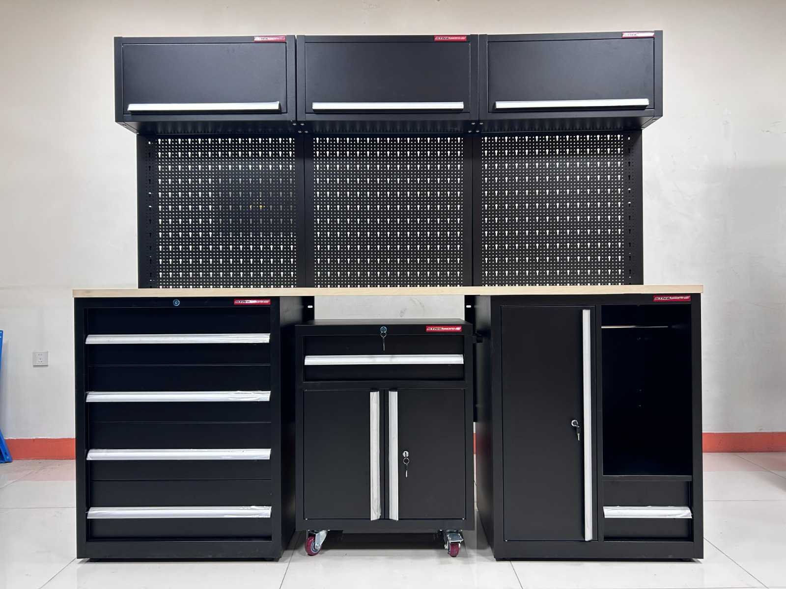 Voorzien van poeder coating; 30 mm houten werkblad; kleur zwart; ongebruikt in dozen (transport afmeting 1,55 m3) Merk: Stahlworks Model: OS-18 Product type: 225x55x203 cm Materiaal: SPCC steel
