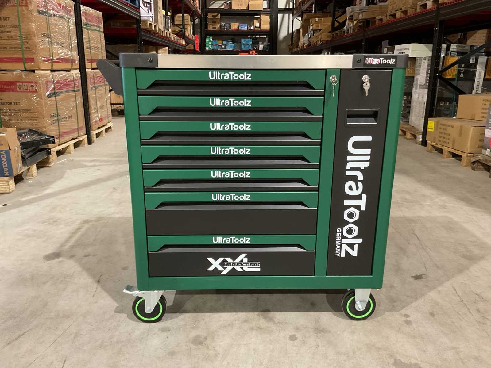 Voorzien van 7 lades waarvan 7 gevuld met gereedschap; zij lade; professioneel chroom-vanadium gereedschap; heavy duty gereedschapswagen; stevig werkblad; 4 wielen; stevig handvat; ongebruikt in doos (transport afmetingen 95x50x85 cm) Merk: UltraToolz Type: Germany 8/7 Bouwjaar: 2025 Aantal laden: 7 Met inhoud: true Eigen gewicht: 83kg Totale afmeting L: 950mm Totale afmeting Breedte: 500mm Totale afmeting Hoogte: 850mm
