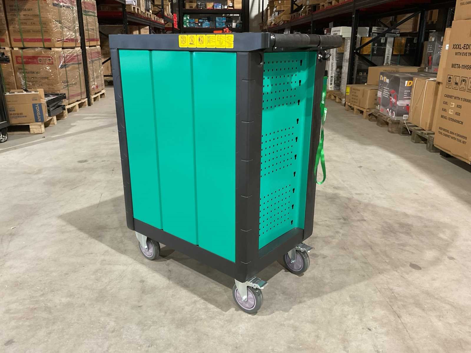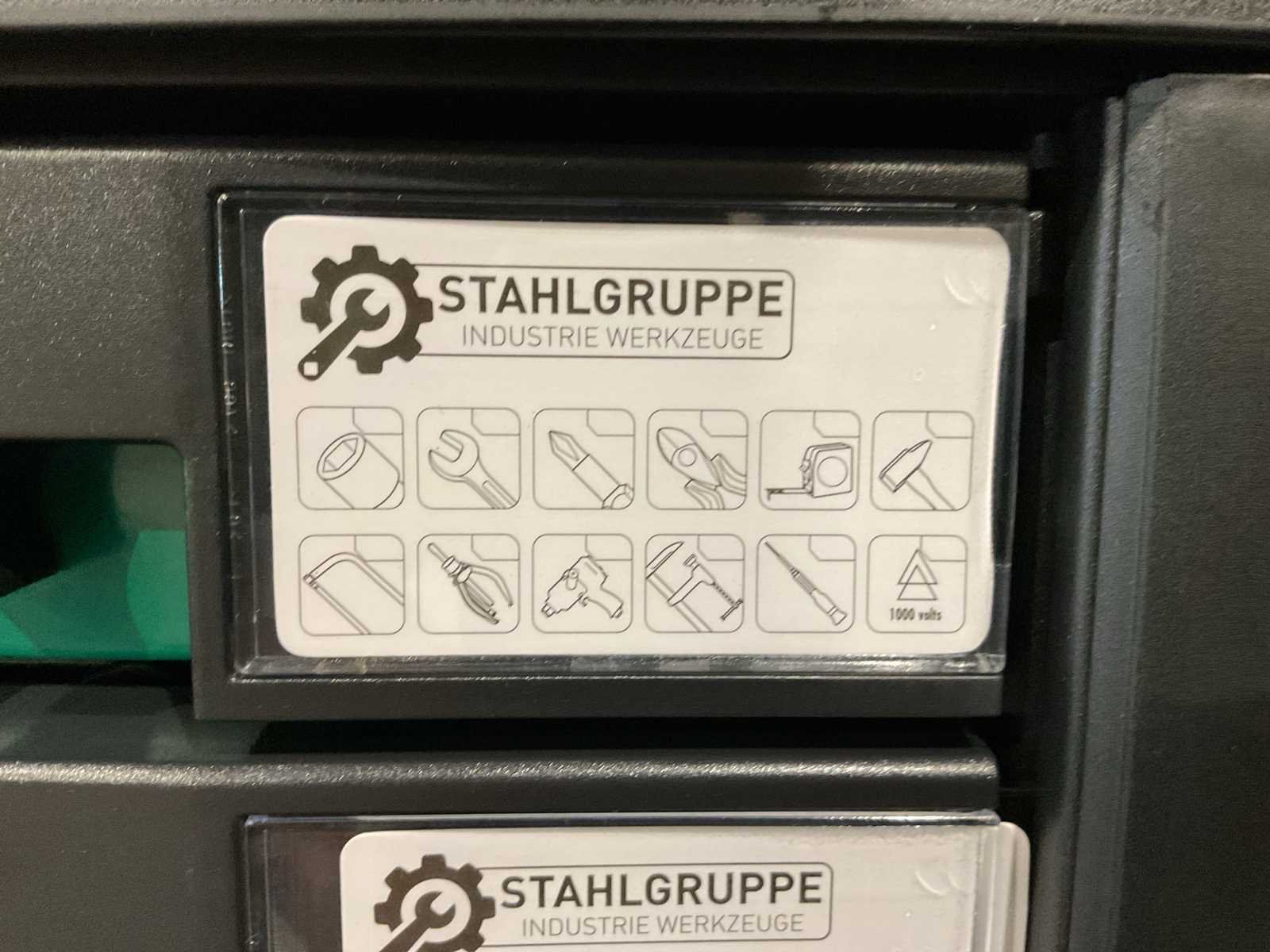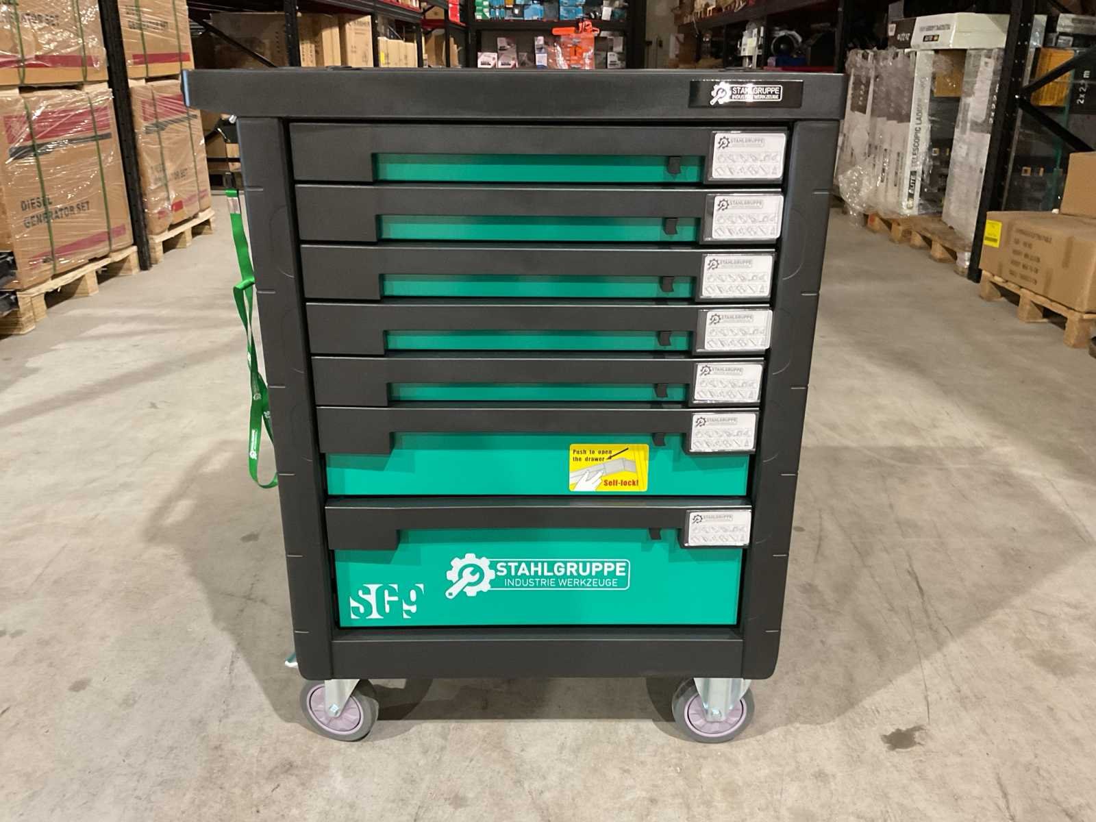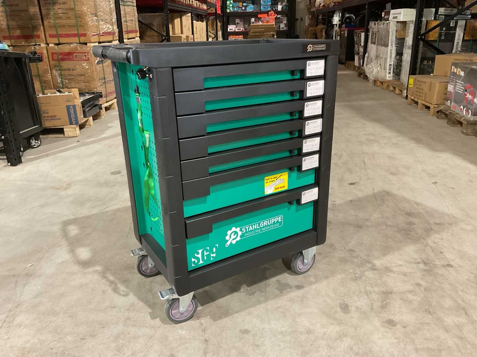 Voorzien van 7 lades waarvan 5 gevuld met gereedschap; professioneel chroom-vanadium gereedschap; heavy duty gereedschapswagen; stevig werkblad; 4 wielen; stevig handvat; ongebruikt in doos (transport afmetingen 80x50x105 cm) Merk: Stahlgruppe Type: SG9 Bouwjaar: 2025 Aantal laden: 7 Met inhoud: true Eigen gewicht: 78kg Totale afmeting L: 800mm Totale afmeting Breedte: 500mm Totale afmeting Hoogte: 1050mm