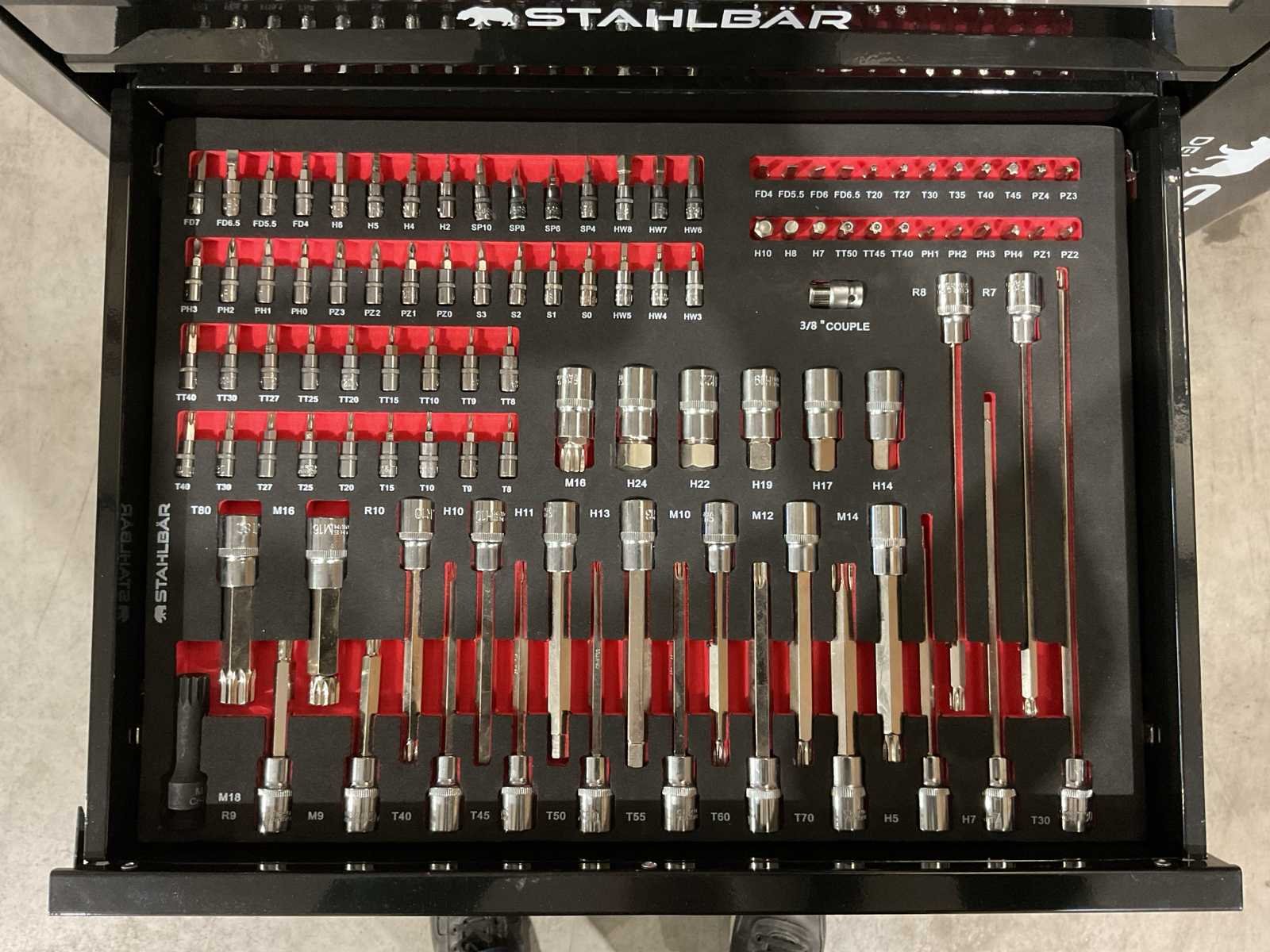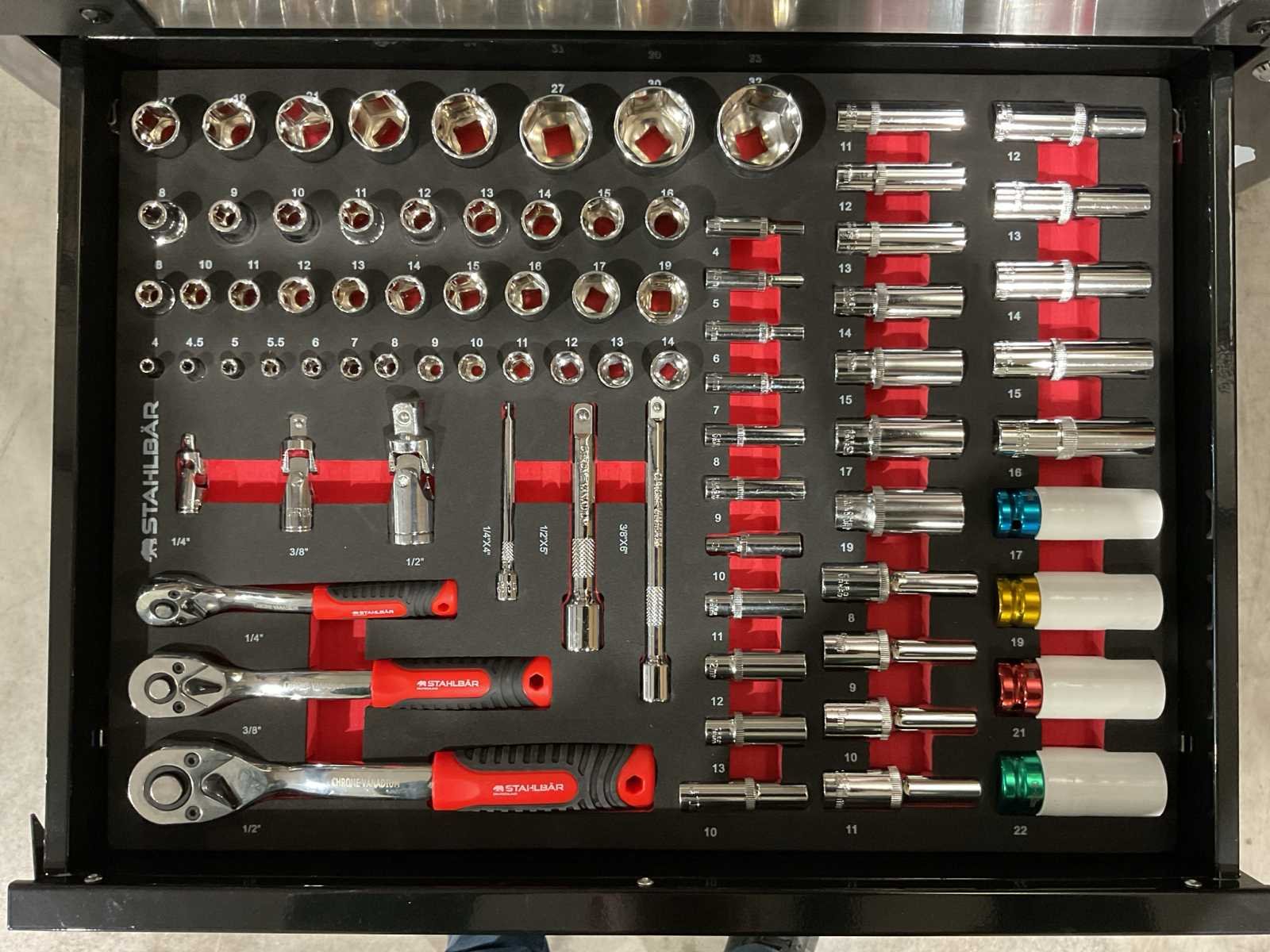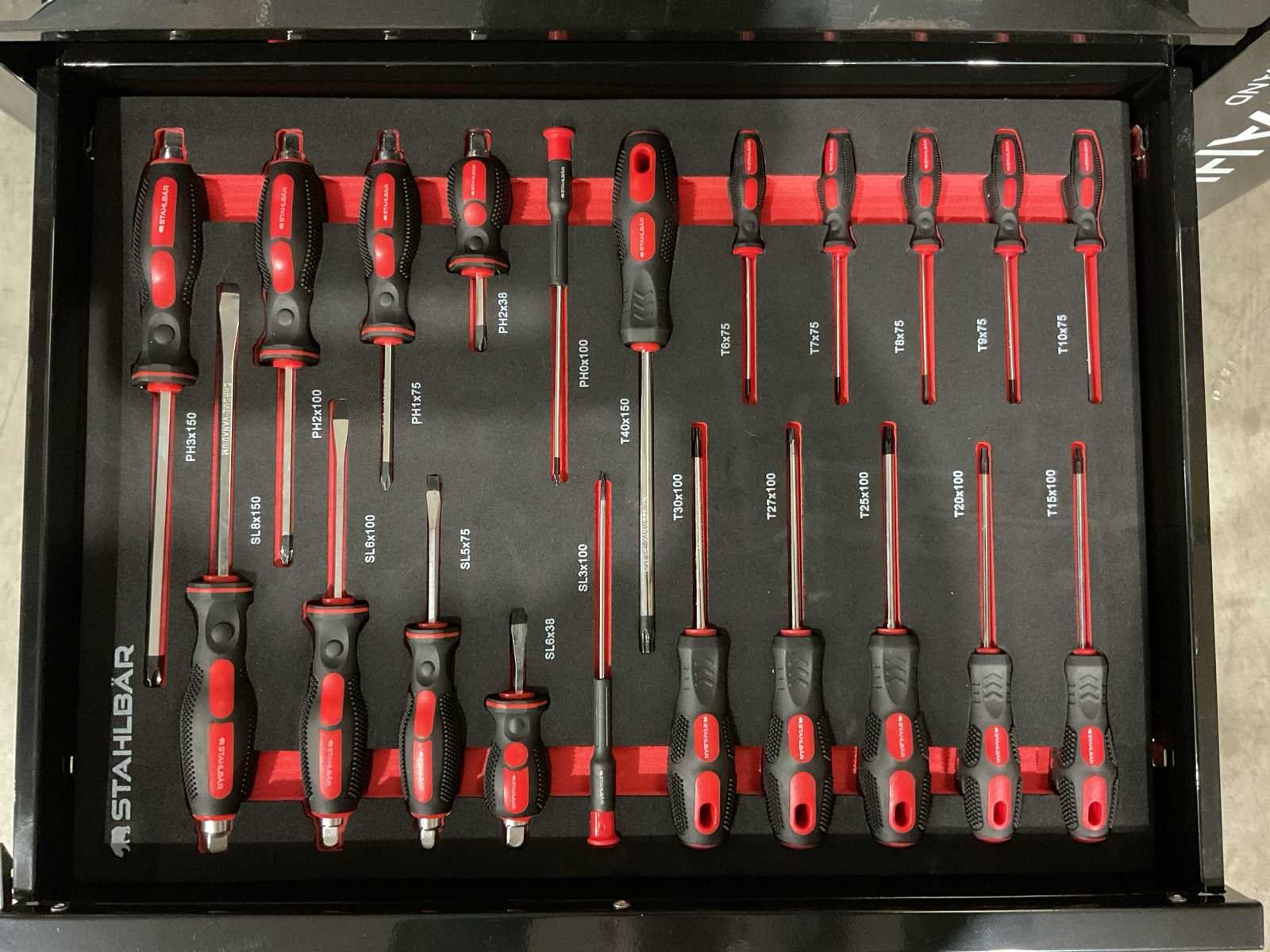 Voorzien van 7 lades waarvan 7 gevuld met gereedschap; professioneel chroom-vanadium gereedschap; heavy duty gereedschapswagen; stevig werkblad; 4 wielen; stevig handvat; ongebruikt in doos (transport afmetingen 80x50x85 cm) Merk: Stahlbär Type: Deutschland 7/7 Bouwjaar: 2025 Aantal laden: 7 Met inhoud: true Eigen gewicht: 78kg Totale afmeting L: 800mm Totale afmeting Breedte: 500mm Totale afmeting Hoogte: 850mm