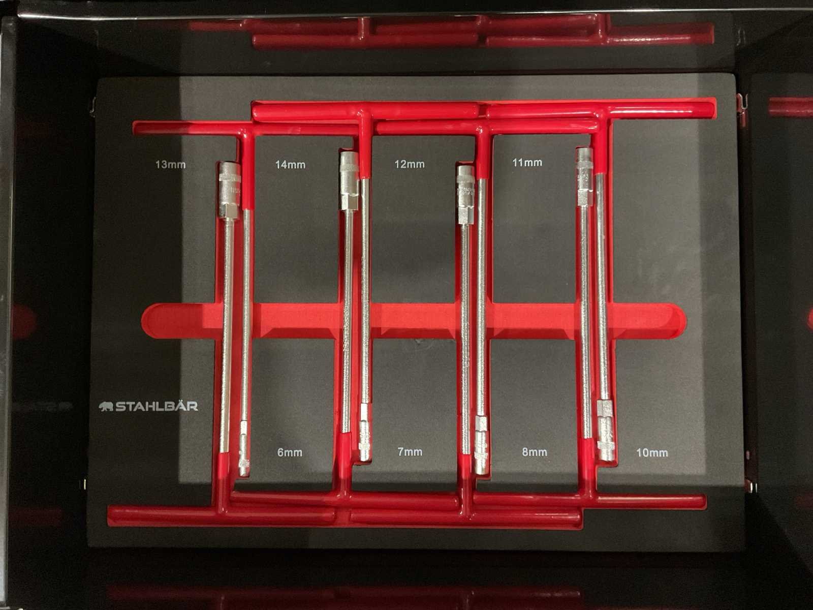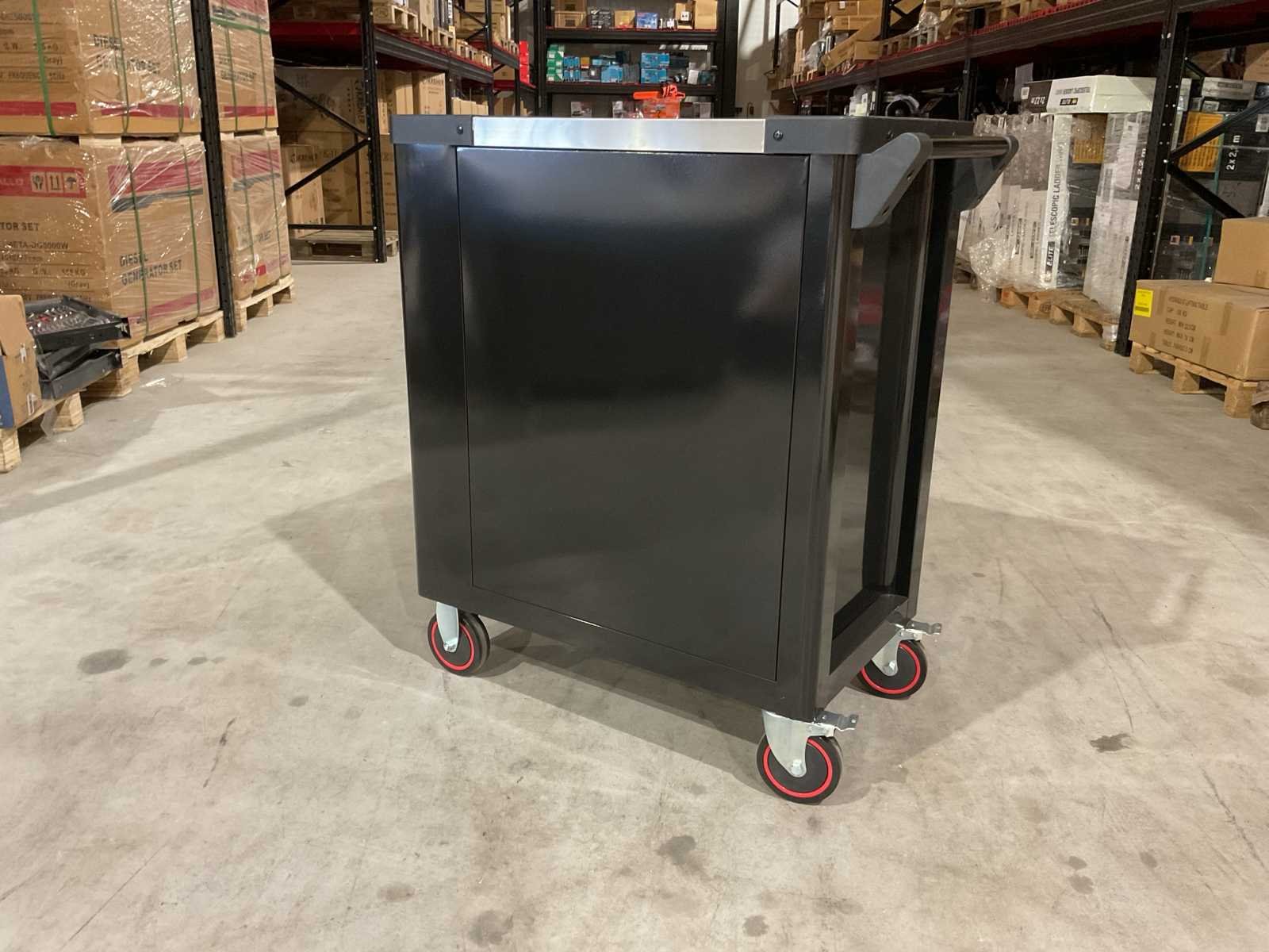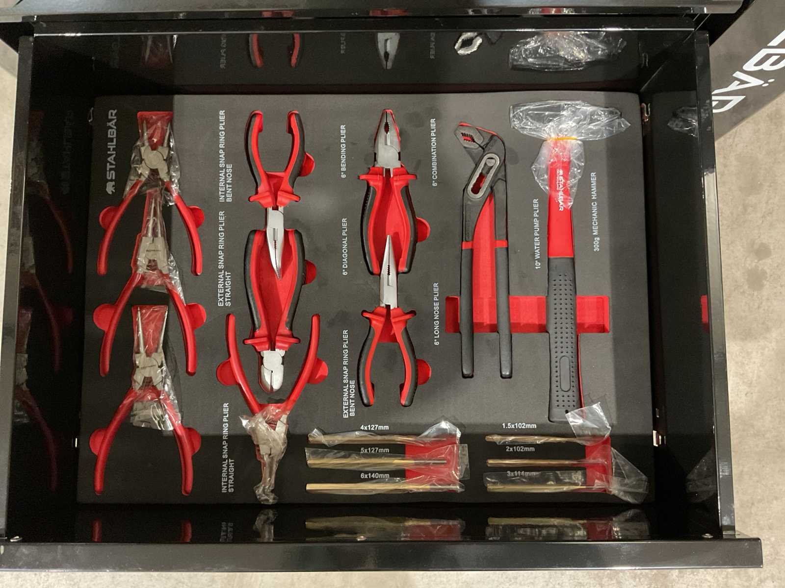 Voorzien van 7 lades waarvan 7 gevuld met gereedschap; professioneel chroom-vanadium gereedschap; heavy duty gereedschapswagen; stevig werkblad; 4 wielen; stevig handvat; ongebruikt in doos (transport afmetingen 80x50x85 cm) Merk: Stahlbär Type: Deutschland 7/7 Bouwjaar: 2025 Aantal laden: 7 Met inhoud: true Eigen gewicht: 78kg Totale afmeting L: 800mm Totale afmeting Breedte: 500mm Totale afmeting Hoogte: 850mm