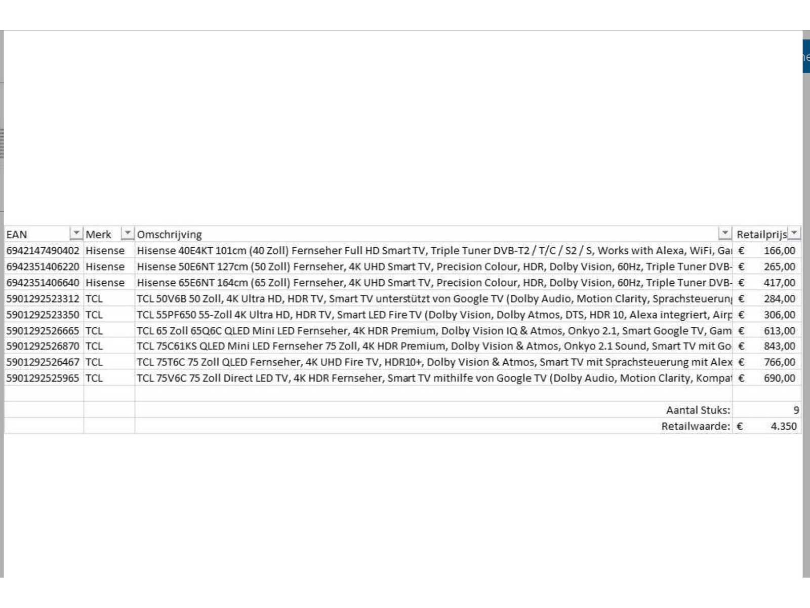 Dit betreft een partij televisies retourgoederen van een grote online retailer. De partij bestaat uit diverse diverse maten televisies. Aantal stuks: 9. Retailwaarde: €4350,- De televisies zijn niet werkend en zijn te gebruiken voor onderdelen. Kom op de kijkdag om te om zo een goed beeld te krijgen van de reden van retour. Zie foto's voor lijst met inhoud. Merk: Pallet Retourgoederen - Televisies