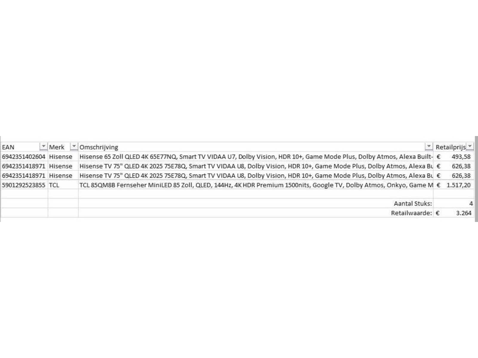 Dit betreft een partij televisies retourgoederen van een grote online retailer. De partij bestaat uit diverse diverse maten televisies. Aantal stuks: 4. Retailwaarde: €3264,- De televisies zijn niet werkend en zijn te gebruiken voor onderdelen. Kom op de kijkdag om te om zo een goed beeld te krijgen van de reden van retour. Zie foto's voor lijst met inhoud. Merk: Pallet Retourgoederen - Televisies