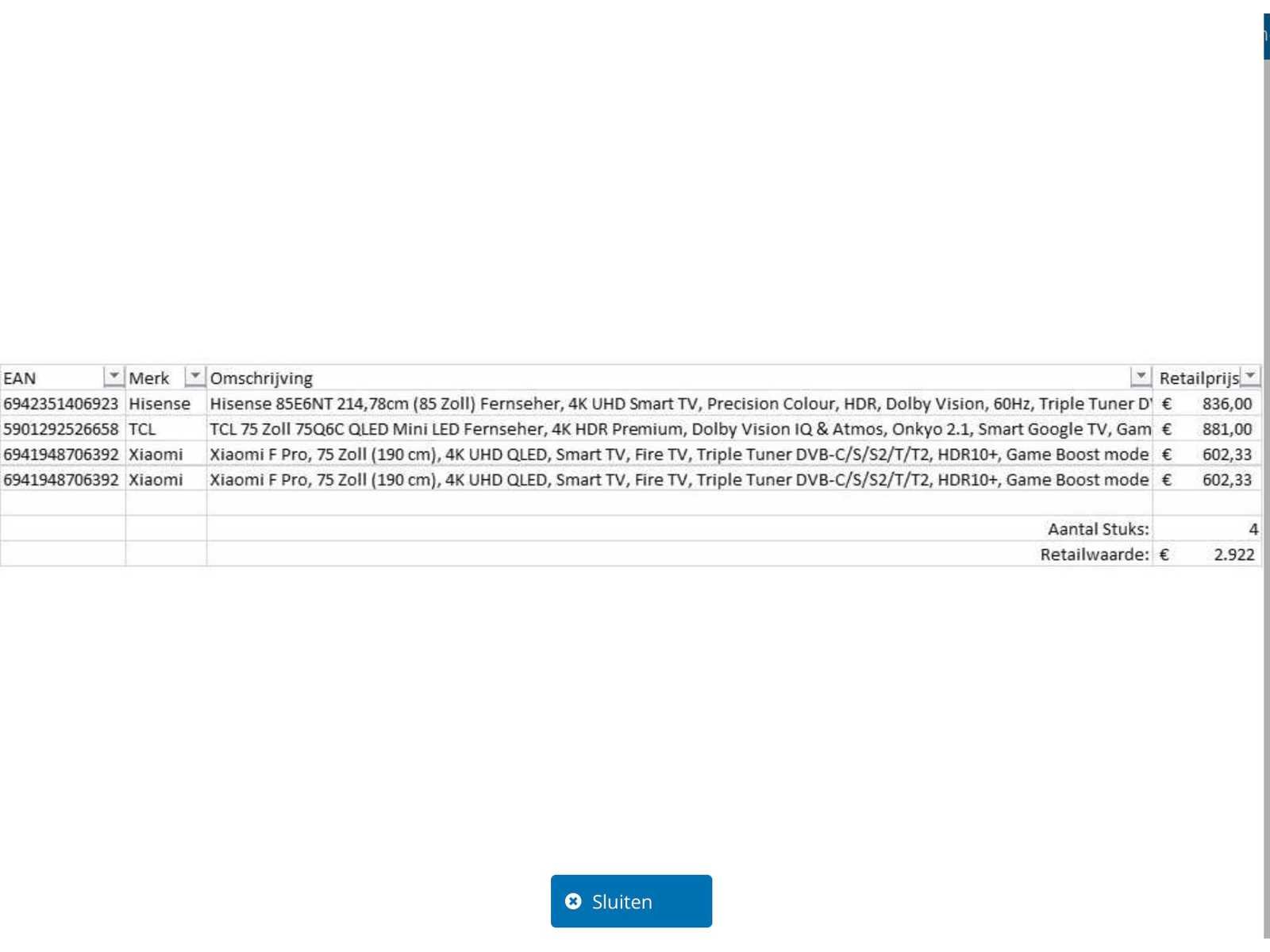 Dit betreft een partij televisies retourgoederen van een grote online retailer. De partij bestaat uit diverse diverse maten televisies. Aantal stuks: 4 Retailwaarde: €2922,- De televisies zijn niet werkend en zijn te gebruiken voor onderdelen. Kom op de kijkdag om te om zo een goed beeld te krijgen van de reden van retour. Zie foto's voor lijst met inhoud. Merk: Pallet Retourgoederen - Televisies