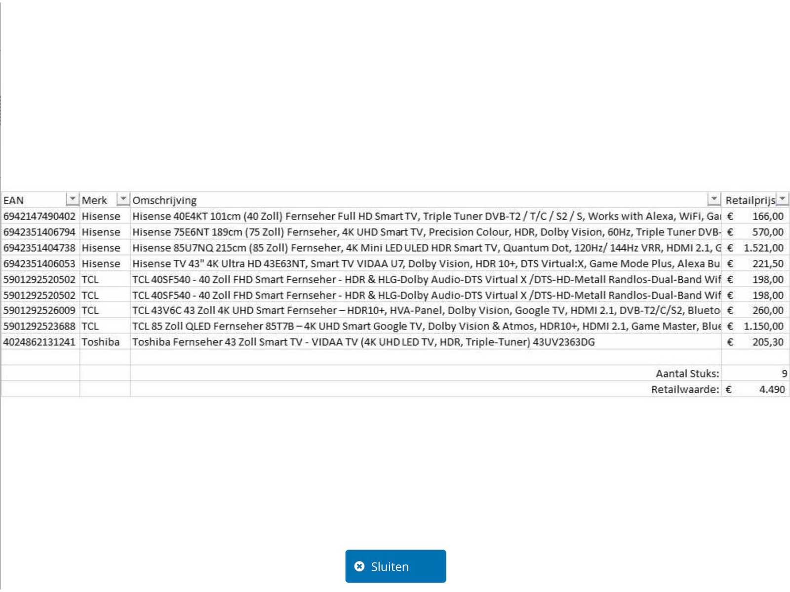 Dit betreft een partij televisies retourgoederen van een grote online retailer. De partij bestaat uit diverse diverse maten televisies. Aantal stuks: 9. Retailwaarde: €4490;- De televisies zijn niet werkend en zijn te gebruiken voor onderdelen. Kom op de kijkdag om te om zo een goed beeld te krijgen van de reden van retour. Zie foto's voor lijst met inhoud. Merk: Pallet Retourgoederen - Televisies