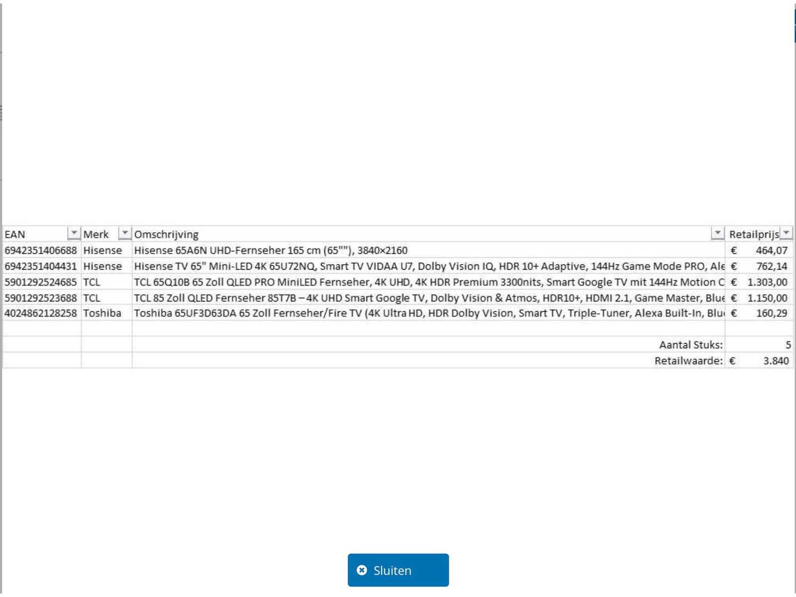 Dit betreft een partij televisies retourgoederen van een grote online retailer. De partij bestaat uit diverse diverse maten televisies. Aantal stuks: 5. Retailwaarde: €3840,- De televisies zijn niet werkend en zijn te gebruiken voor onderdelen. Kom op de kijkdag om te om zo een goed beeld te krijgen van de reden van retour. Zie foto's voor lijst met inhoud. Merk: Pallet Retourgoederen - Televisies