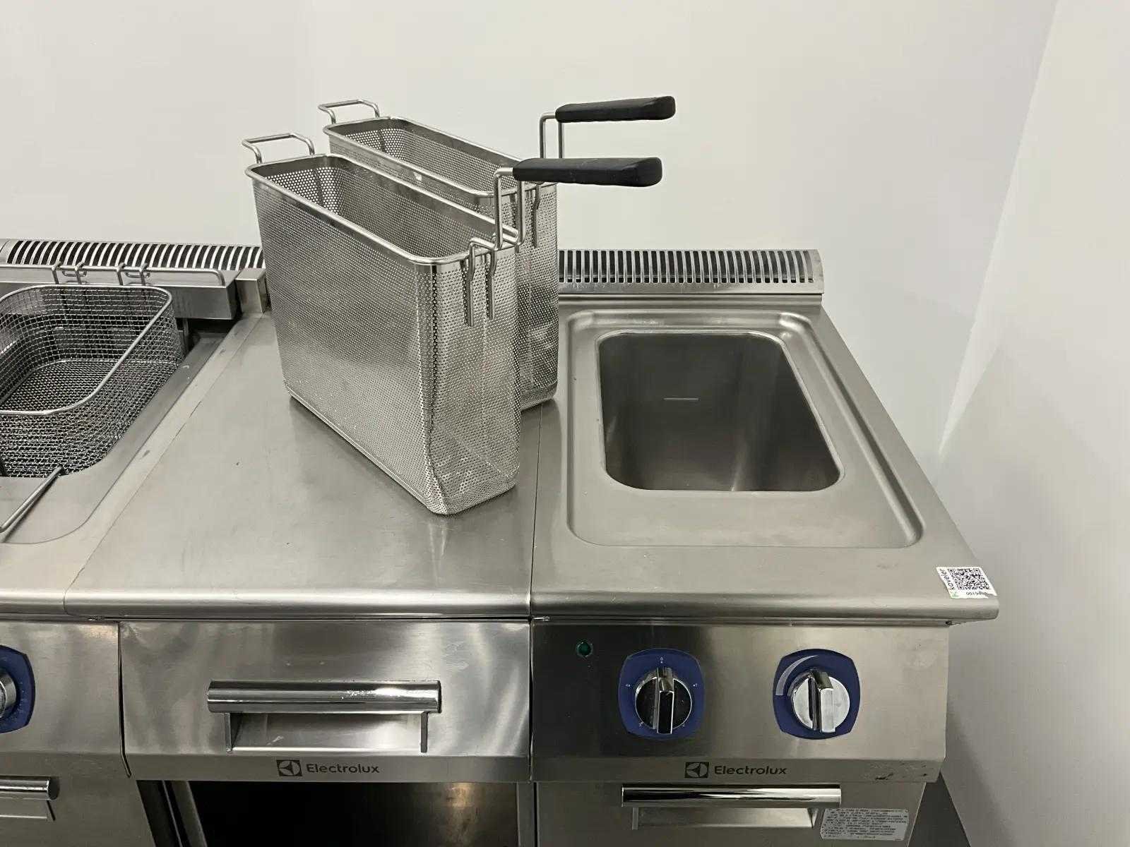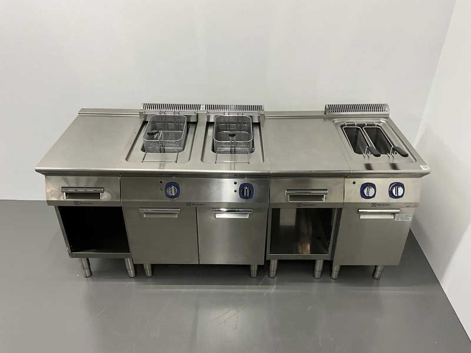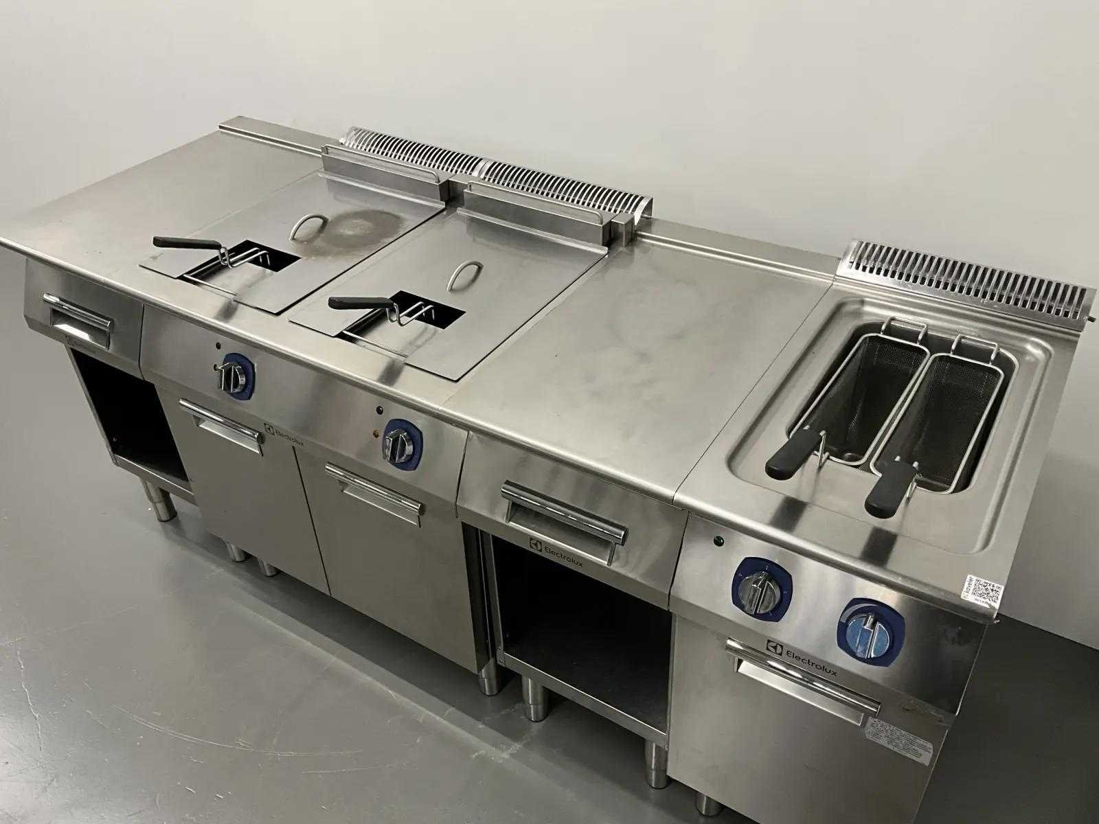 V.v. (v.l.n.r.) neutrale unit, dubbele friteuse (E7FREH2FF0 - 400V - 17,4 kW - 2x 14 Liter), neutrale unit en pastakoker (E7PCED1KF0 - 400V - 6 kW). Merk: Electrolux Lengte: 200cm Breedte: 73cm Hoogte: 90cm Totale afmeting Breedte: 730mm Totale afmeting L: 2000mm Totale afmeting Hoogte: 900mm
