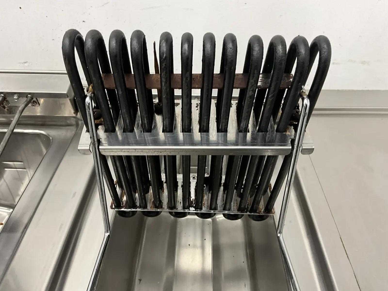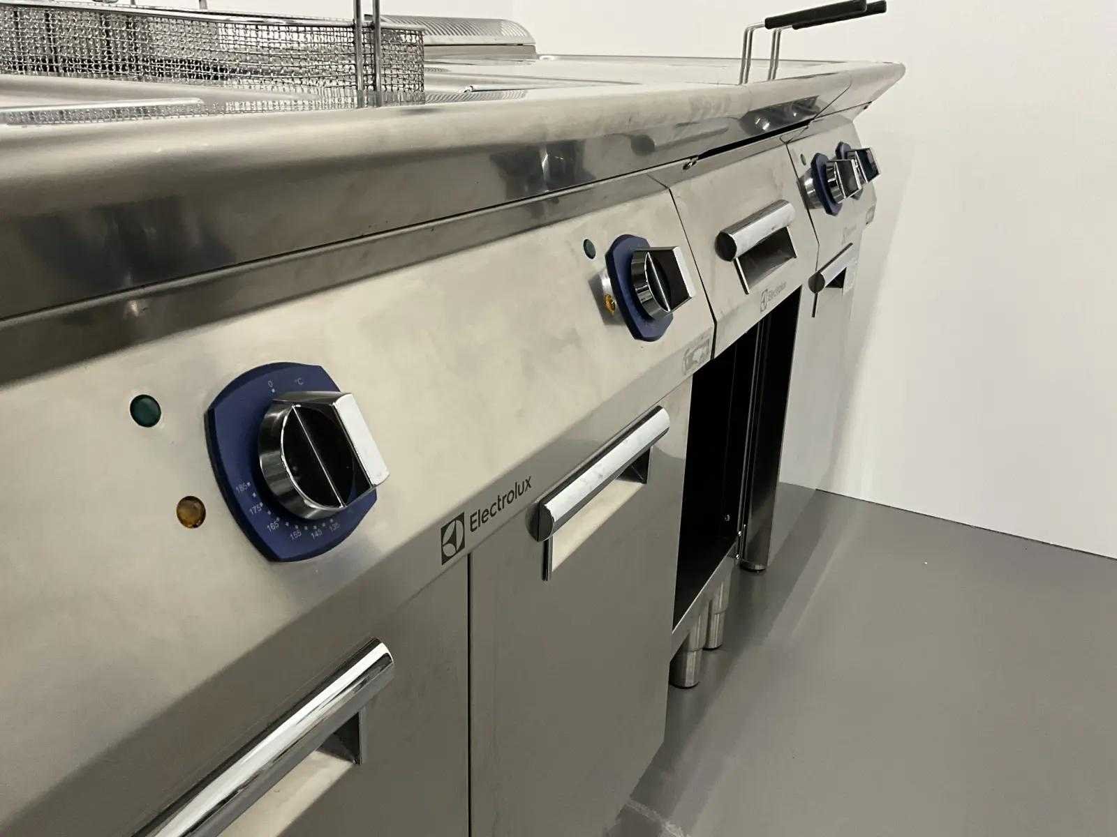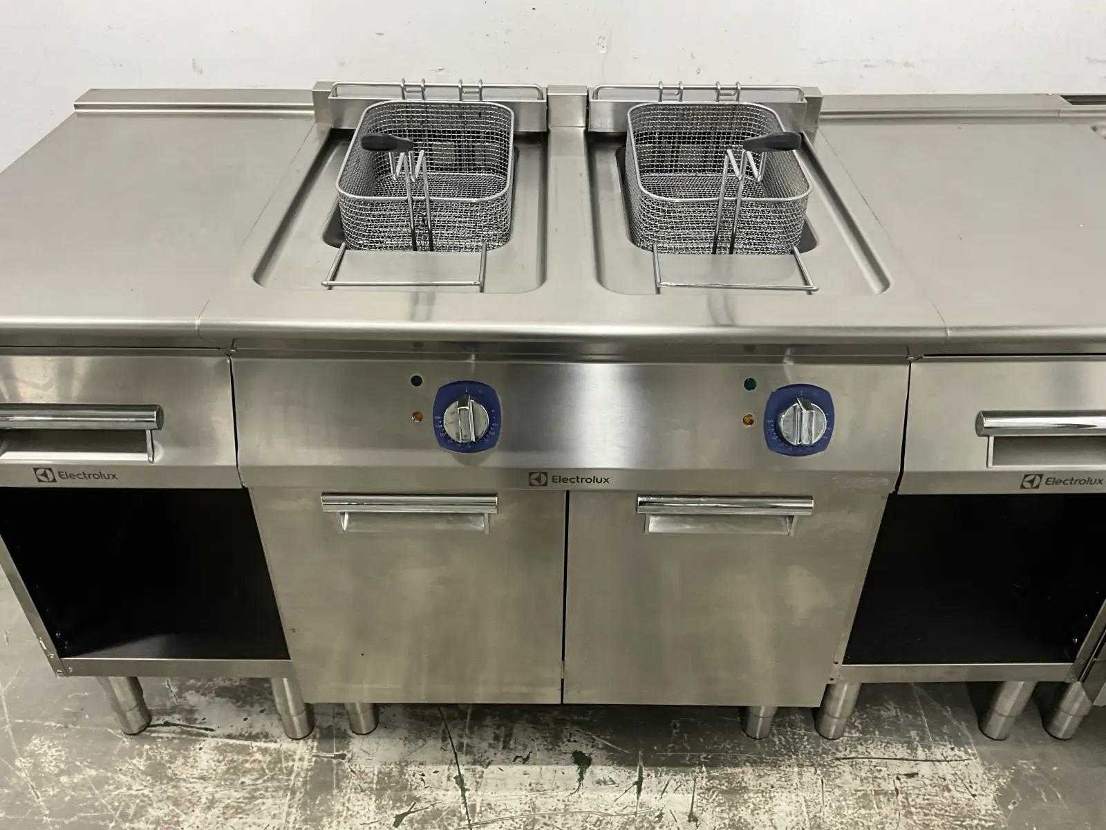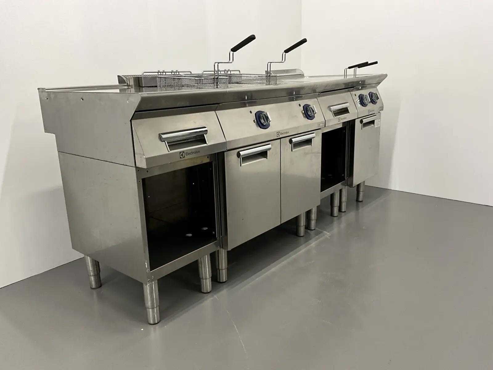 V.v. (v.l.n.r.) neutrale unit, dubbele friteuse (E7FREH2FF0 - 400V - 17,4 kW - 2x 14 Liter), neutrale unit en pastakoker (E7PCED1KF0 - 400V - 6 kW). Merk: Electrolux Lengte: 200cm Breedte: 73cm Hoogte: 90cm Totale afmeting Breedte: 730mm Totale afmeting L: 2000mm Totale afmeting Hoogte: 900mm