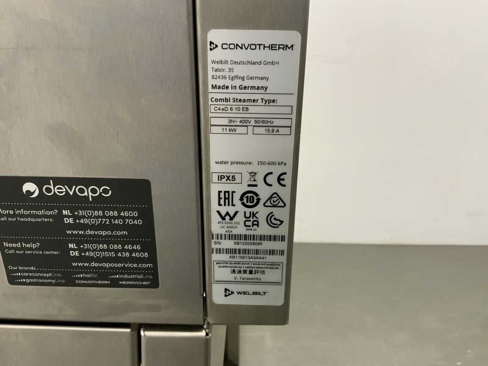 Capaciteit: 6x 1/1 GN Bouwjaar 2023. V.v. verrijdbaar onderstel. De oven is ongebruikt. Merk: Convotherm Type: C4 eD 6.10 EB Totale afmeting L: 875mm Totale afmeting Breedte: 792mm Totale afmeting Hoogte: 786mm Aansluiting: 400V Lengte: 87.5cm Breedte: 79.2cm Hoogte: 78.6cm