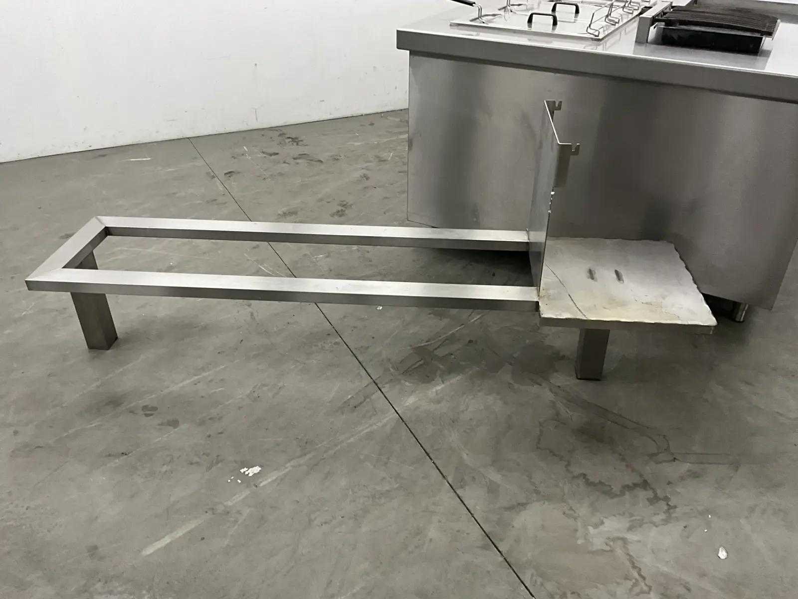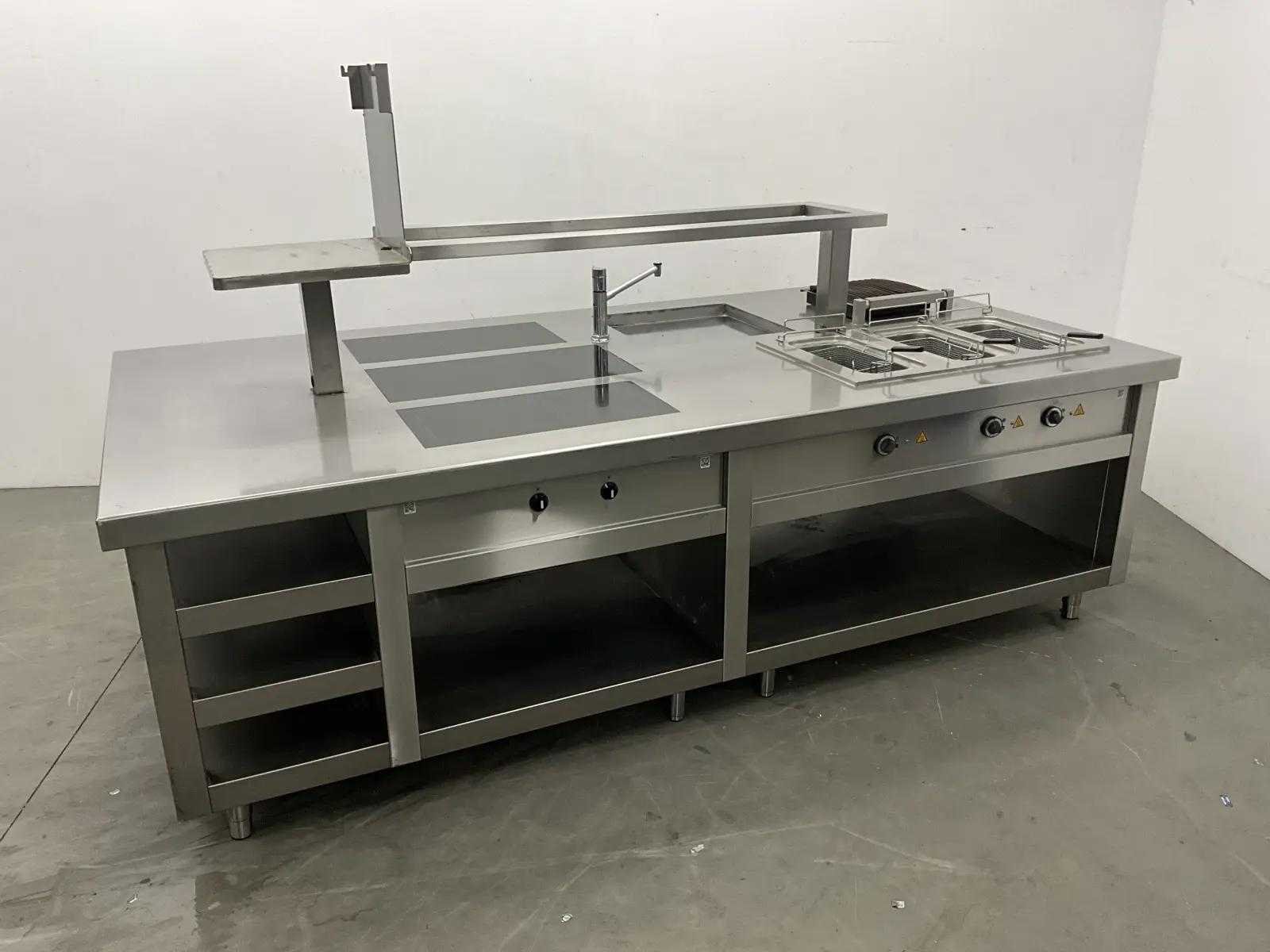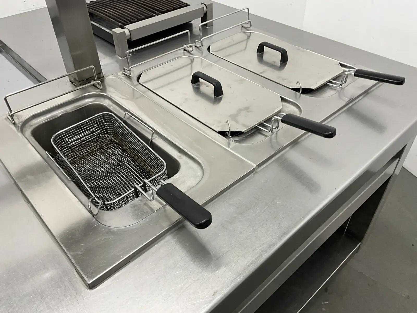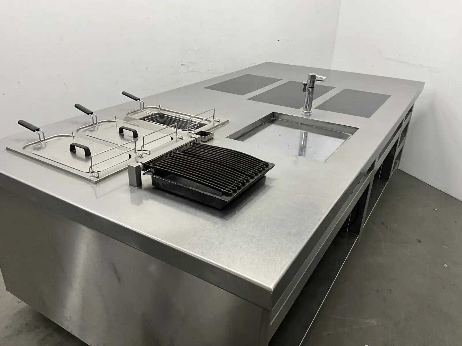 V.v. inductiefornuis, 3 elektrische friteuses, een waterbadgrill, en verchroomde bakplaat. Lengte: 3200cm Breedte: 160cm Hoogte: 190cm Totale afmeting Breedte: 1600mm Totale afmeting L: 32000mm Totale afmeting Hoogte: 1900mm