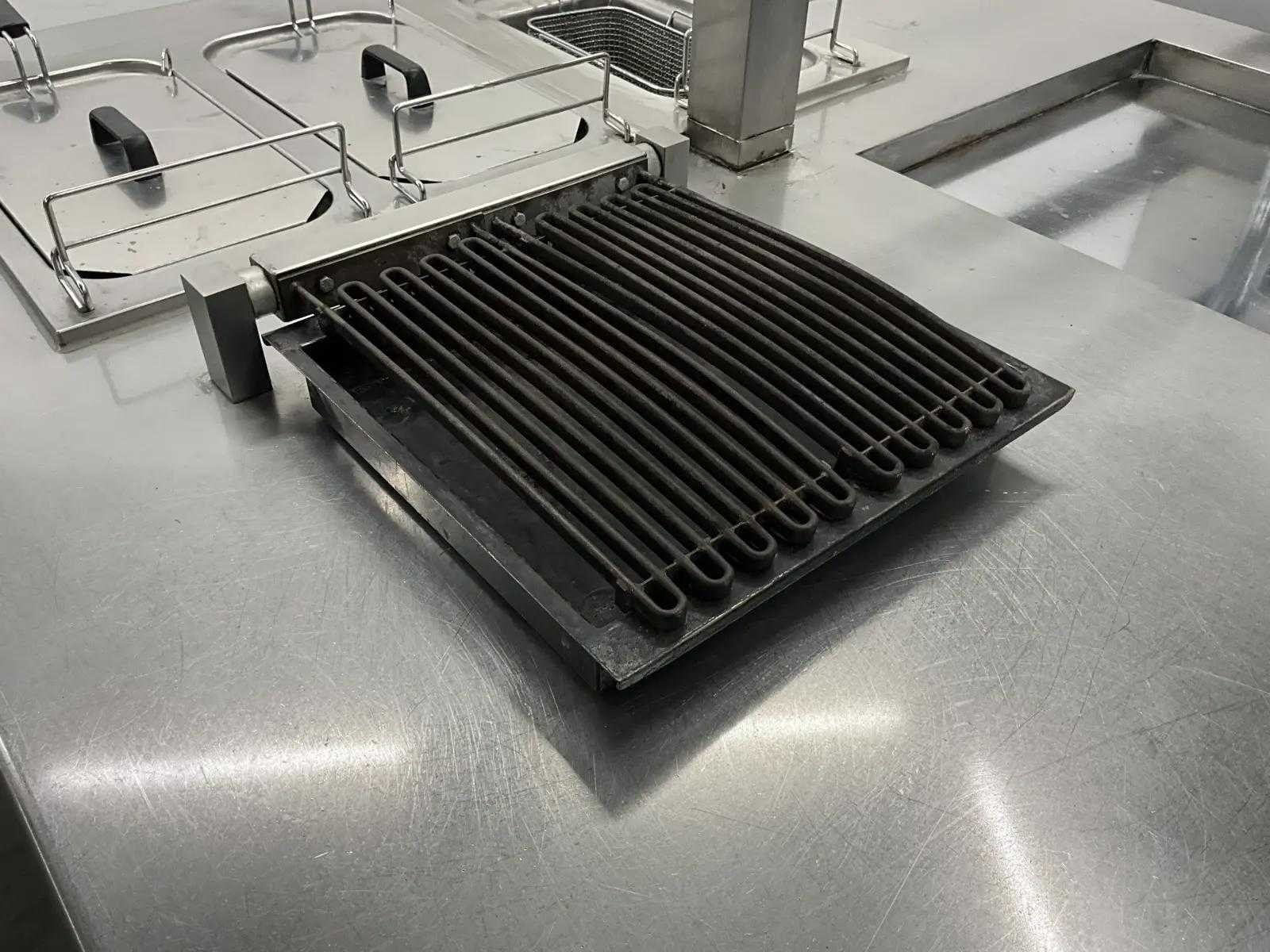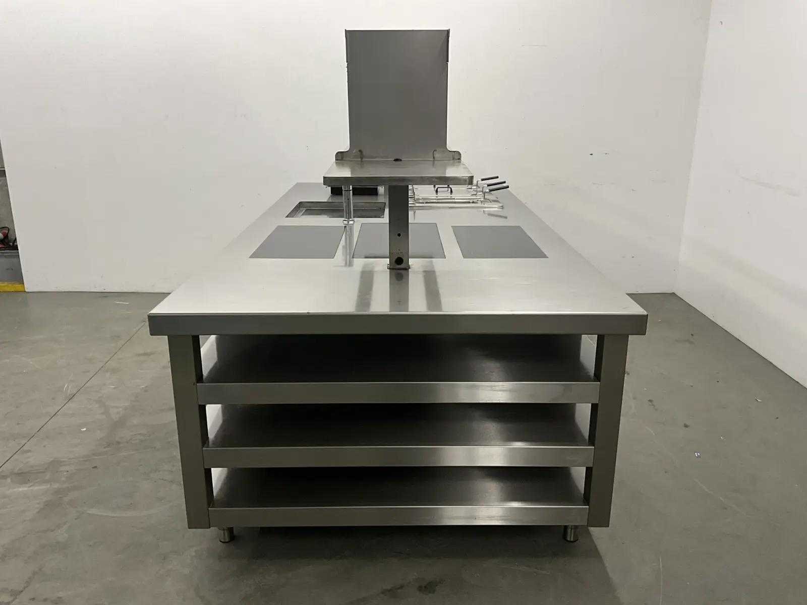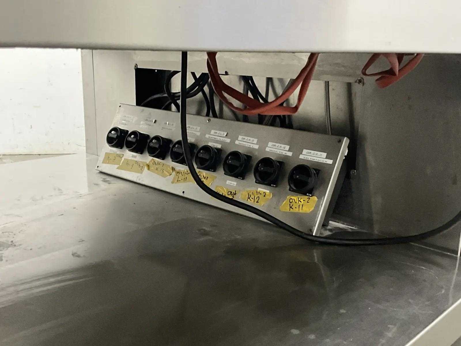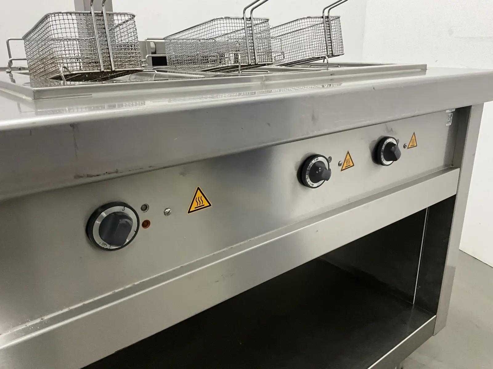 V.v. inductiefornuis, 3 elektrische friteuses, een waterbadgrill, en verchroomde bakplaat. Lengte: 3200cm Breedte: 160cm Hoogte: 190cm Totale afmeting Breedte: 1600mm Totale afmeting L: 32000mm Totale afmeting Hoogte: 1900mm