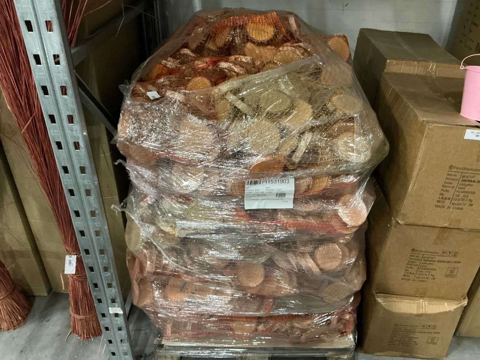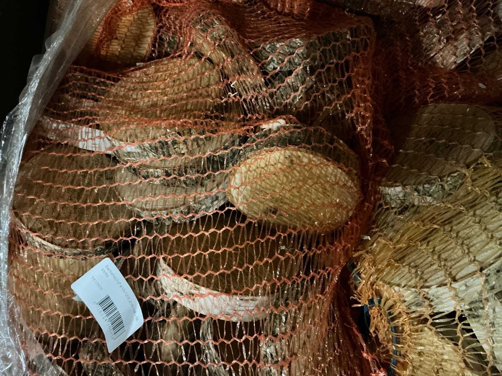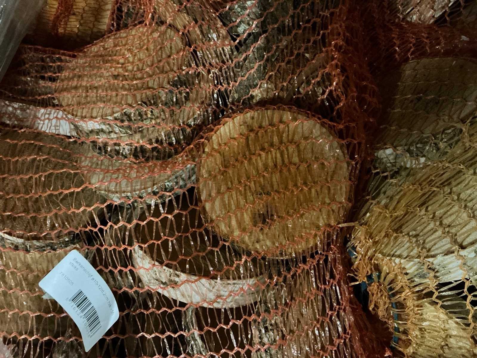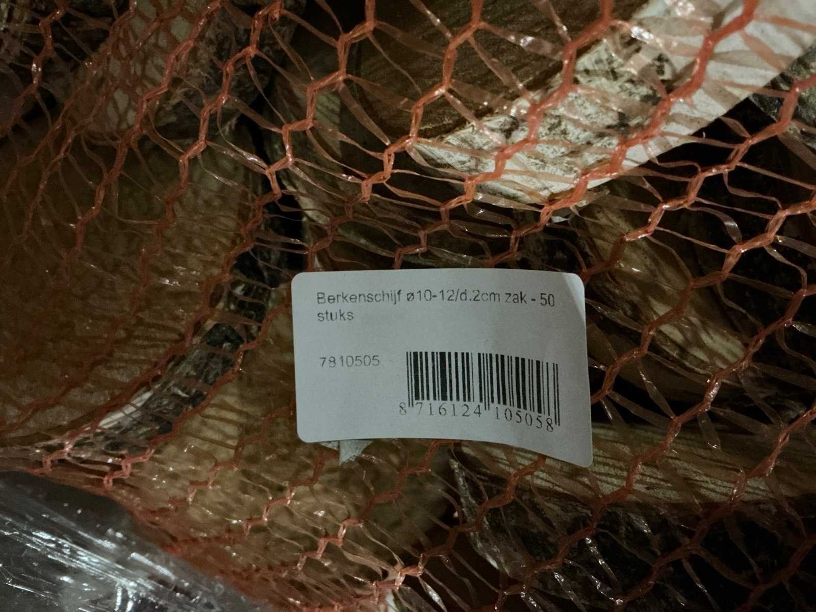 49 zakken, per zak 50 berkenschijven = totaal 2450 berkenschijven. Diameter 10-12/D2cm