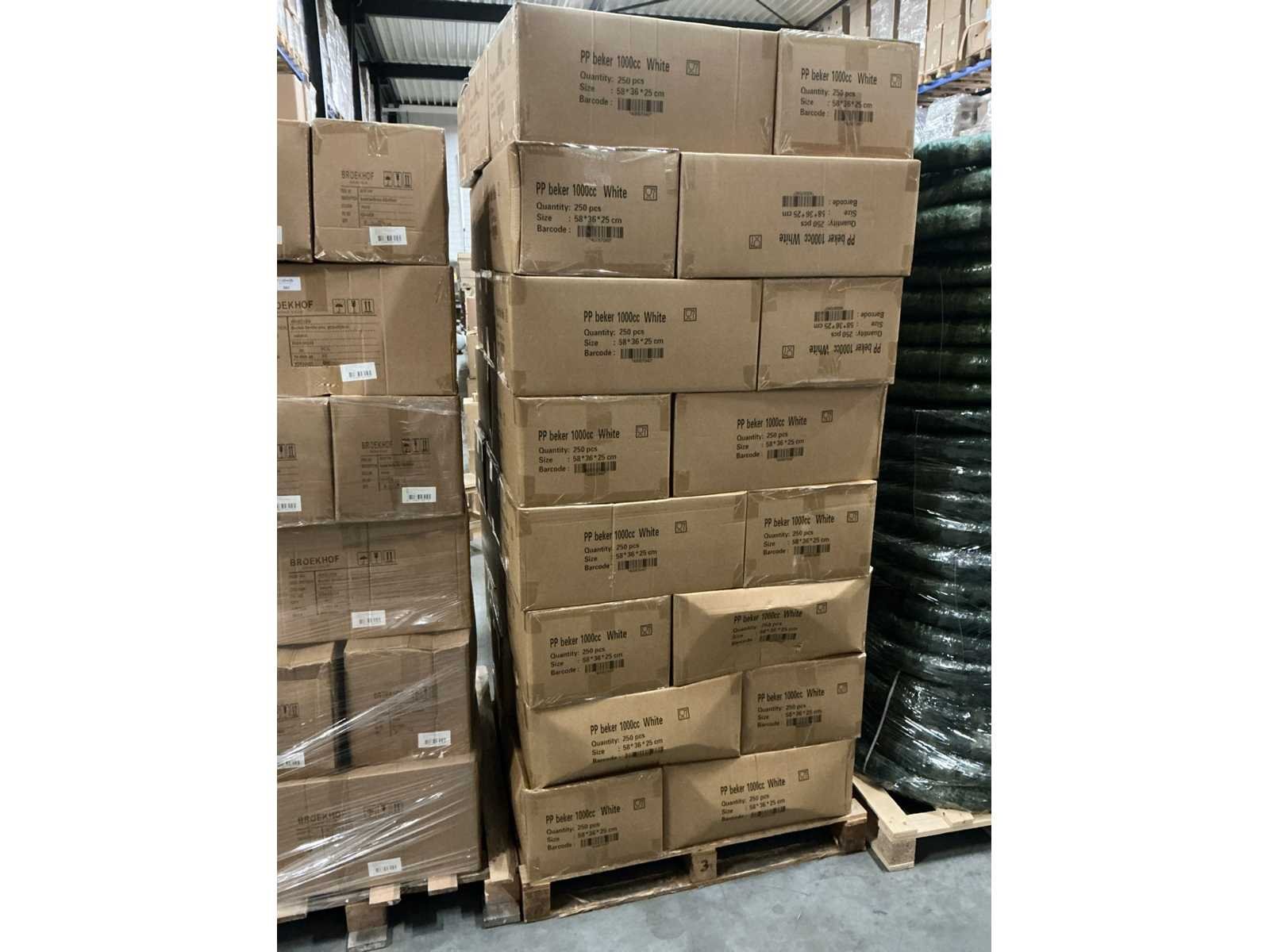 1000cc. 27 dozen 250 bekers per doos = totaal 6750 bekers.