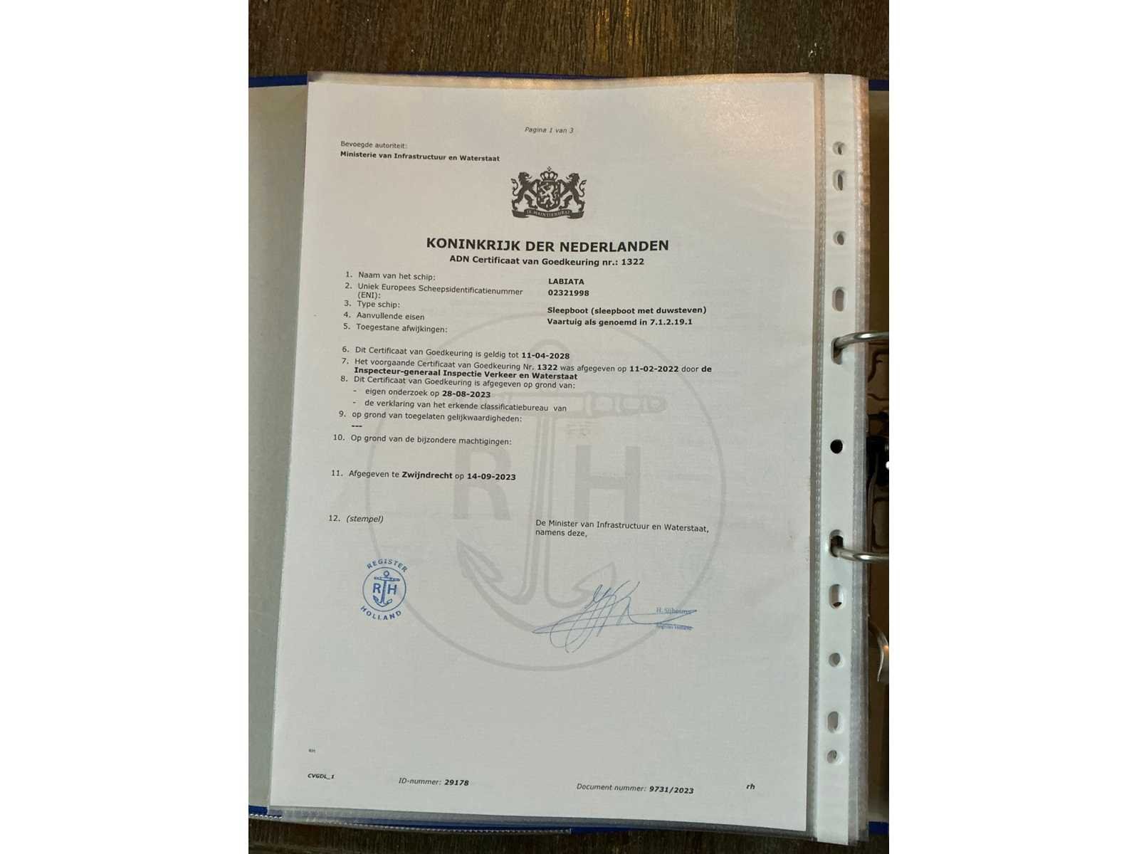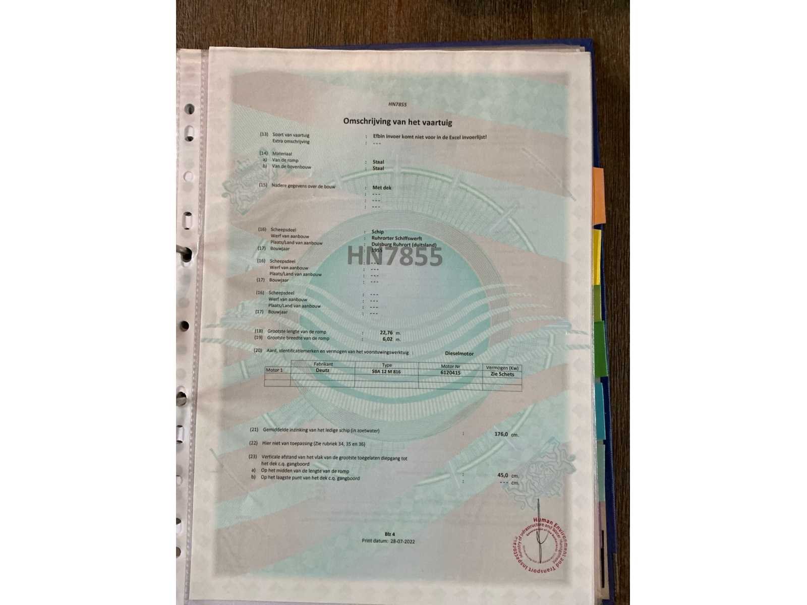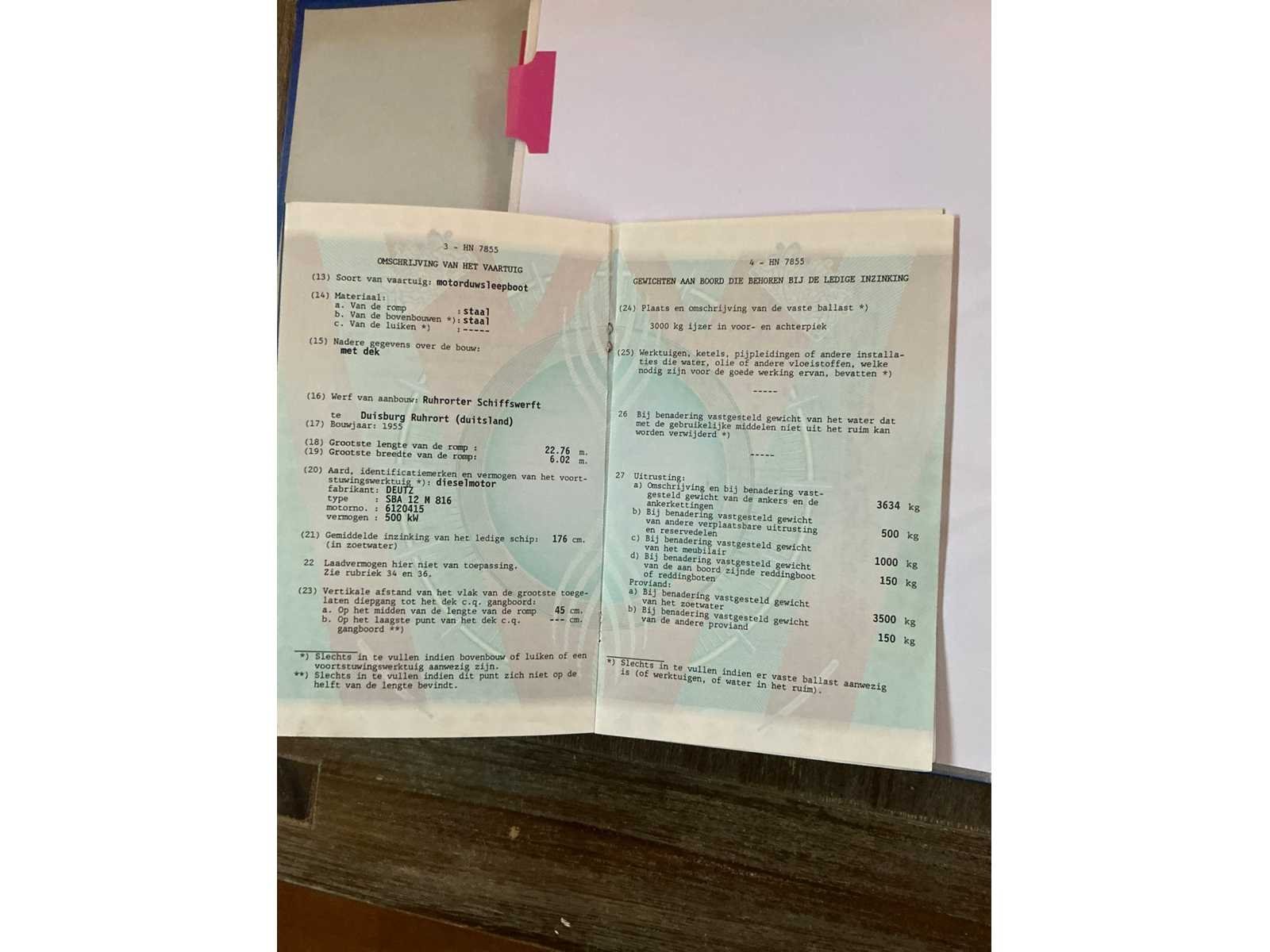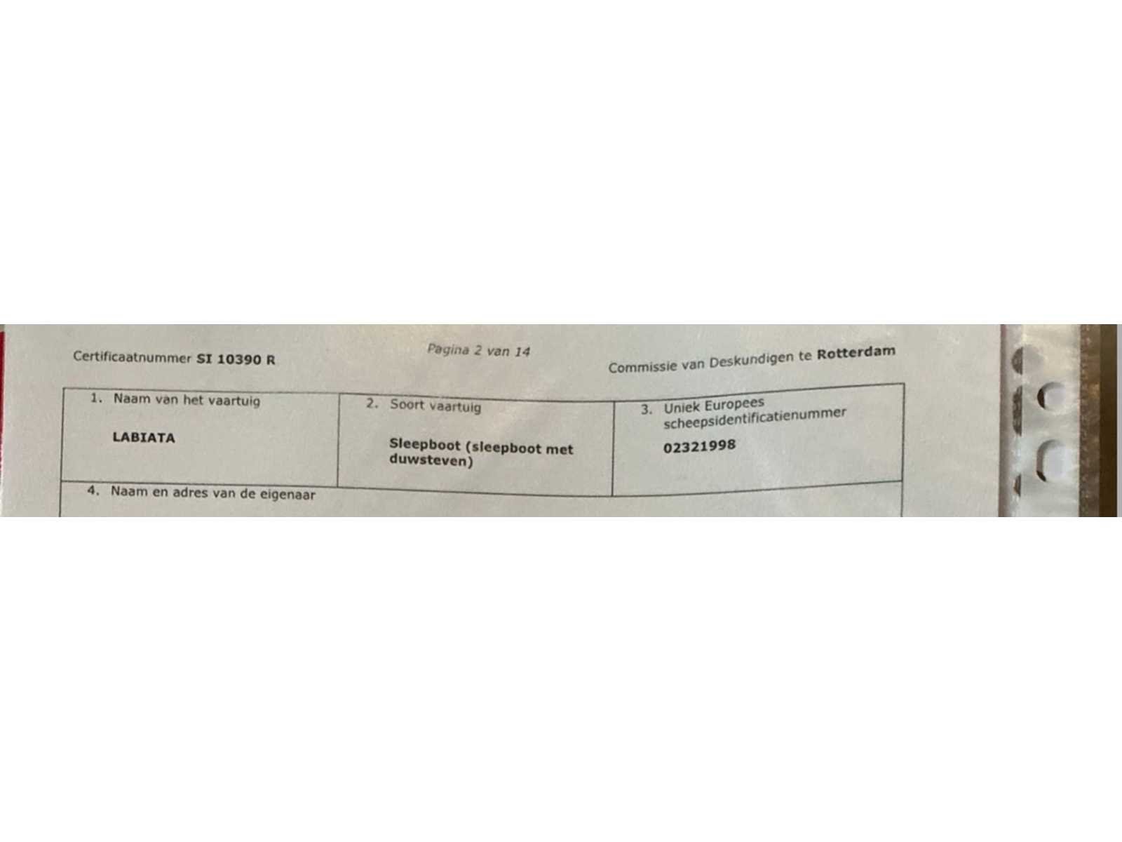 Lengte over alles 23,33meter, breedte over alles 6,2 meter, grootste diepgang 2,2meter, kruiphoogte 7 meter, max 8,5 meter, waterverplaatsing 185,940m3, 500kW Deutz V12(urenstand 8137uur)2x marifoon, 1x kompas, huiddikte rapport bij bezichting beschikbaar(datum rapport 15 april 2021), voorzien van leefruimte Met keukenblok, douche/toiletruimte, 2x slaapkamer, motorruimte, berging achter, hoogte verstelbare stuurhut, diverse repartie/onderhoudsfacturen ter inzage tijdens de bezichtigingsmogelijkheid, duw capaciteit 4250m3. Beperkt ADN(geldig tot 11-04-2028), CVO geldig tot 11-04-2027. Merk: Ruhrorter Schiffswerft Duisburg Type: Labiata Bouwjaar: 1955 Serienummer: 21998BR1994