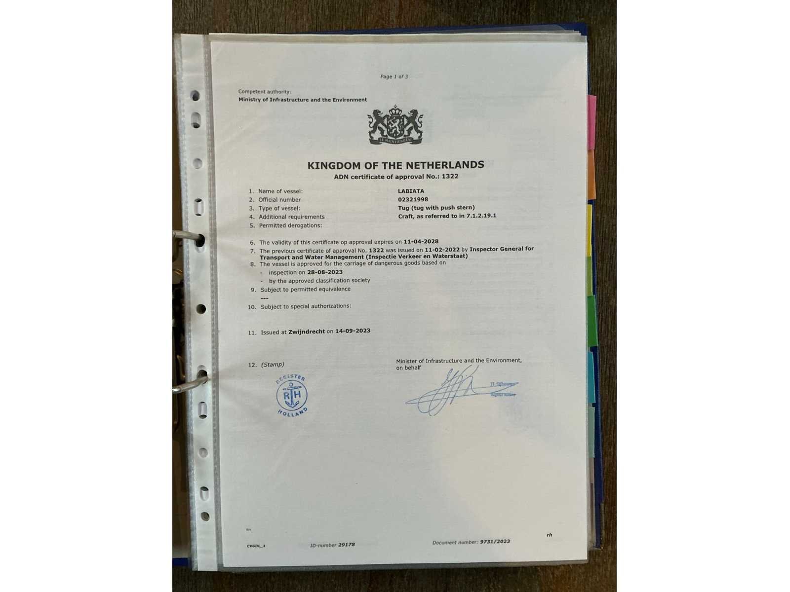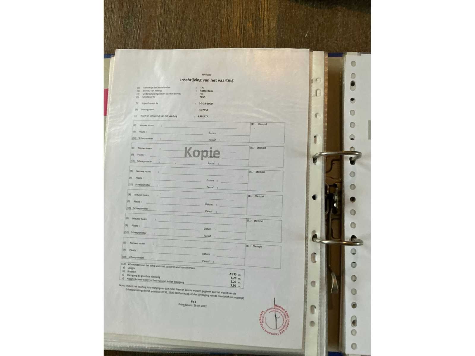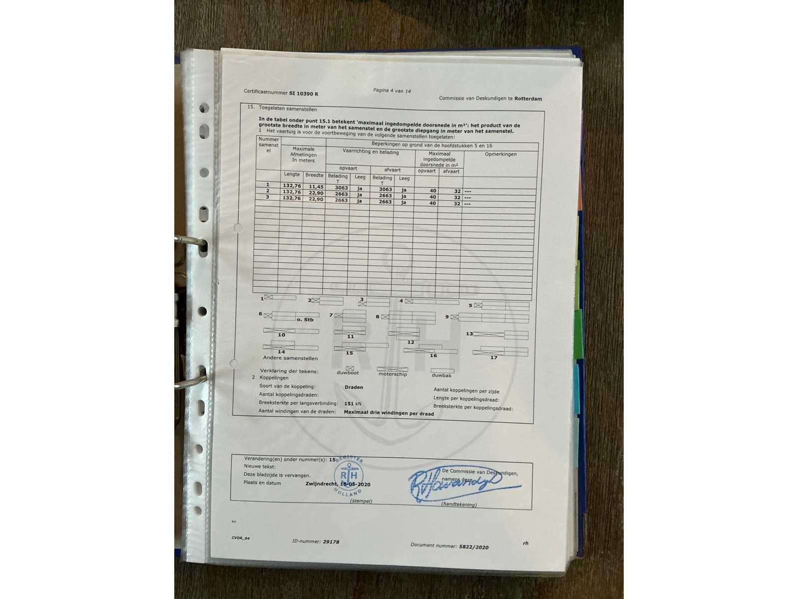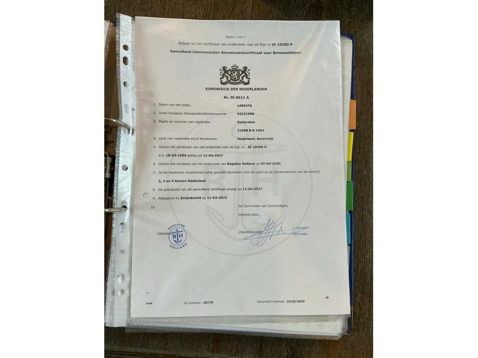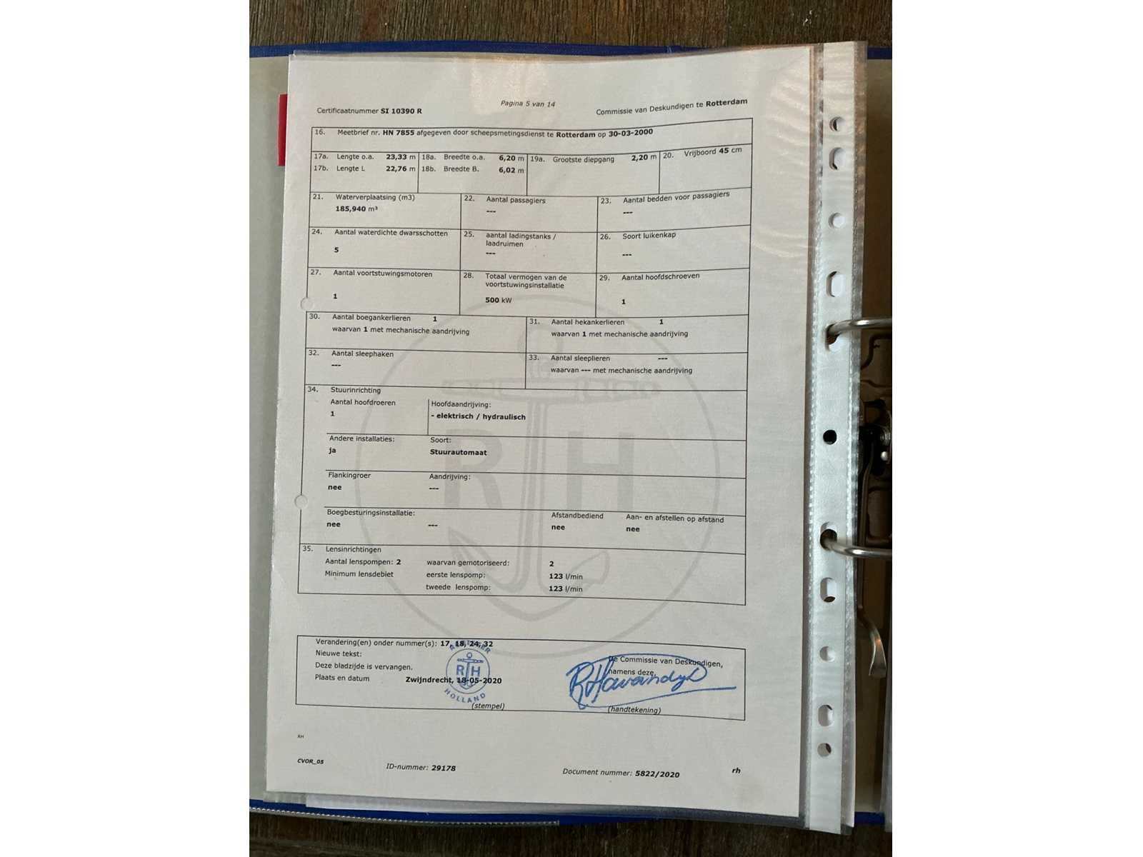 Lengte over alles 23,33meter, breedte over alles 6,2 meter, grootste diepgang 2,2meter, kruiphoogte 7 meter, max 8,5 meter, waterverplaatsing 185,940m3, 500kW Deutz V12(urenstand 8137uur)2x marifoon, 1x kompas, huiddikte rapport bij bezichting beschikbaar(datum rapport 15 april 2021), voorzien van leefruimte Met keukenblok, douche/toiletruimte, 2x slaapkamer, motorruimte, berging achter, hoogte verstelbare stuurhut, diverse repartie/onderhoudsfacturen ter inzage tijdens de bezichtigingsmogelijkheid, duw capaciteit 4250m3. Beperkt ADN(geldig tot 11-04-2028), CVO geldig tot 11-04-2027. Merk: Ruhrorter Schiffswerft Duisburg Type: Labiata Bouwjaar: 1955 Serienummer: 21998BR1994