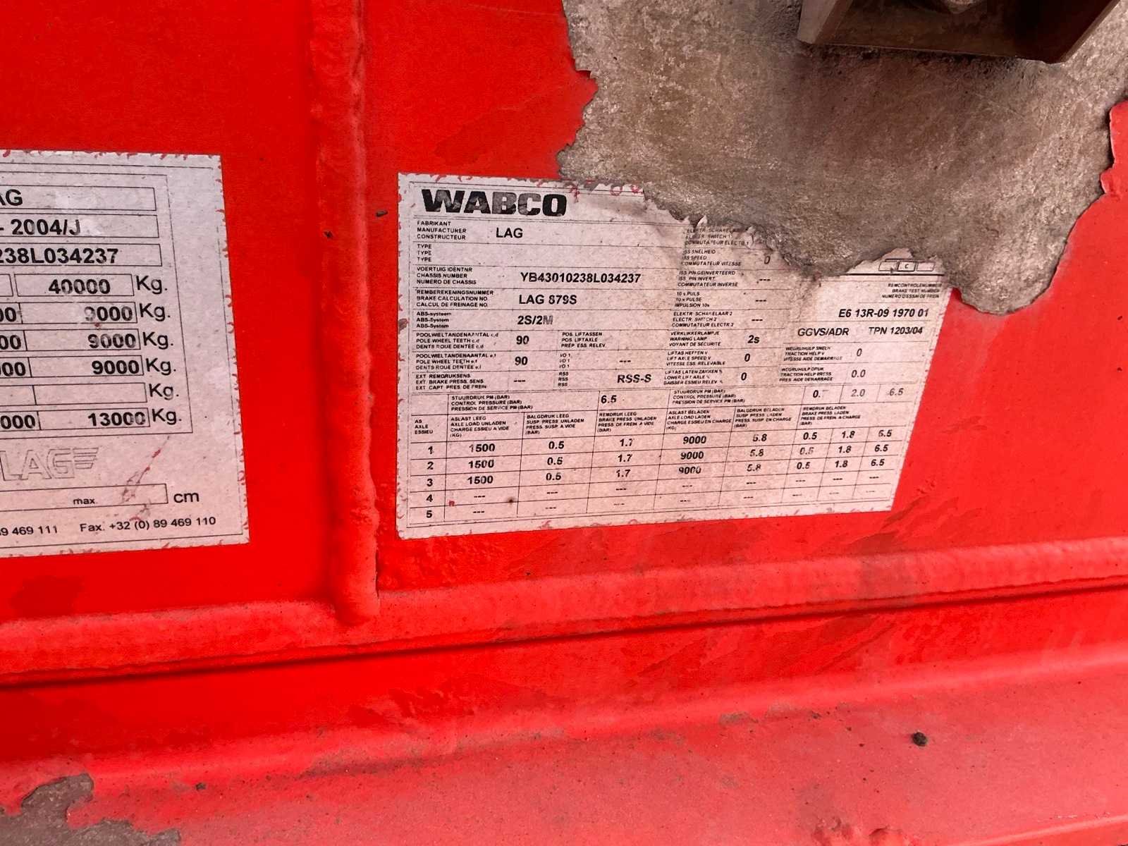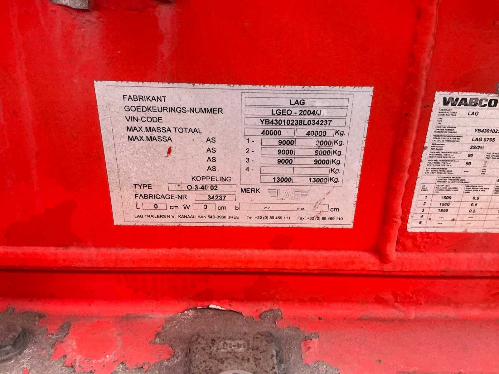 Opgelet Nederlandse boorddocumenten, APK VERVALDATUM: 31/03/2026, massa ledig voertuig: 7000kg, Max.Massa voertuig: 40.000kg, laadvermogen,: 33.000kg Merk: LAG Type: O34002 Bouwjaar: 2008 Chassisnummer VIN: YB43010238L034237 Kenteken: OK25FJ Datum eerste toelating (NL): 13/03/2008 APK vervaldatum: 31/03/2026