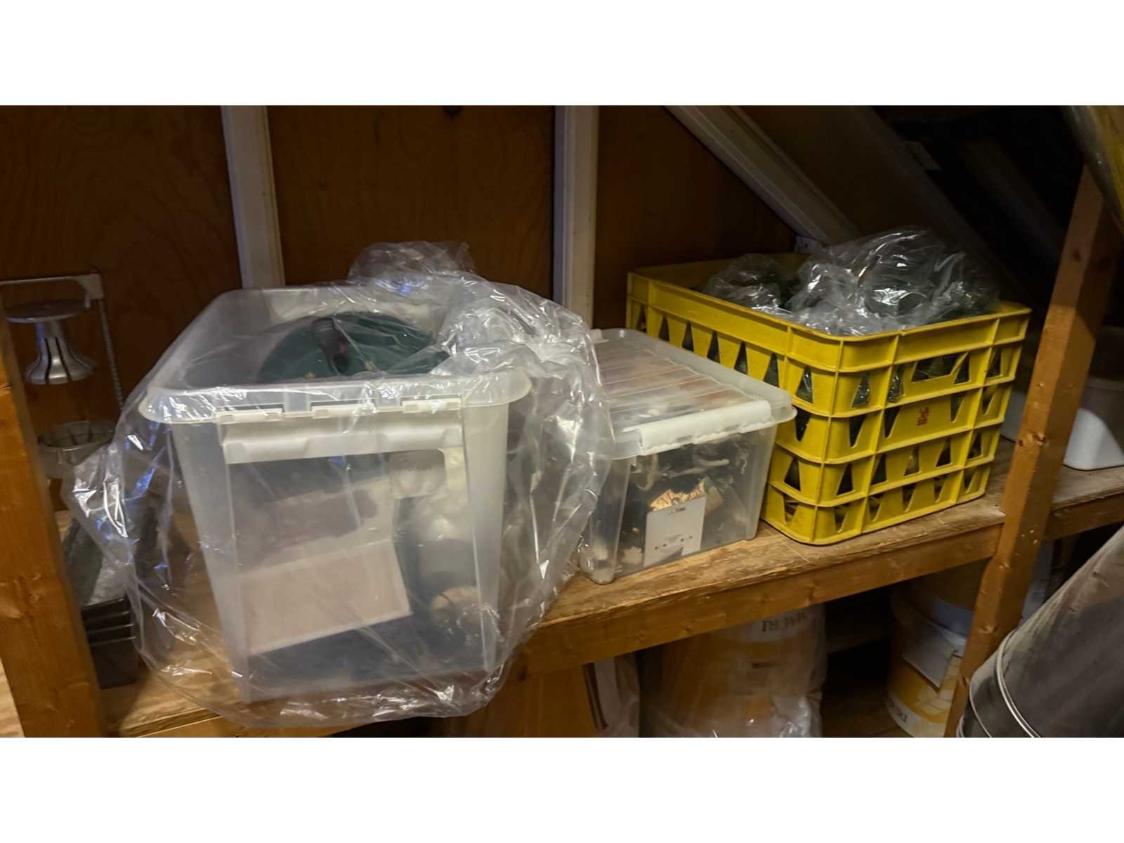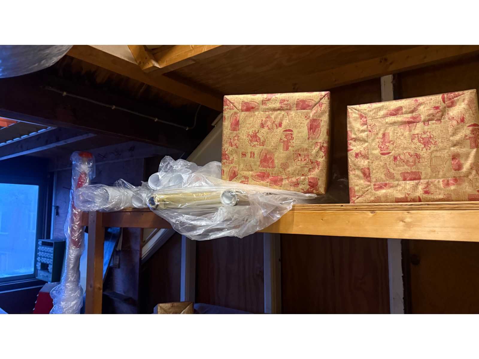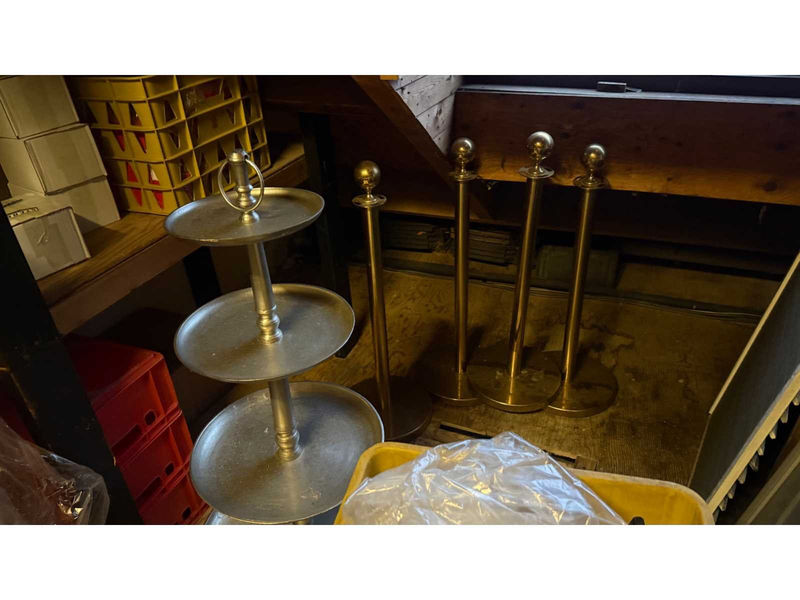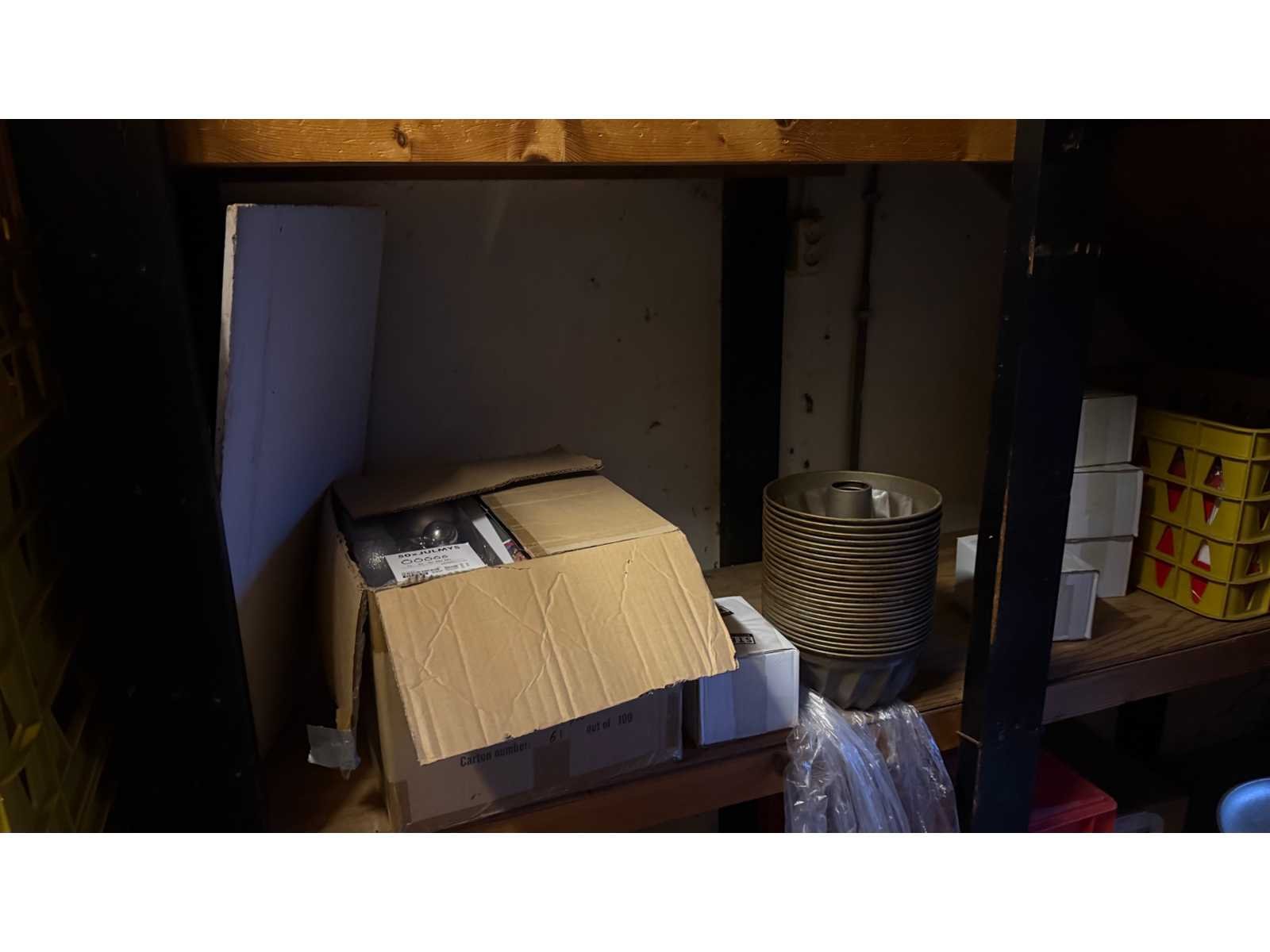 Inhoud bestaande uit seizoensdecoratie, entree design palen, bakvormen, Sonneveld kratten, krenten waskratten, verpakkingsmateriaal, etc. Exclusief koelmotoren. Dit kavel staat op een etagevloer. Er is een trap aanwezig. Zonder kavels 124, 125, 126 en 127.
