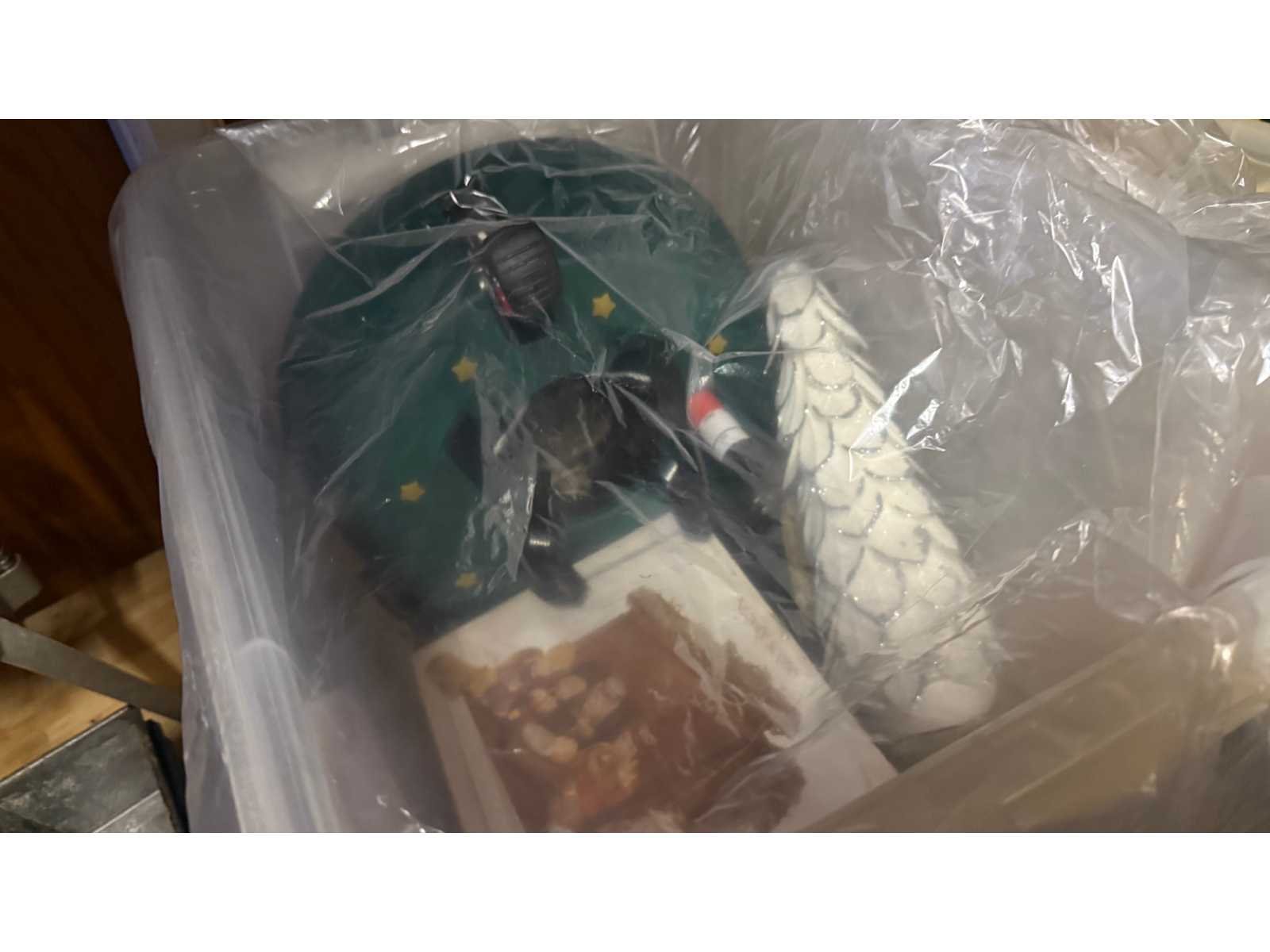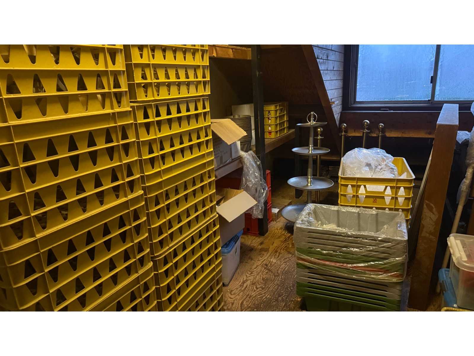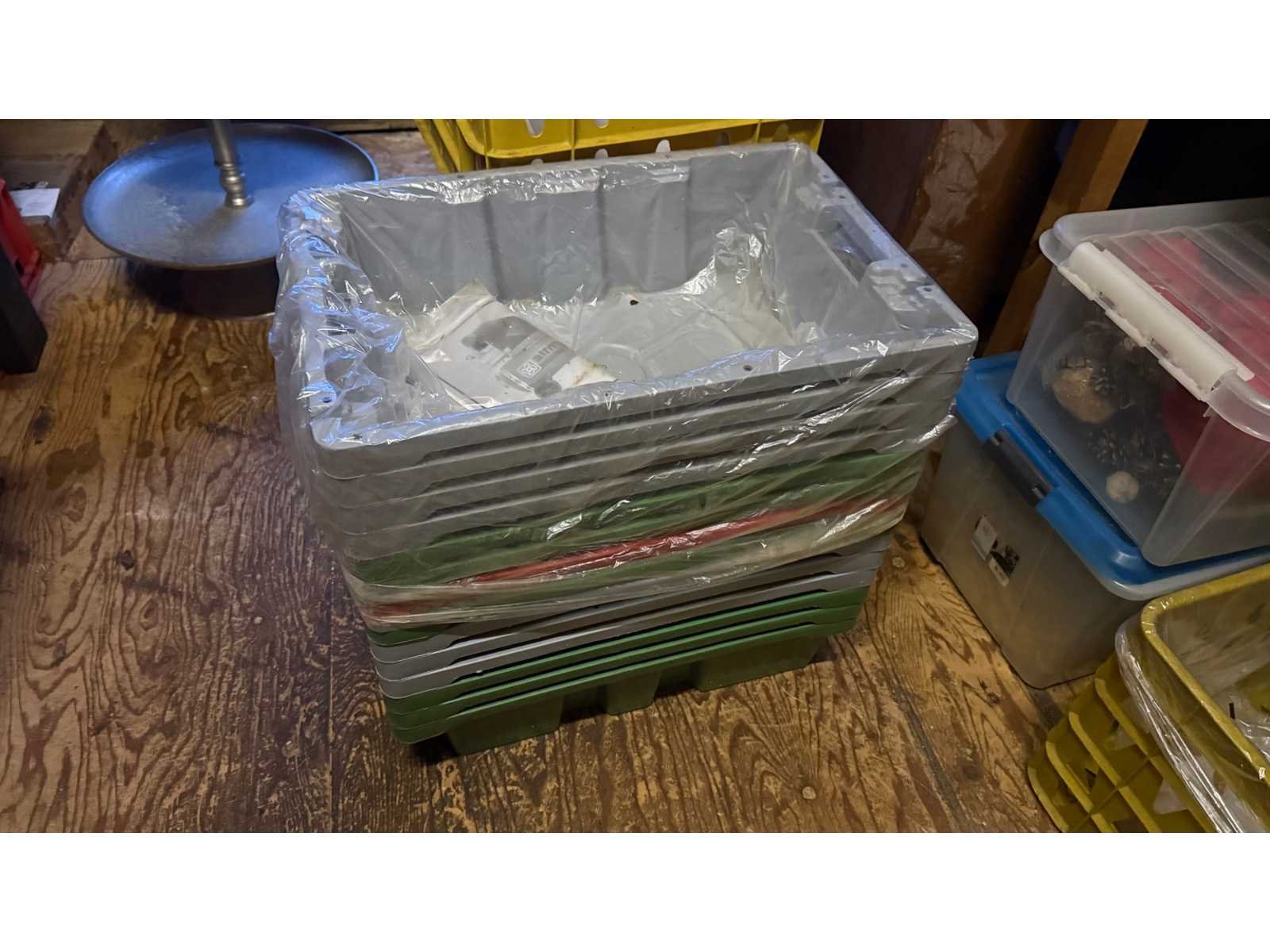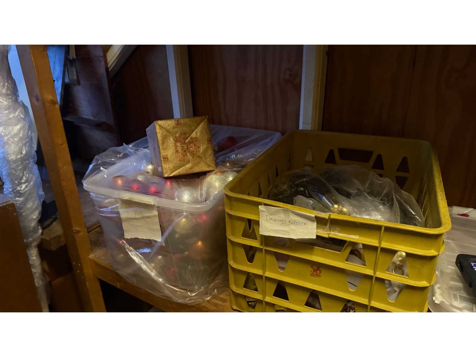 Inhoud bestaande uit seizoensdecoratie, entree design palen, bakvormen, Sonneveld kratten, krenten waskratten, verpakkingsmateriaal, etc. Exclusief koelmotoren. Dit kavel staat op een etagevloer. Er is een trap aanwezig. Zonder kavels 124, 125, 126 en 127.