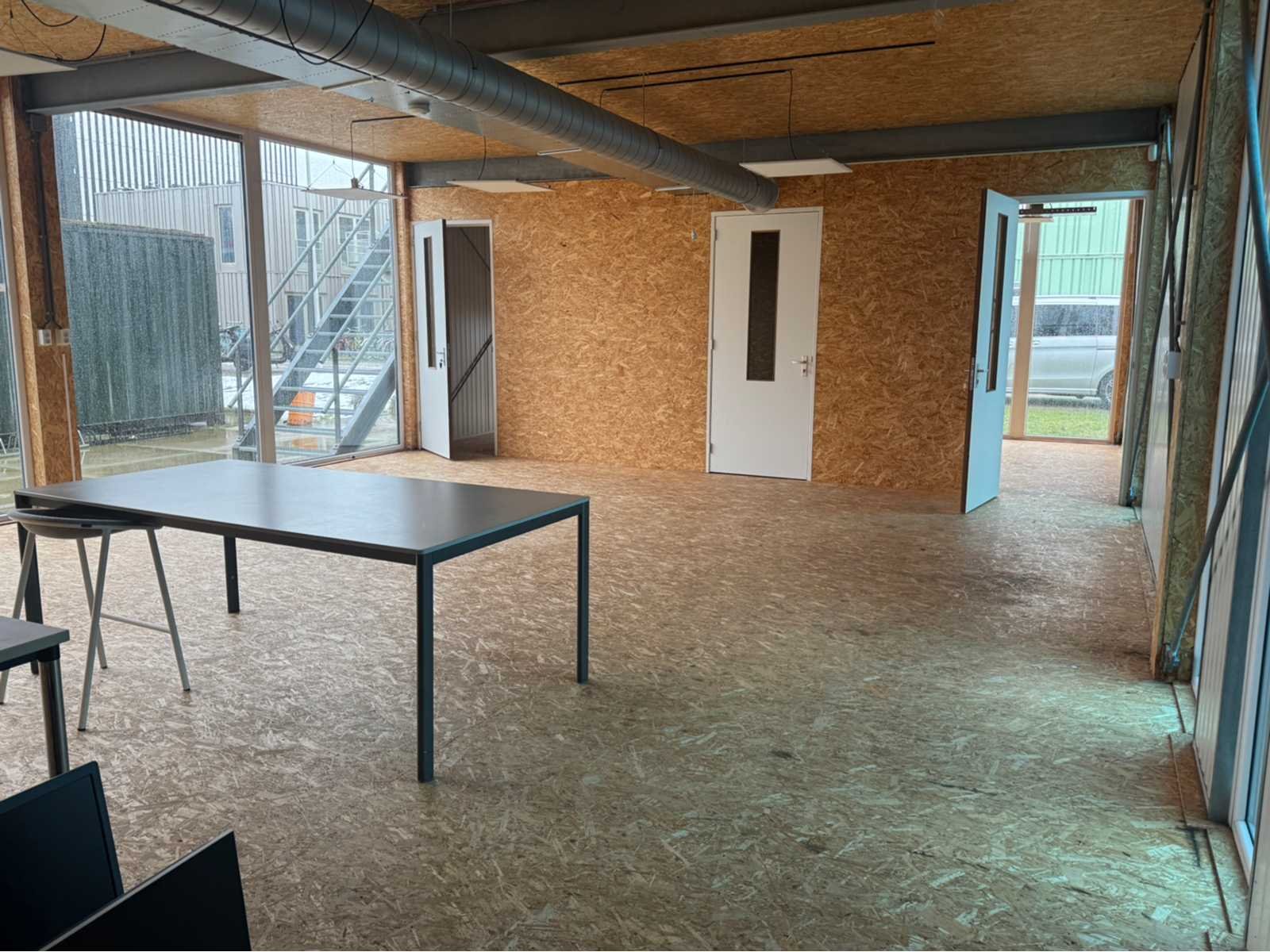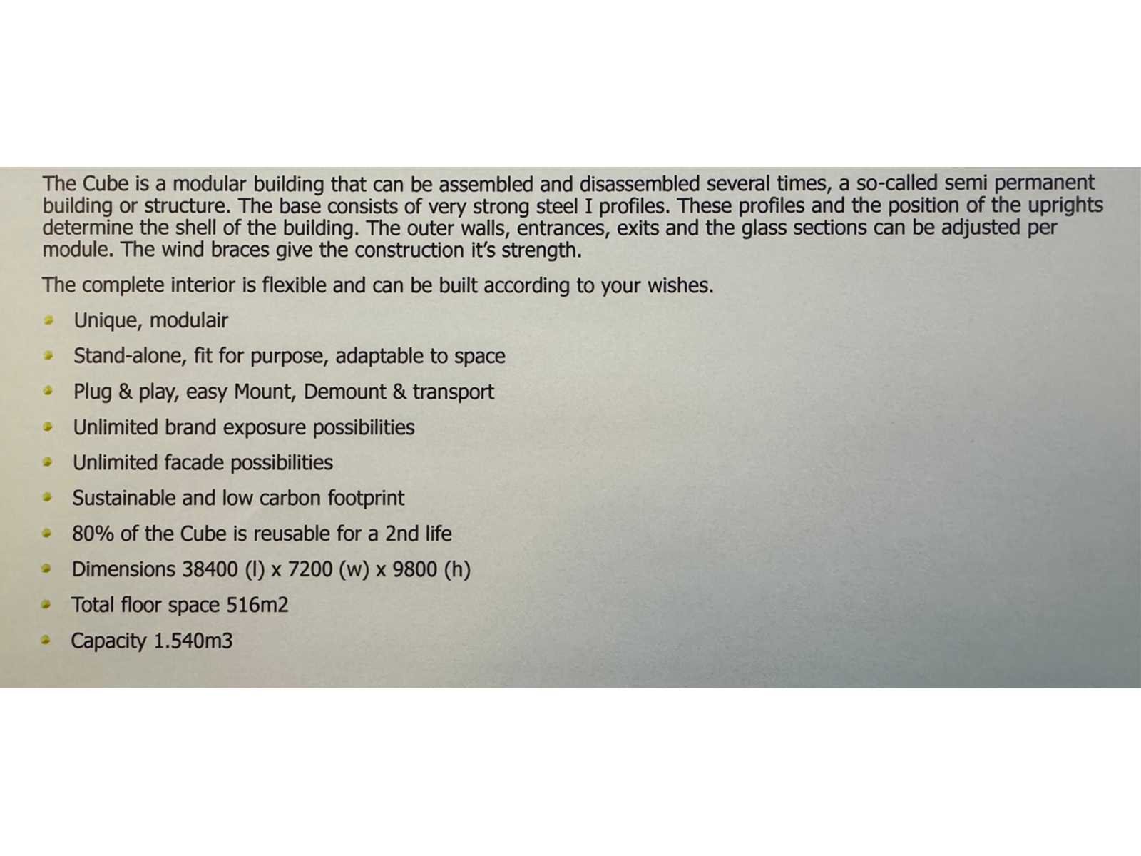Complete staalconstructie; bestaande uit 2 verdiepingen en 1 dakterras; gemaakt van IPE binten; HEA binten; U-balken; schoren; windverbanden; liggers; staanders; gehele staalconstructie is Volblad verzinkt; dak van geïsoleerde sandwichpanelen; gevels van geïsoleerde sandwichpanelen en dubbel glas raampartijen; het gebouw is verdeeld in diverse ruimtes; alle tussen gevels worden meegeleverd; houten binnen beplating van gevels en plafonds worden verpakt; deuren van toilet; deuren van tussenruimtes; deuren in de gevels; en alle andere deuren zitten erbij; verdere toebehoren zoals kabelgoten; bouten; moeren; Parkers en verdere bevestiging materialen worden meegeleverd; apparatuur in de technische ruimte wordt meegeleverd; alle ruimtes voorzien van verlichting; dit wordt gedemonteerd en meegeleverd; bijna alle ruimtes voorzien van airco installatie; airco’s zijn compleet met binnen unit; buiten unit en afstandsbediening; met 1 trap in het gebouw en 1 trap buiten het gebouw; dak 1e verdieping met licht koepel; met fliso trap naar het dakterras; staal is genummerd; met aanwezige en bijhorende tekeningen; object wordt aangeboden zonder het sanitair; bekabeling met toebehoren op meerprijs (I.v.m. bewaren en netjes oprollen) het geheel wordt gedemonteerd en transport klaar gemaakt door de verkoper; afhalen Amsterdam; kijkdag en afhalen is geheel op afspraak; laden in overleg februari/ maart; Bouwjaar: 2019 Totaal oppervlakte: 516m² Overheaddeuren: 0 Totale afmeting L: 38400mm Totale afmeting Breedte: 7200mm Totale afmeting Hoogte: 9800mm