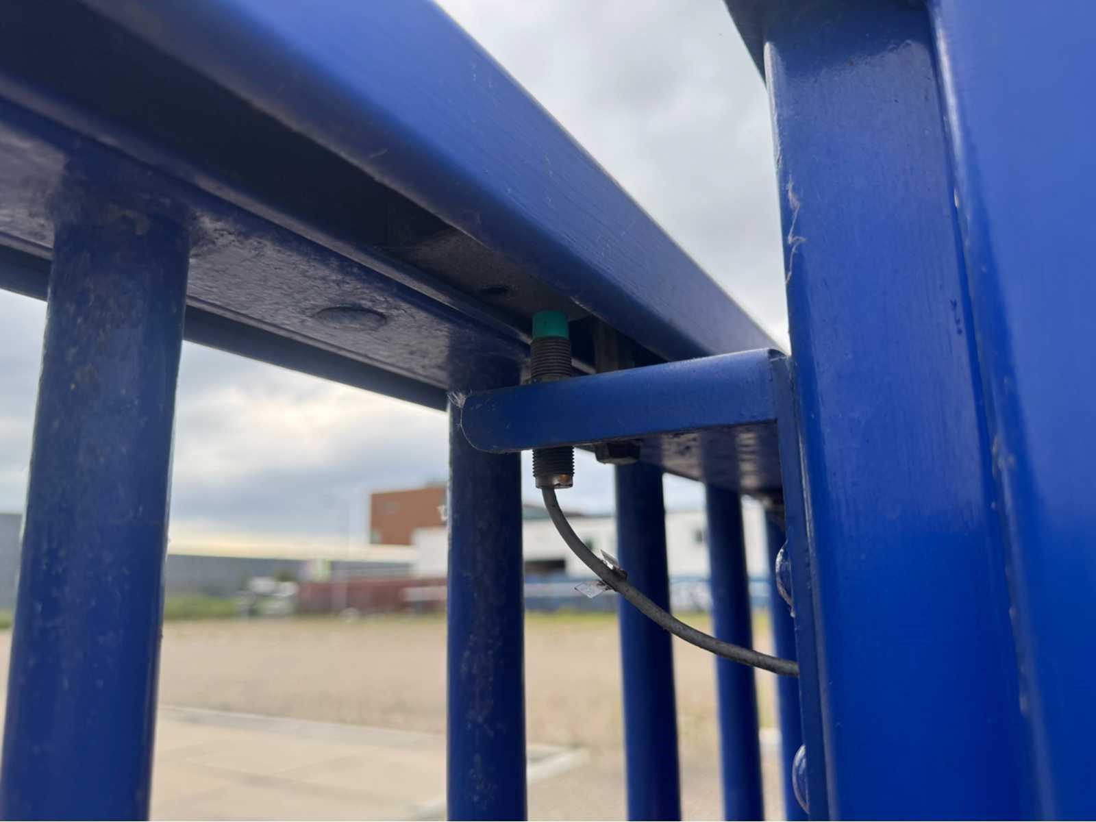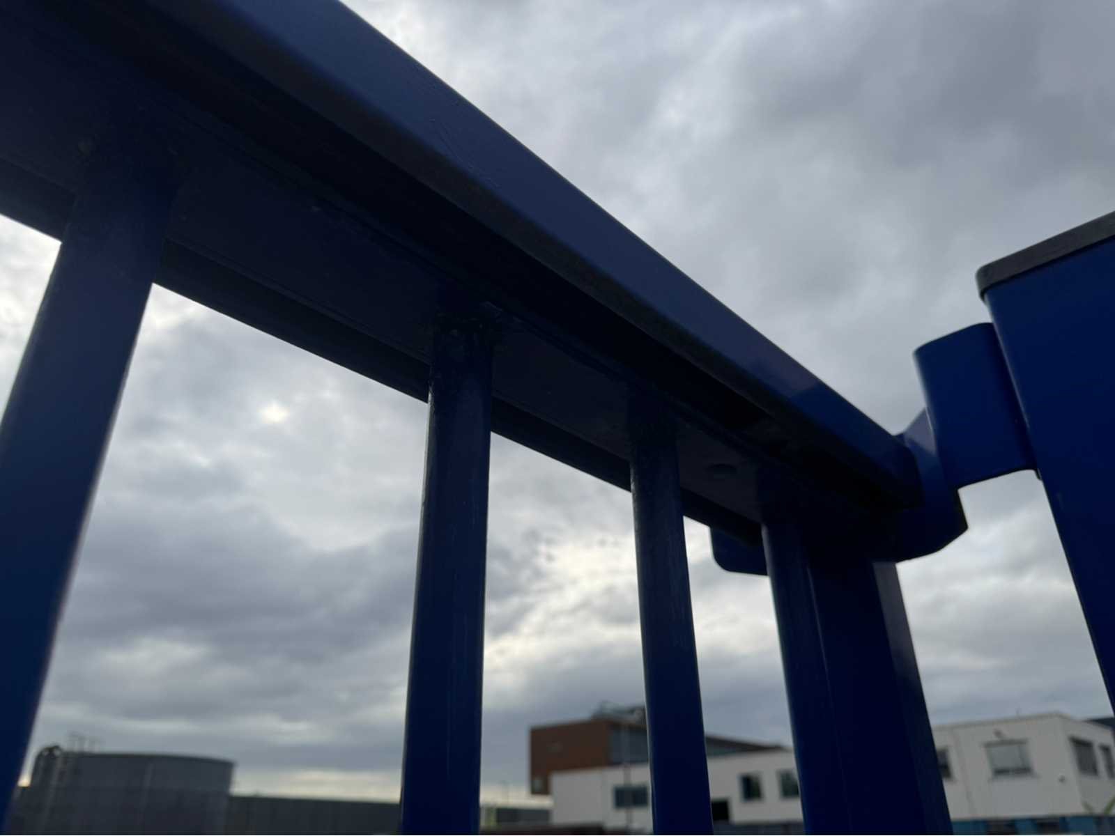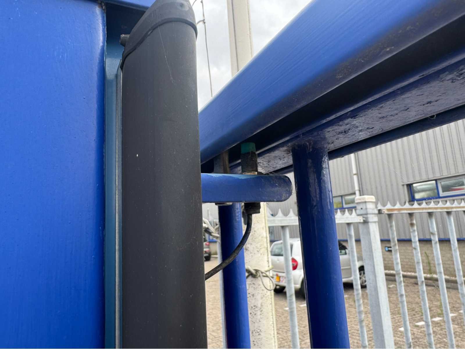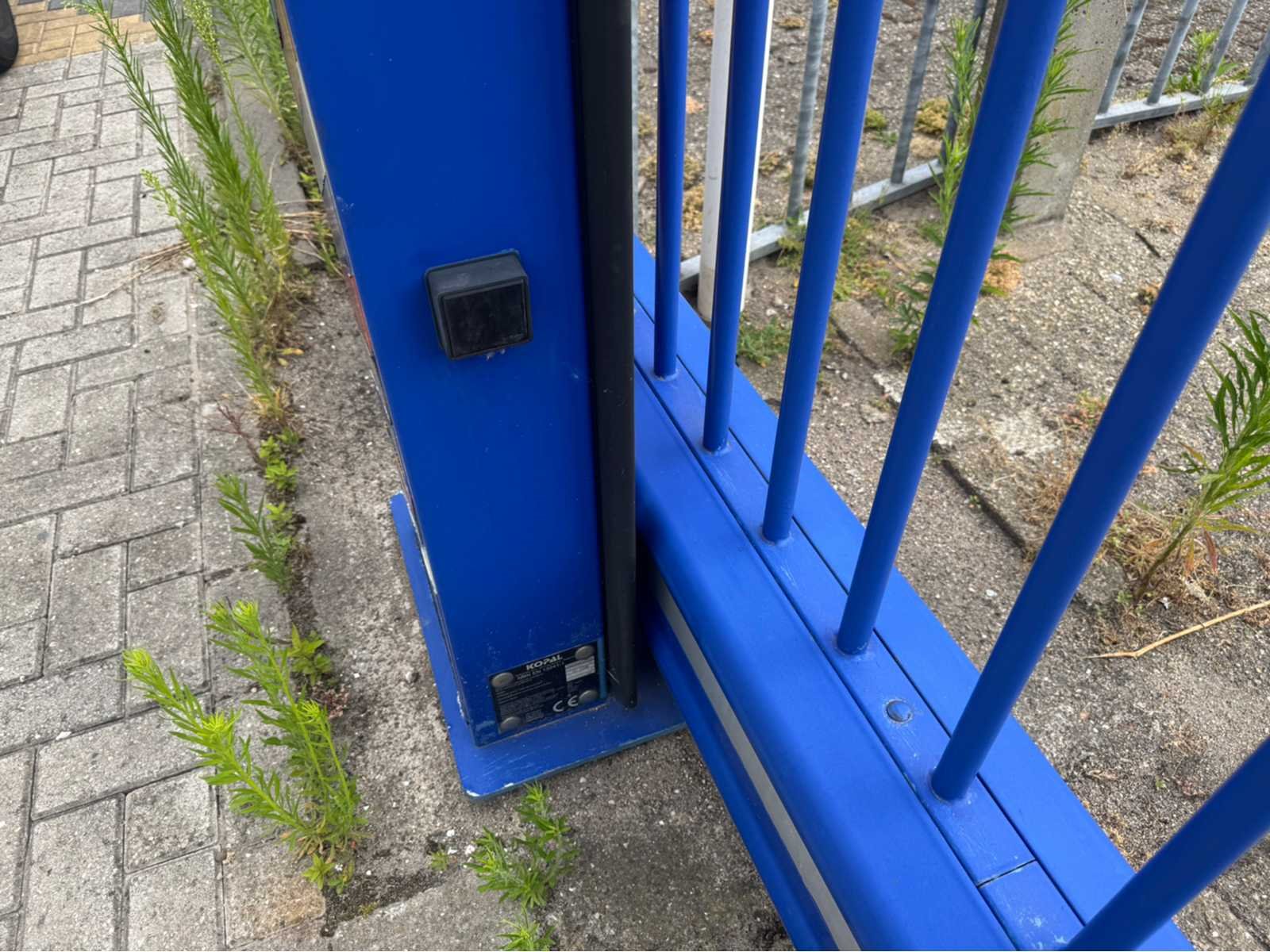 Hek opening is ca. 8000 mm; totale hek lengte ca. 10300 mm; hek hoogte 2100 mm; met portalen; te openen met code; blauw gepoedercoat hekwerk; wordt gedemonteerd en transport klaar gemaakt door verkoper; kijkdag en afhalen op afspraak; laden in overleg; februari / maart; Merk: Kopal