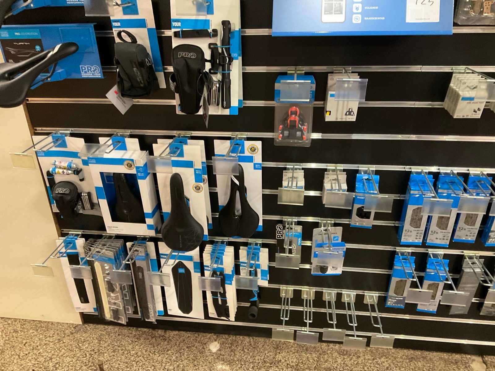 Partij fietsonderdelen in wandstelling, incl wandstelling