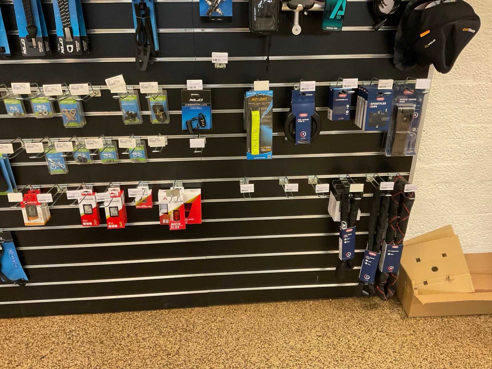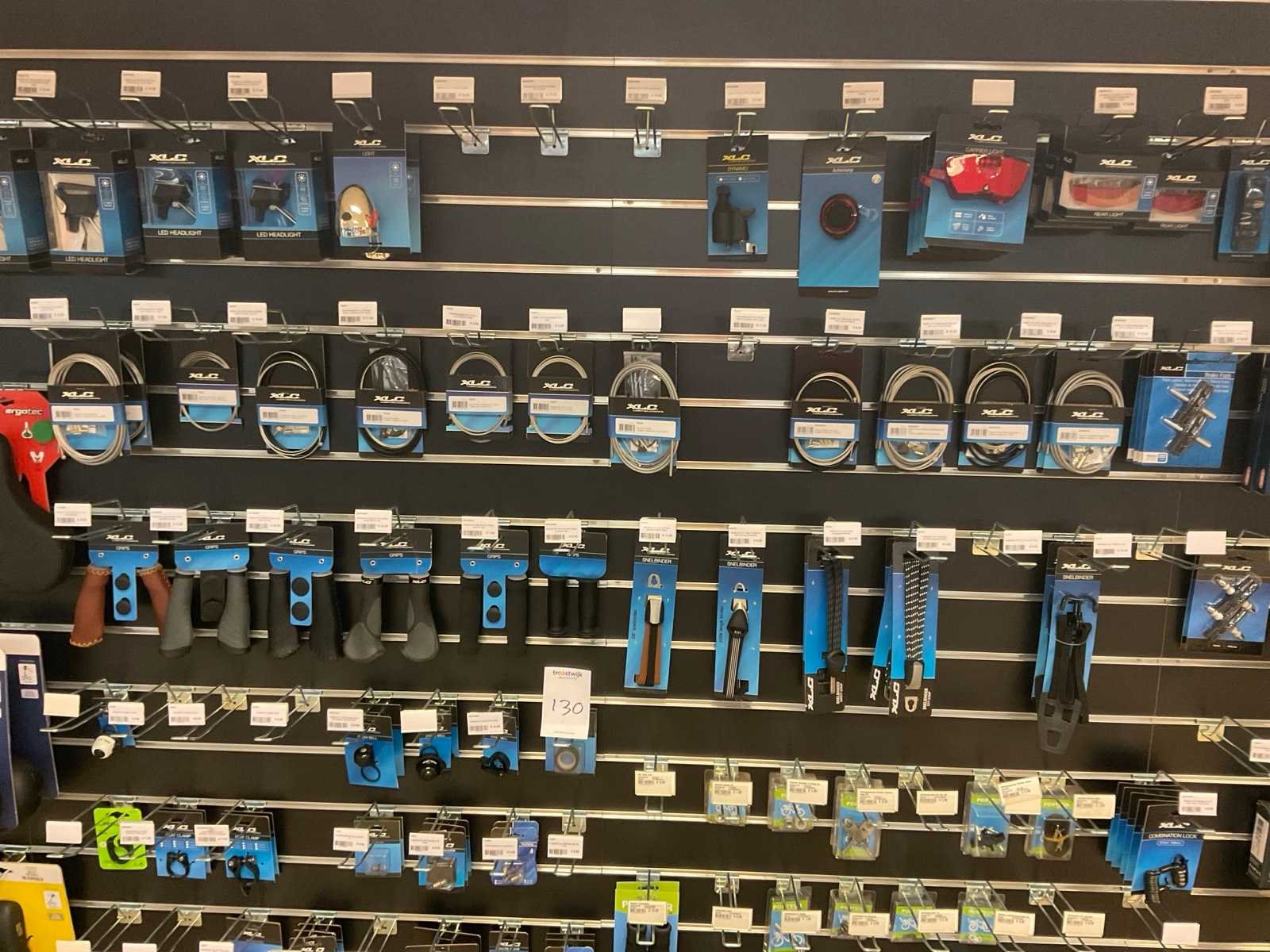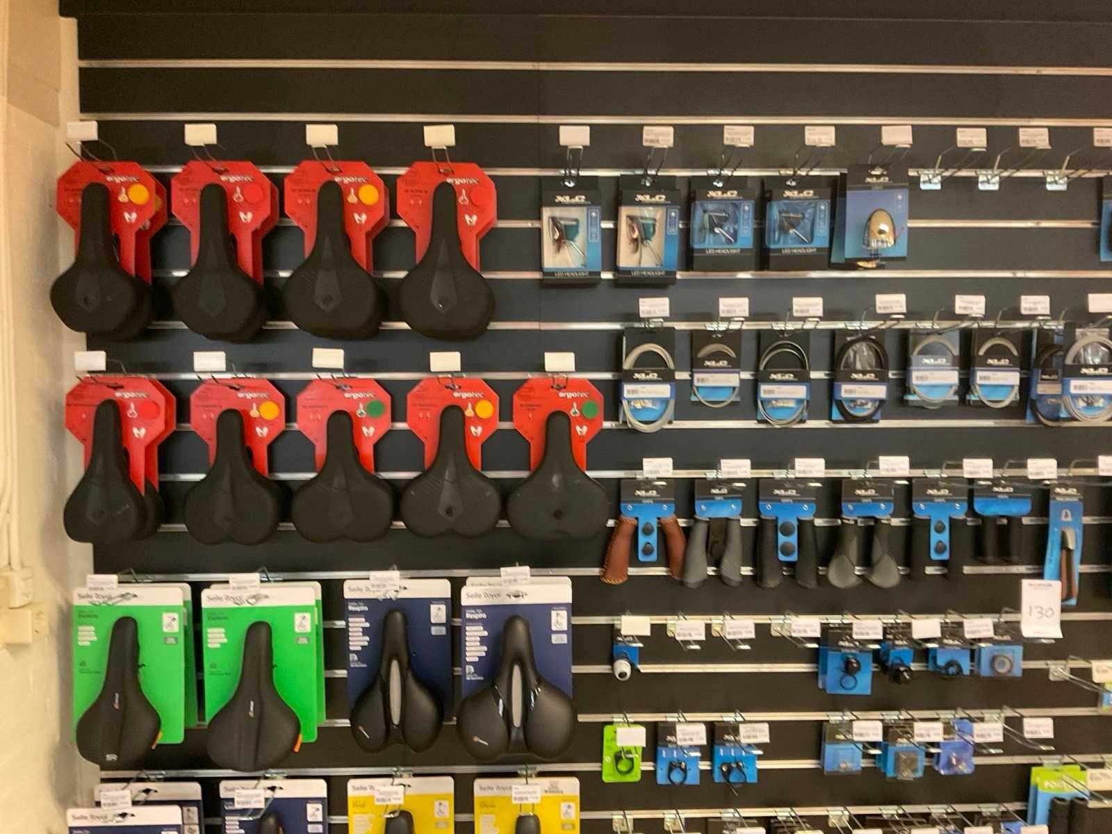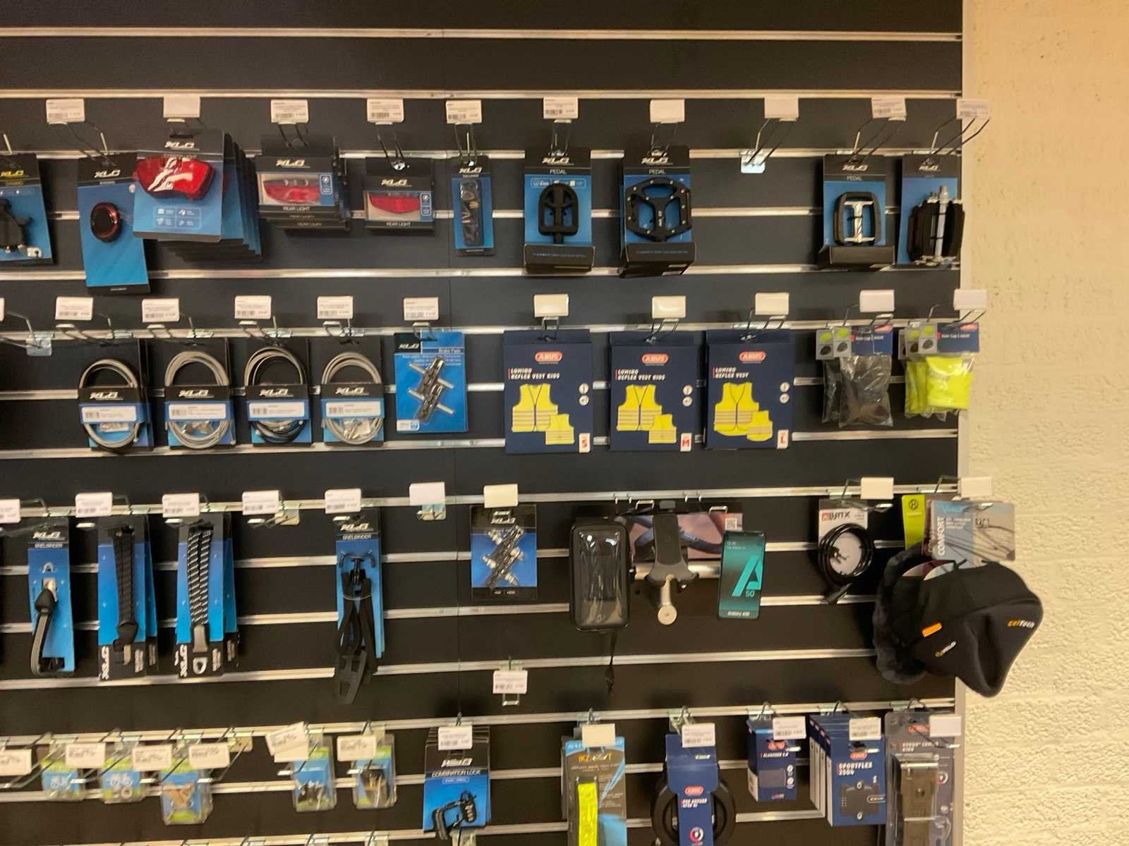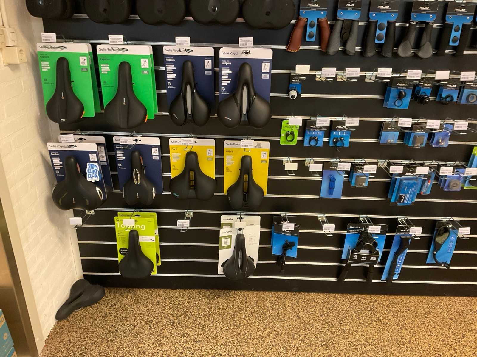 Grote partij fiets onderdelen aan wandstelling, incl wandstelling Merk: Selle royal,ABUS,XLC