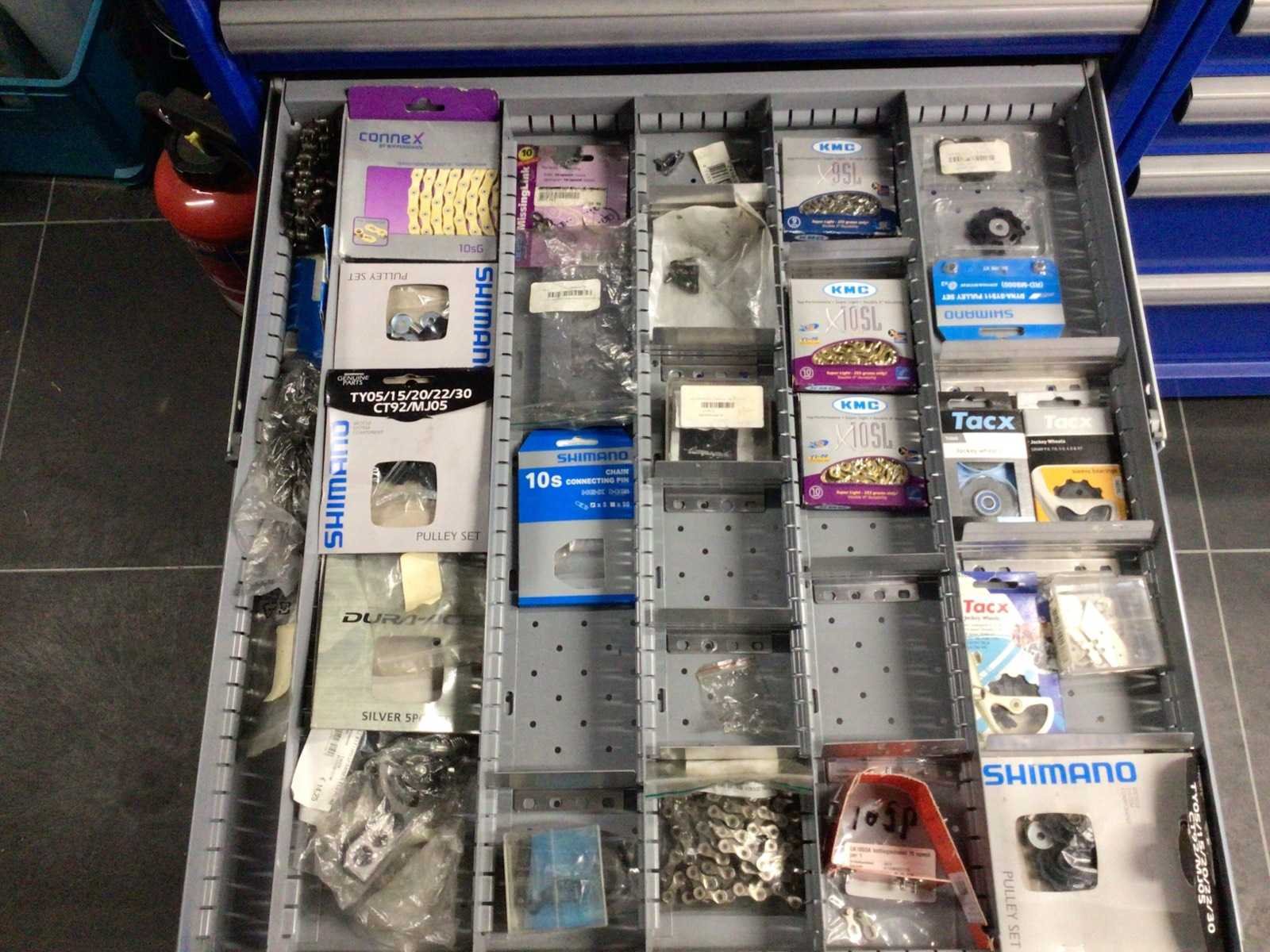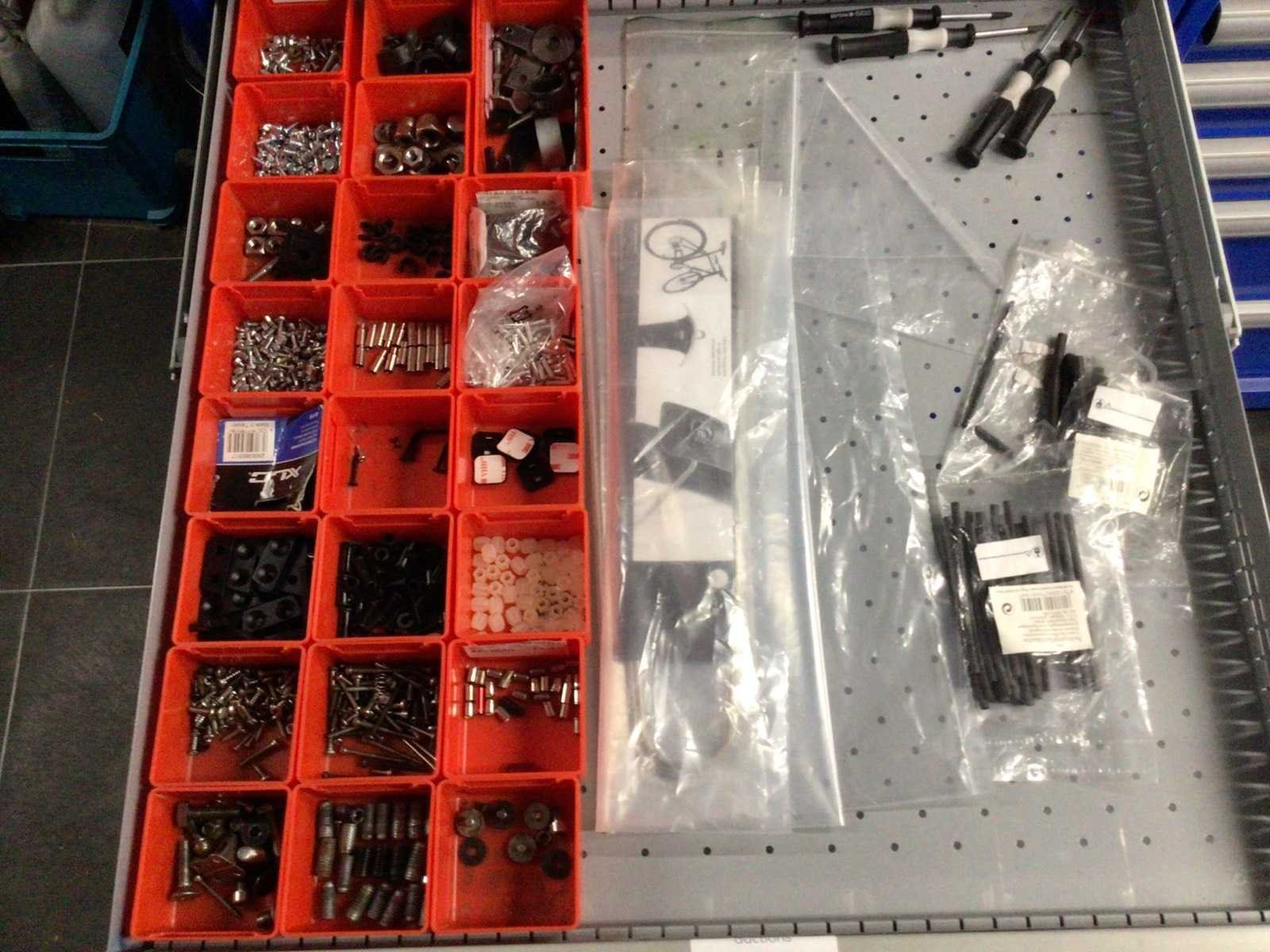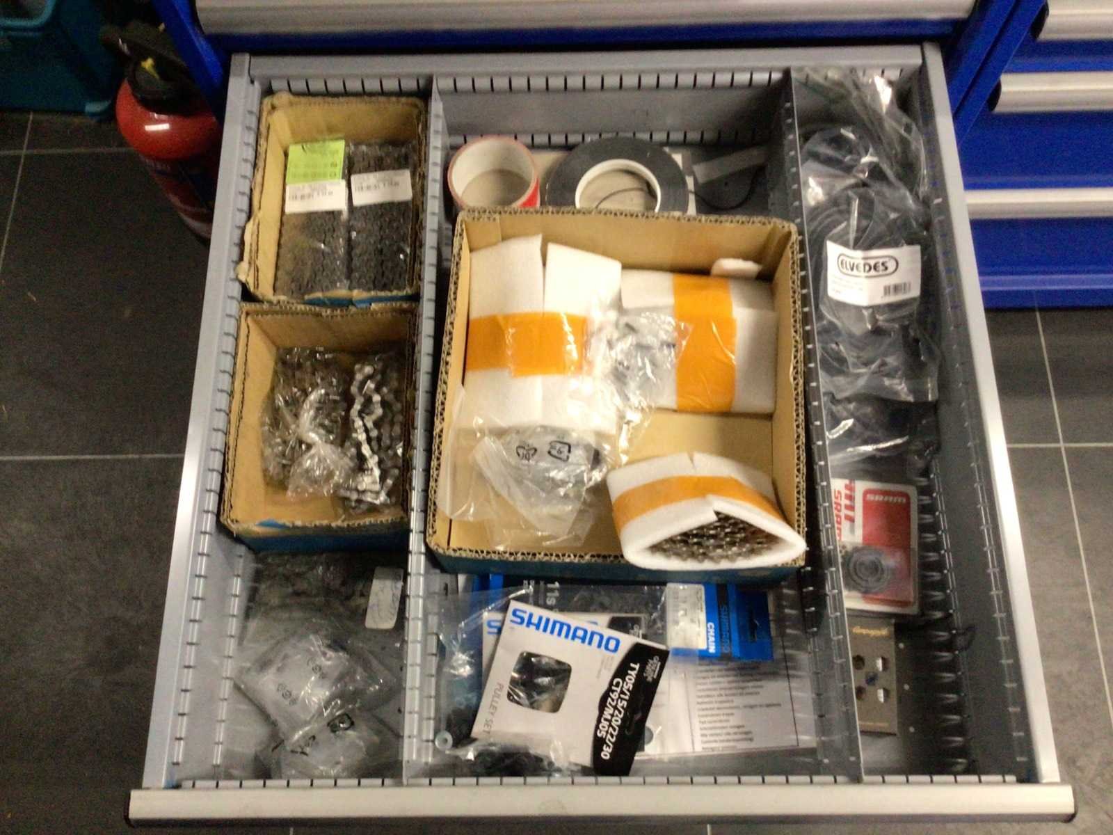 Partij fiets onderdelen in 6 laden, exclusief kast