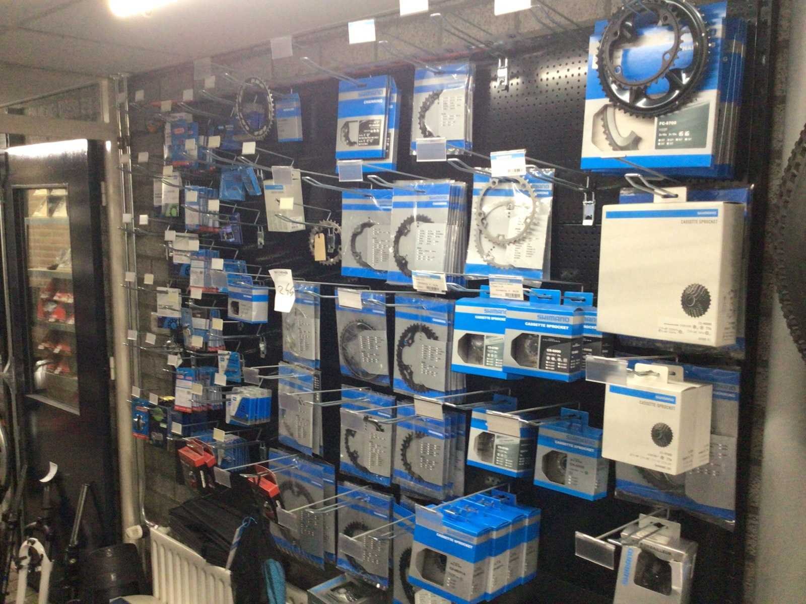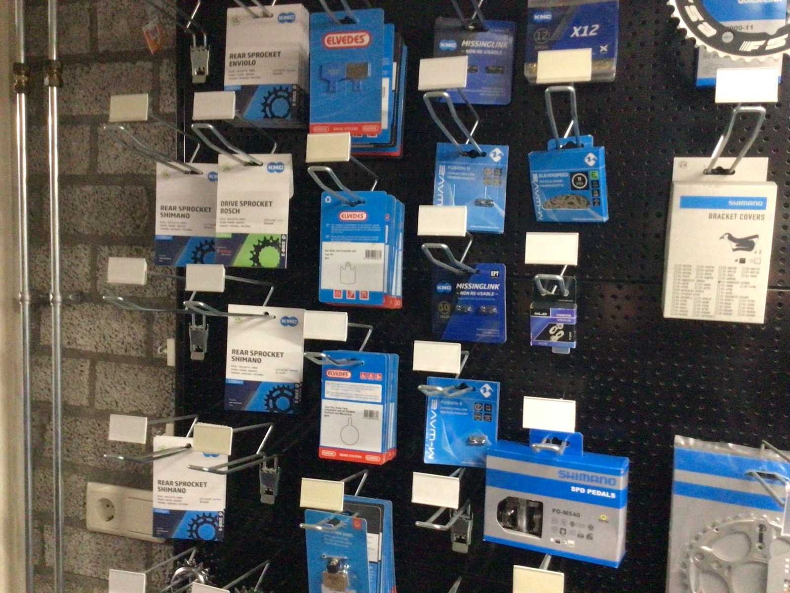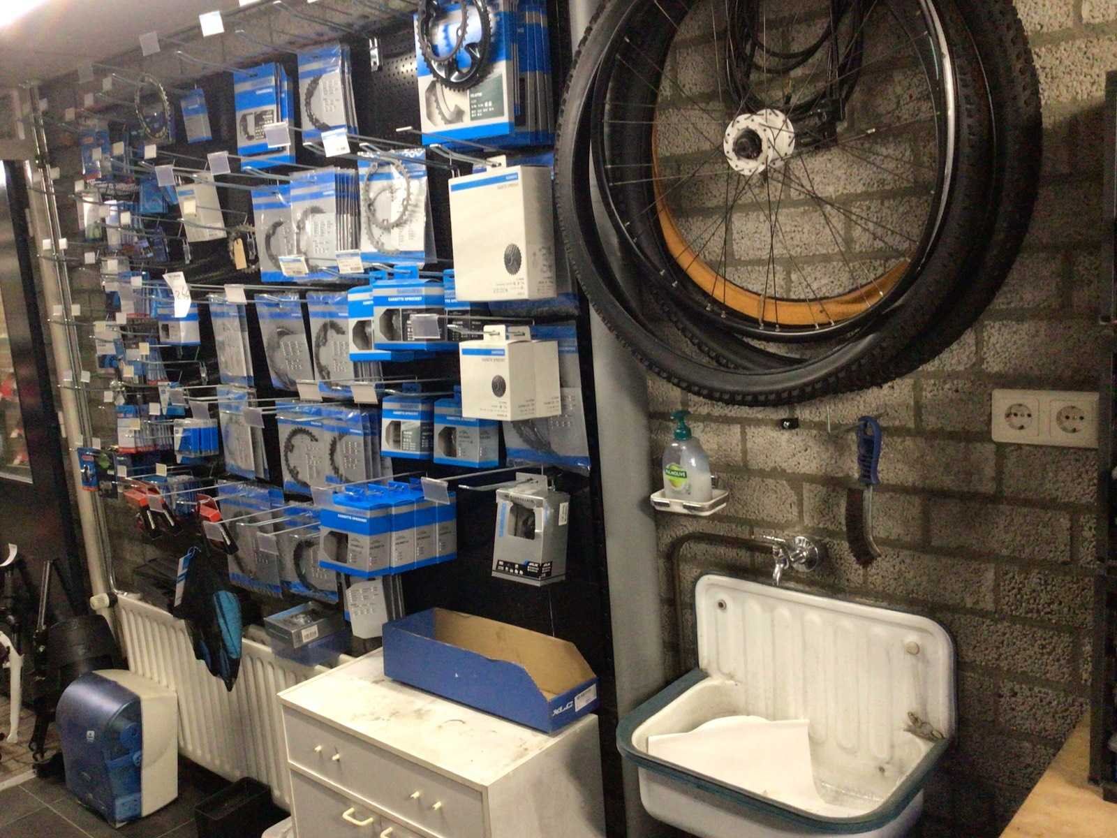 Partij fietsonderdelen op wandrek