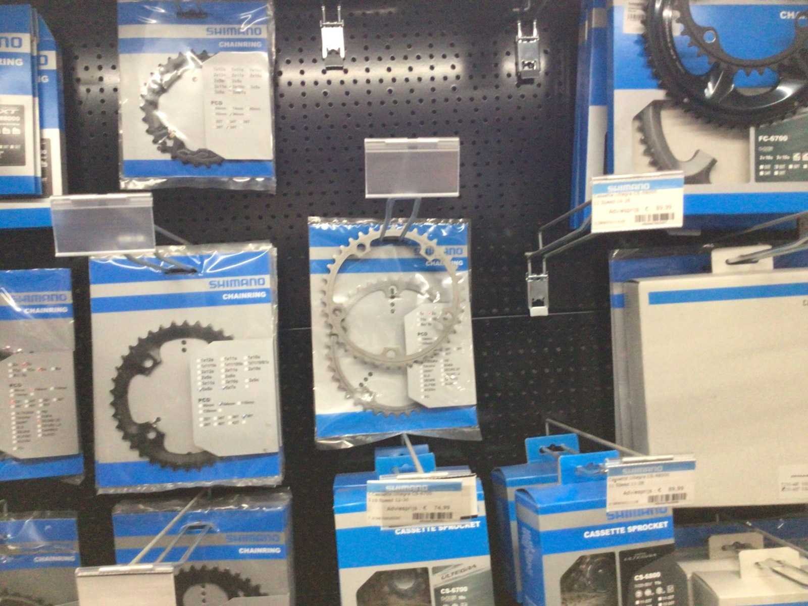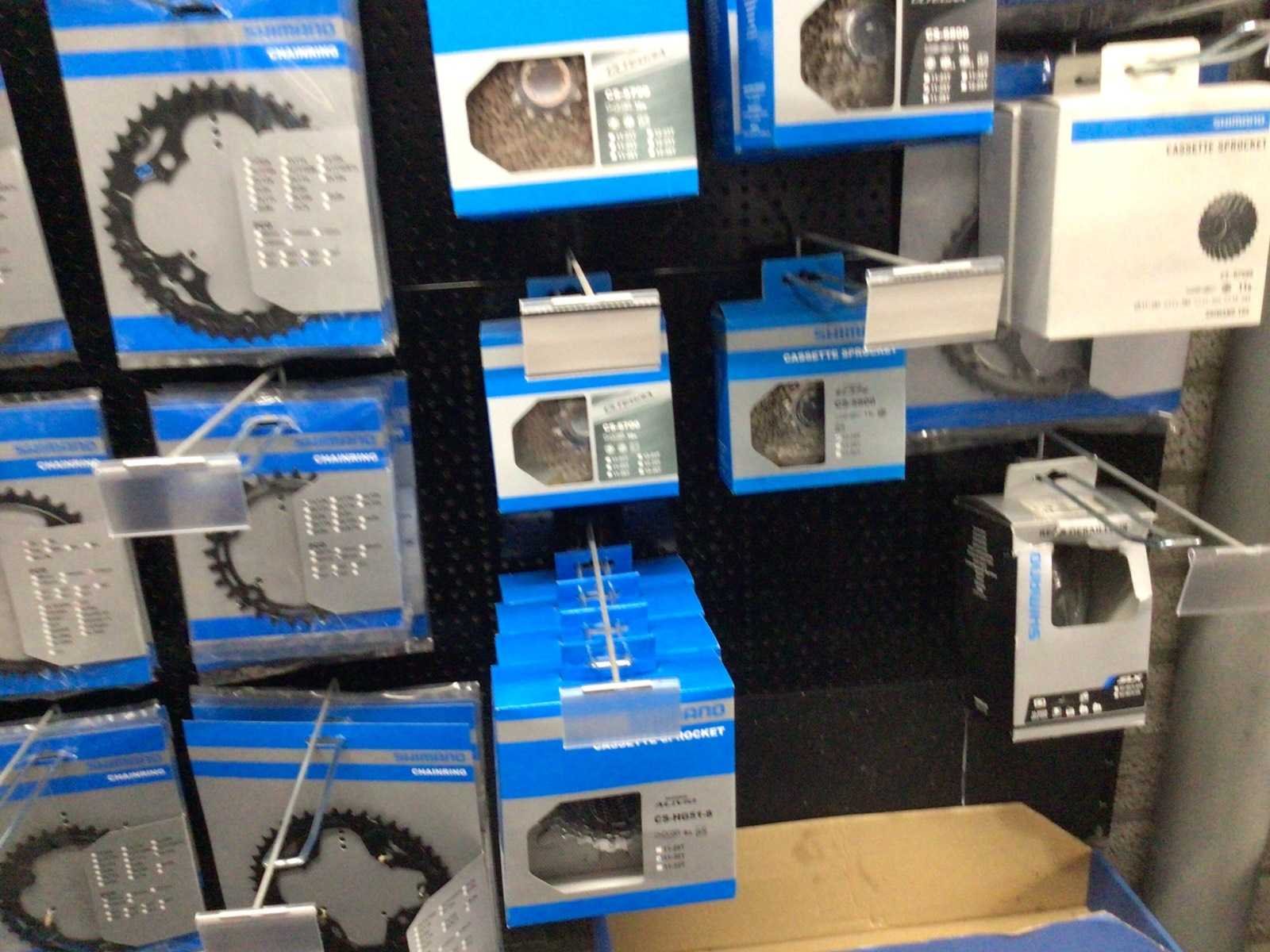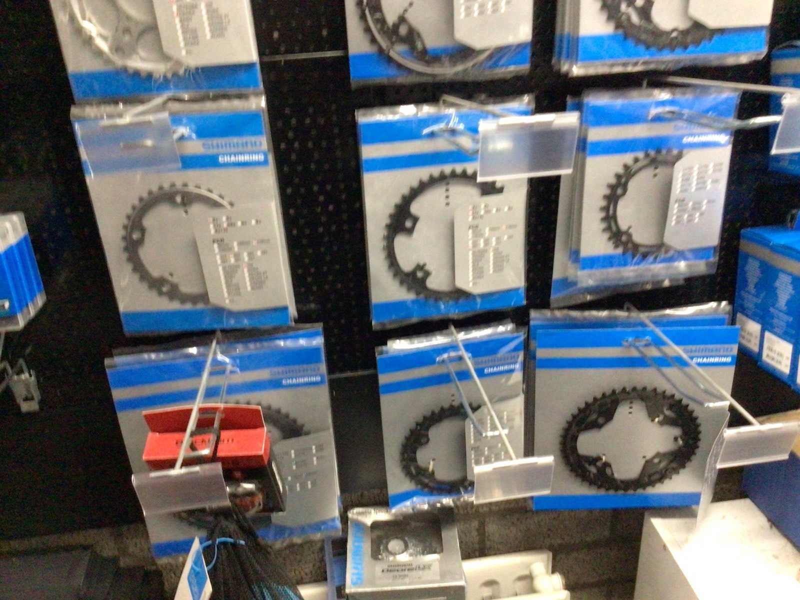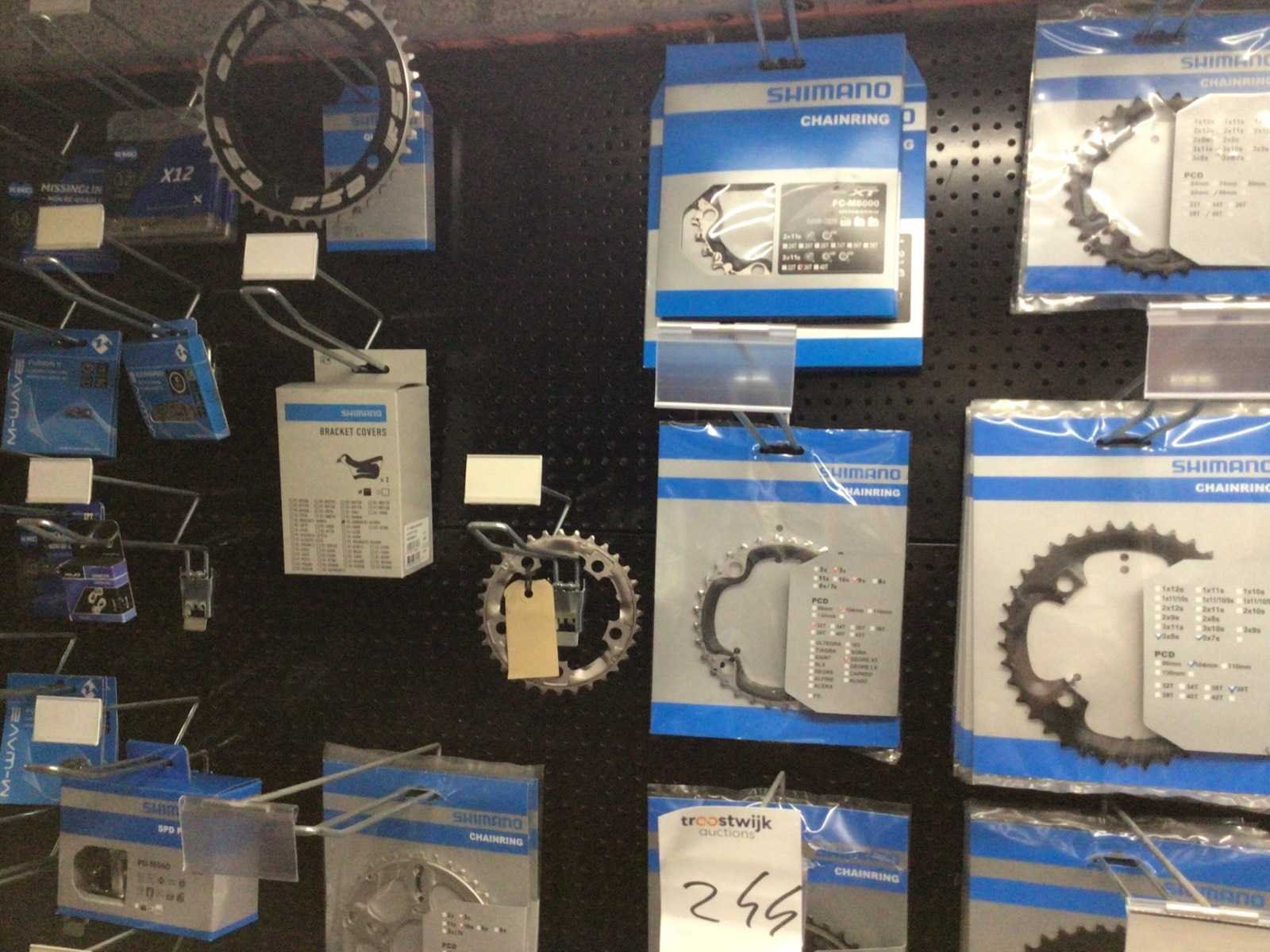 Partij fietsonderdelen op wandrek