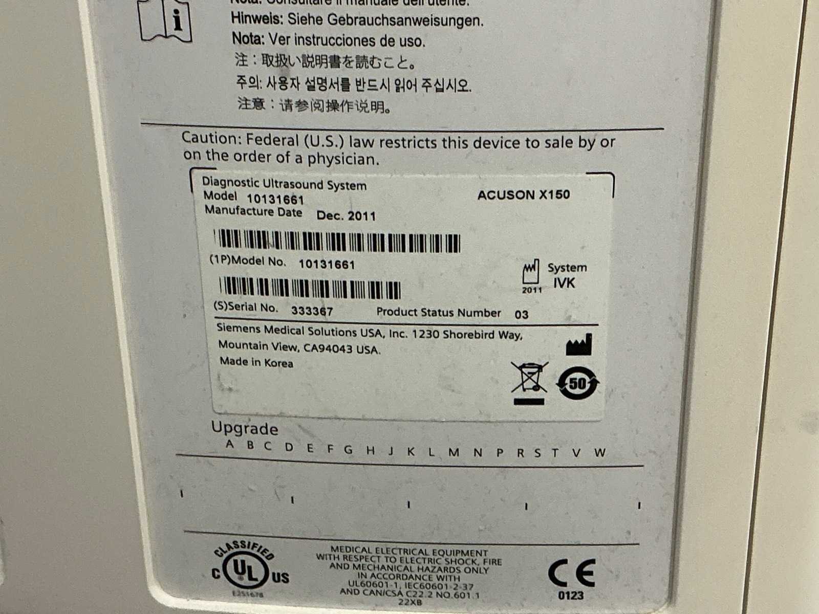 Echo apparaat Merk: Siemens Type: Acuson X150 Bouwjaar: 2011 Serienummer: S333367
