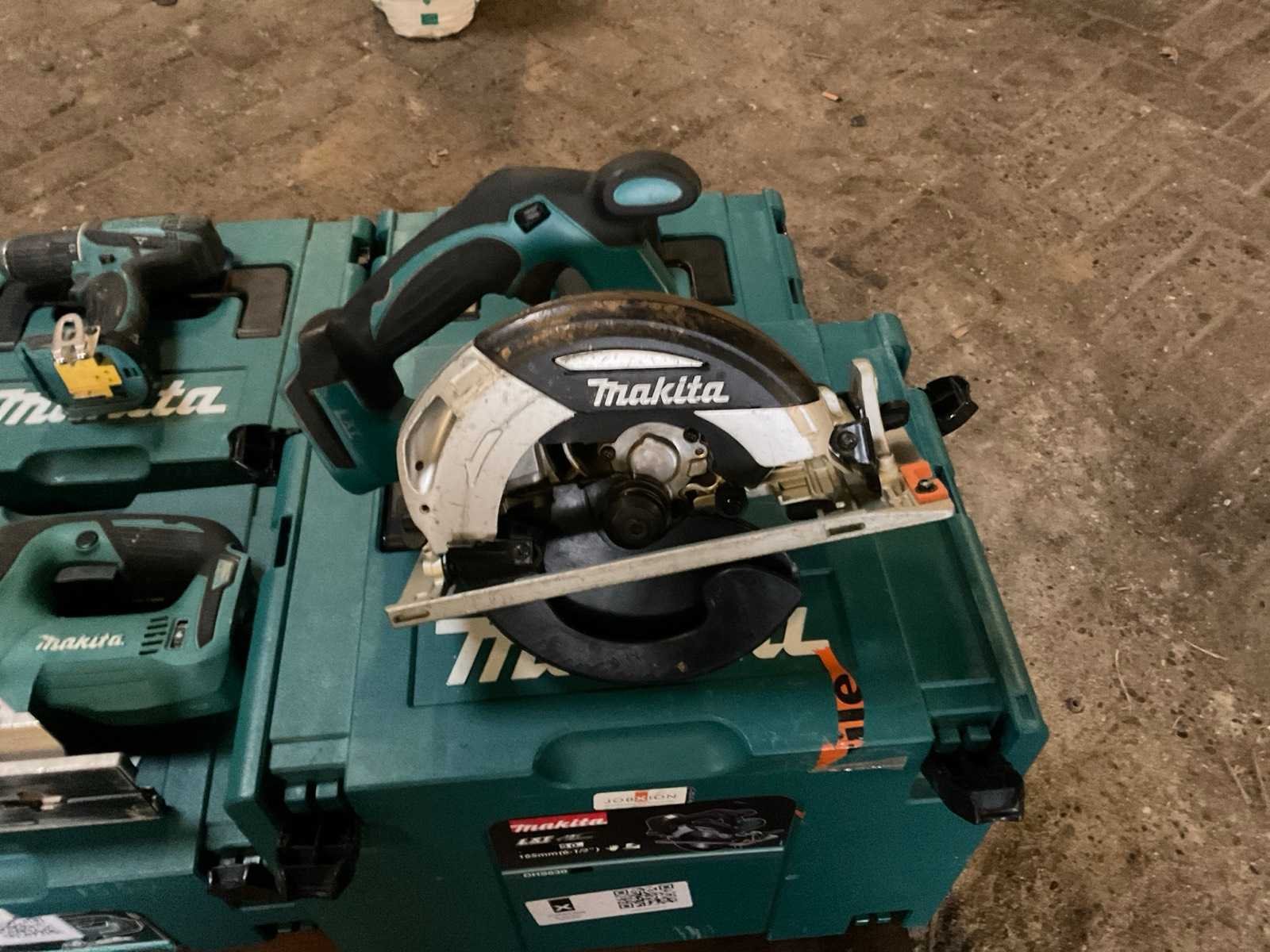 Waaronder: Makita haakse slijper, schroefboormachines, decoupeerzaag, handcirkelzaagmachine, 1x 18V accu, 1x acculader. Hikoki haakse slijper. Inclusief Snap-On pneumatische slagmoersleutel Merk: Makita Met koffer: true Accuspanning: 18V